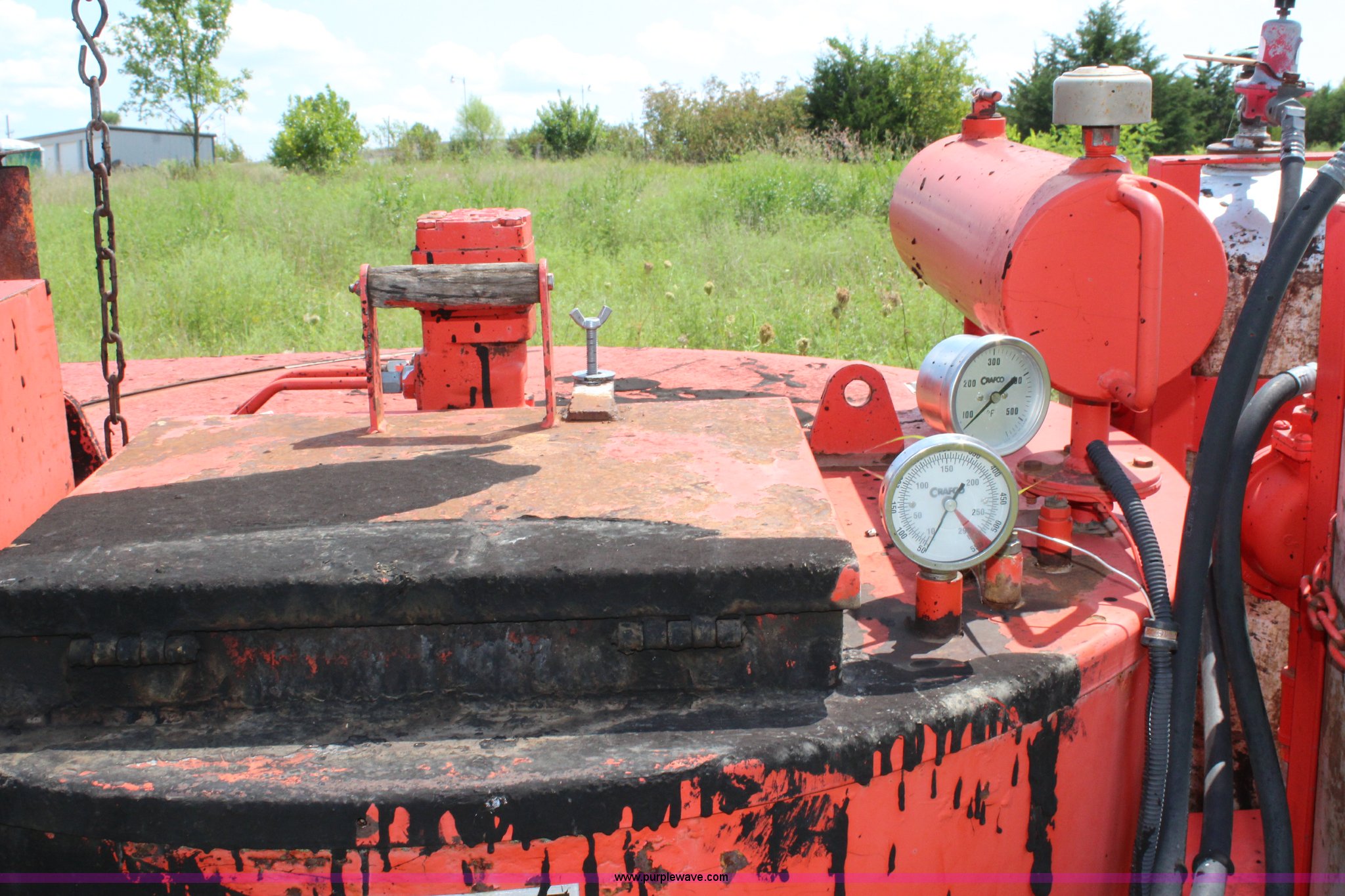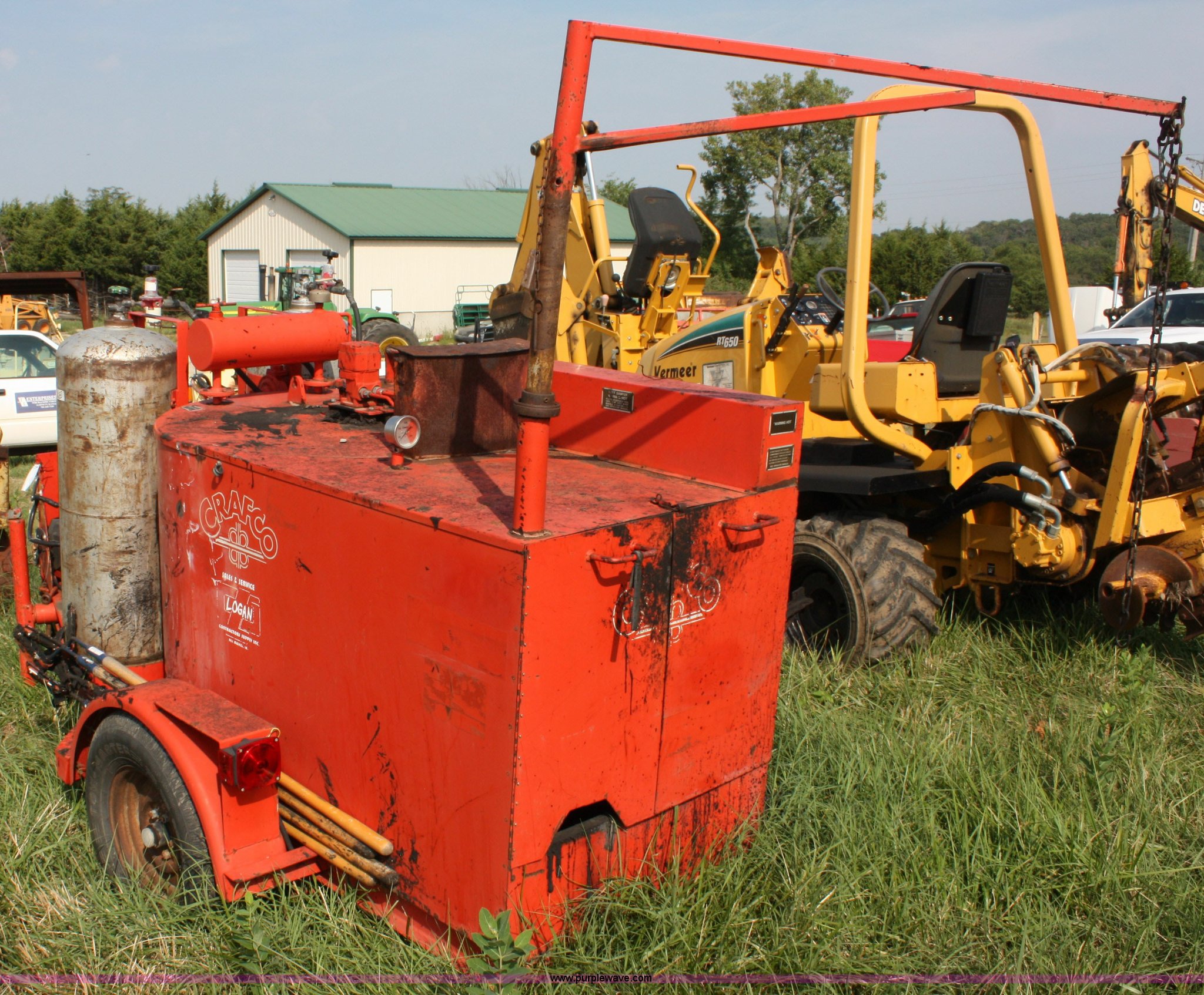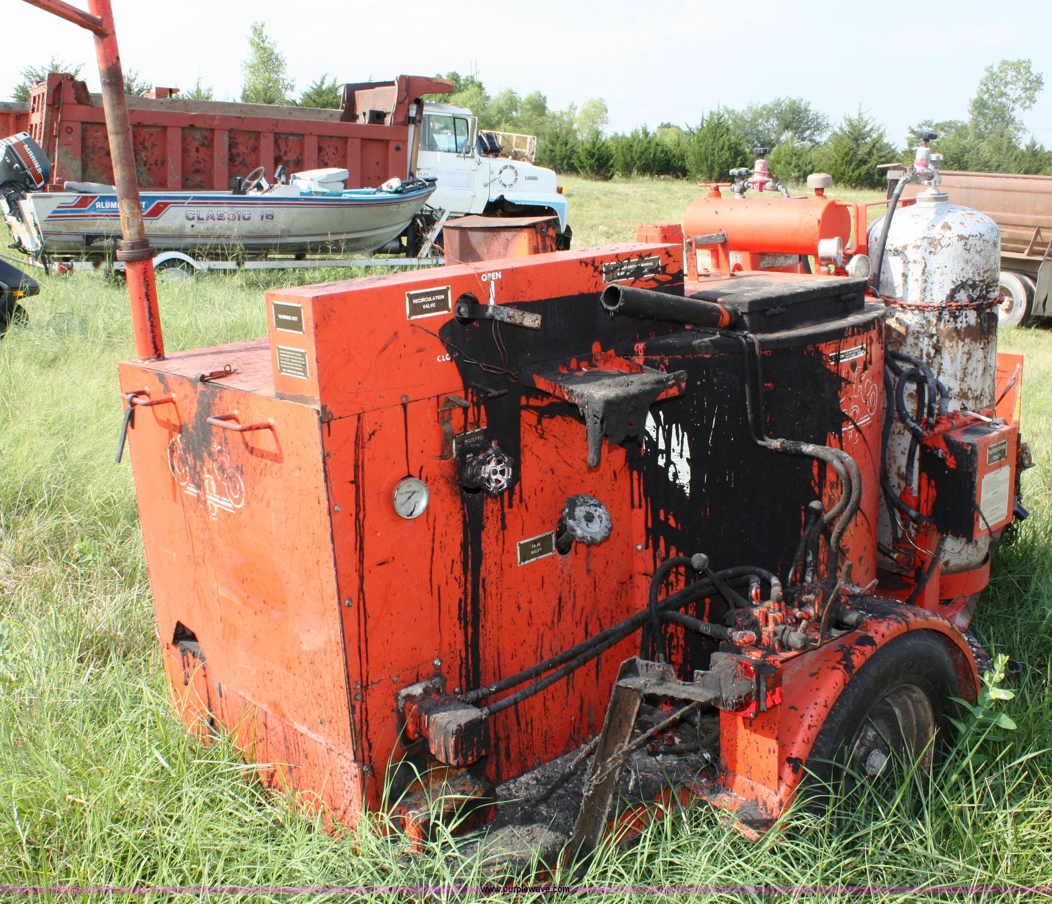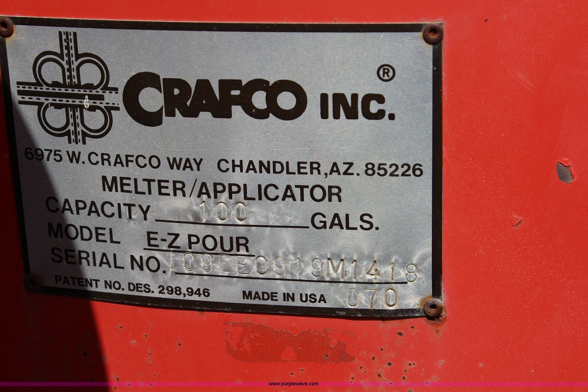 Purple Wave is selling a used Pot Hole Patcher in Kansas. This item is a Crafco EZ Pour melter/applicator with the following: Onan Elite 125 gas engine, Electric start, 100 gallon capacity, (2) 100 lbs propane bottles, 2 5/16" ball hitch, 215/75R14 tires, Unknown operating condition