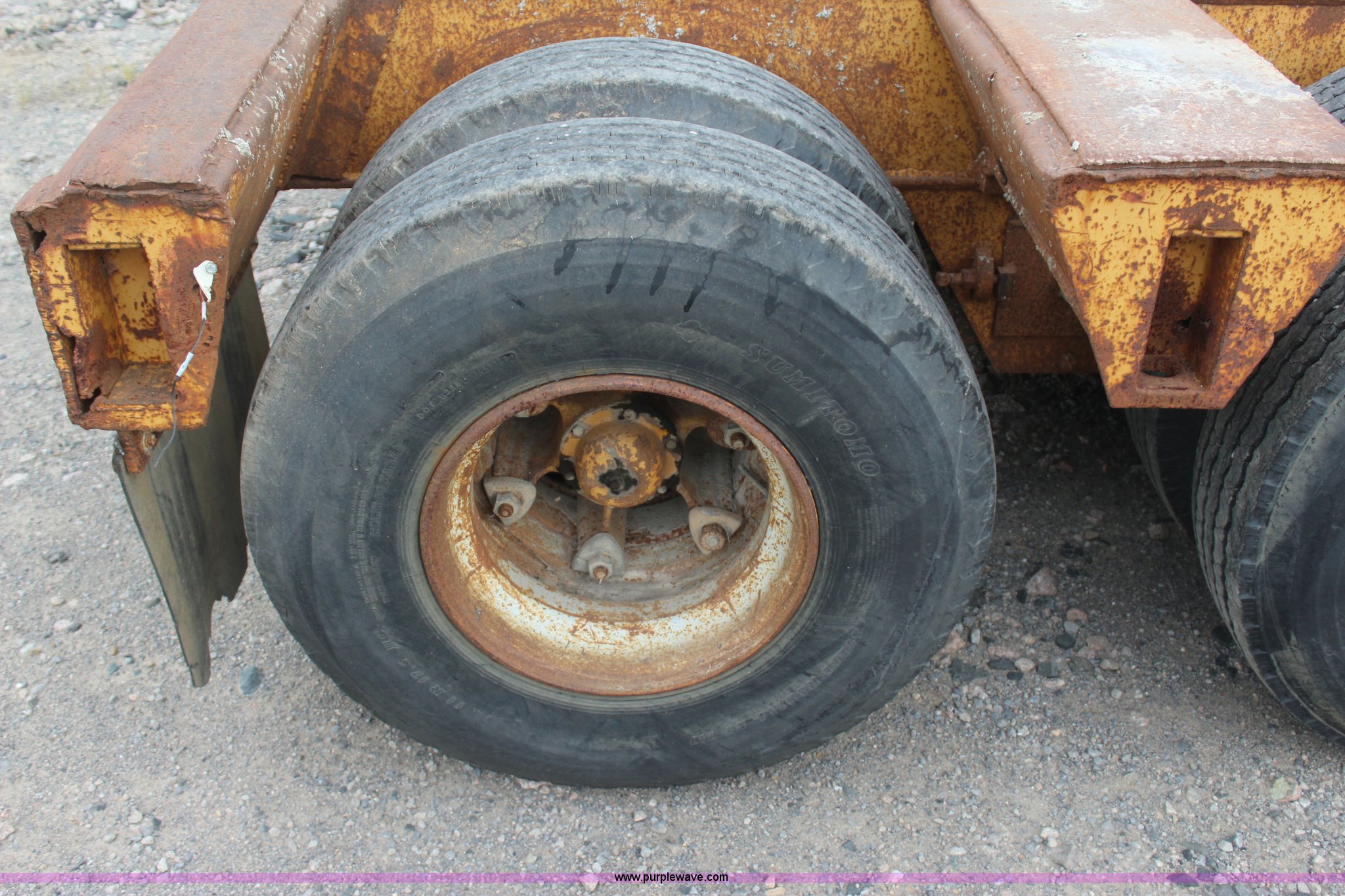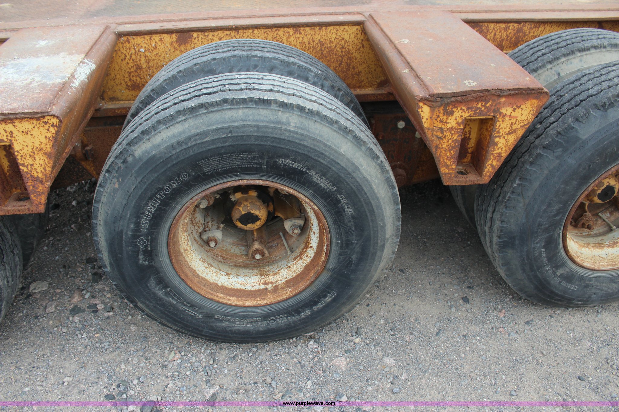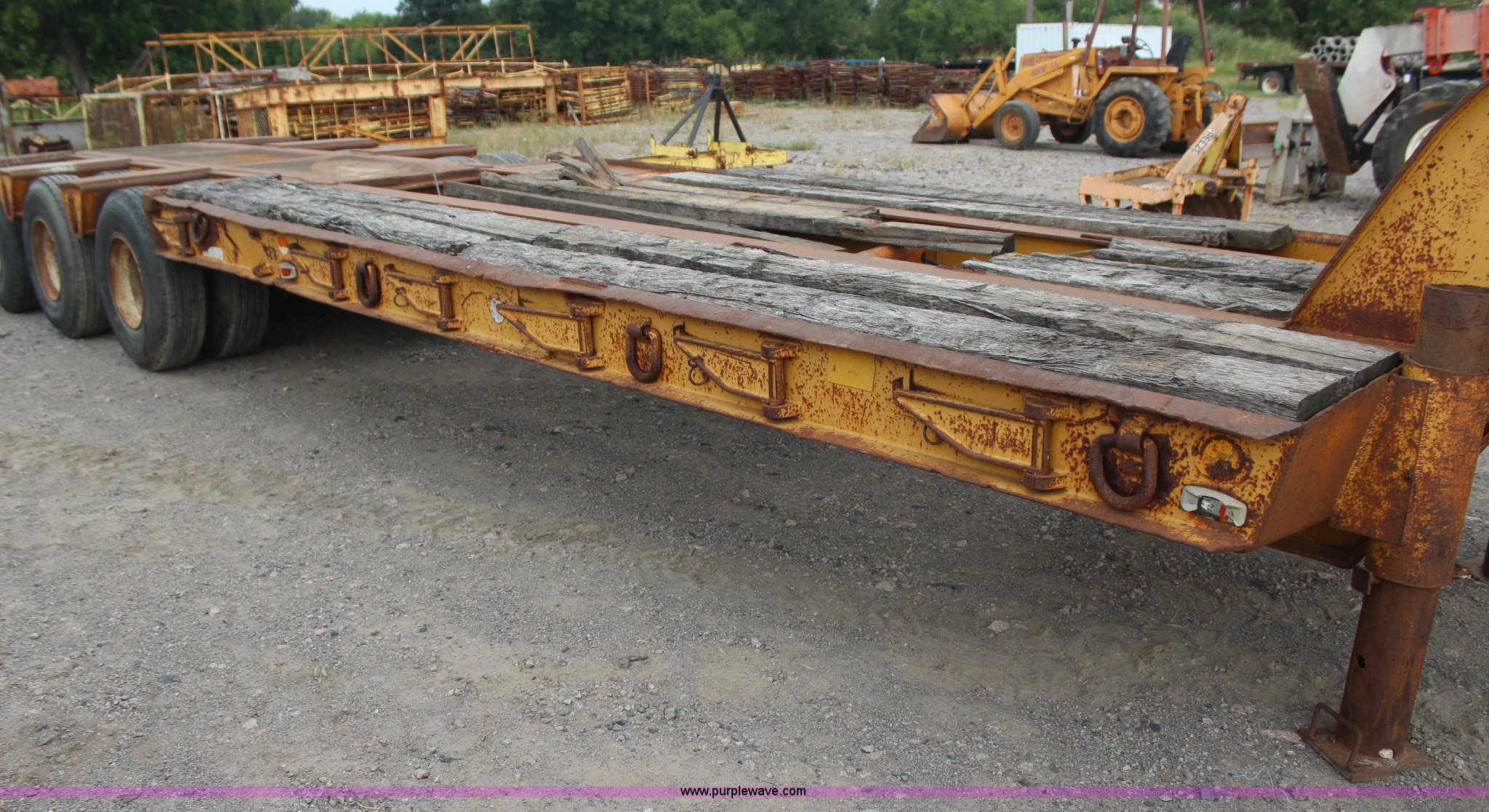 Purple Wave is selling a used Equip. Trailer in Oklahoma. This item is a 1967 Hyster equipment trailer with the following: 28'L x 8'W wood deck, 8'4"L neck, (4) D-ring tie downs per side, (6) outriggers, 14", Jack stand, Walking beam suspension, Air brakes, 11R17.5 tires, Unit# 14-87