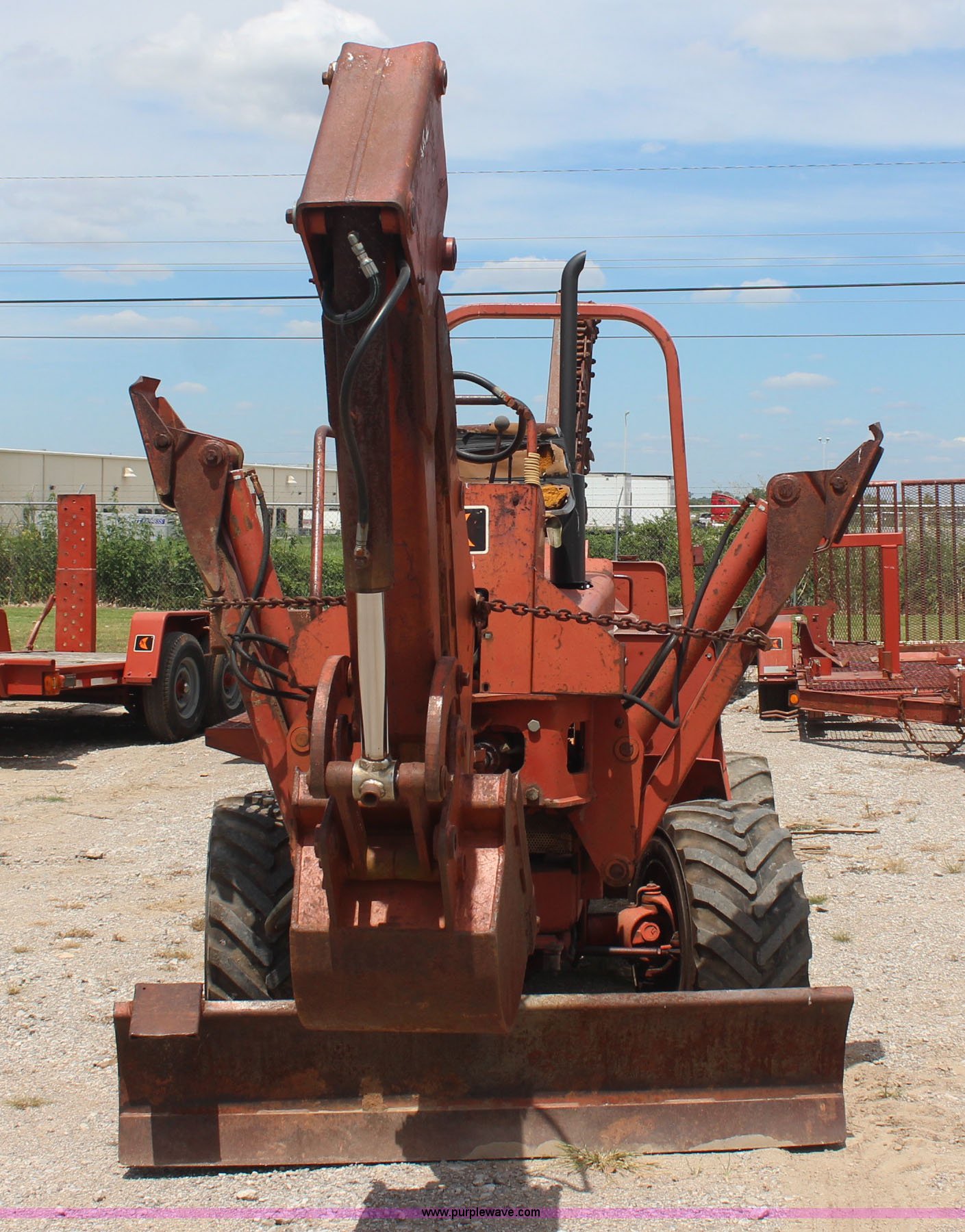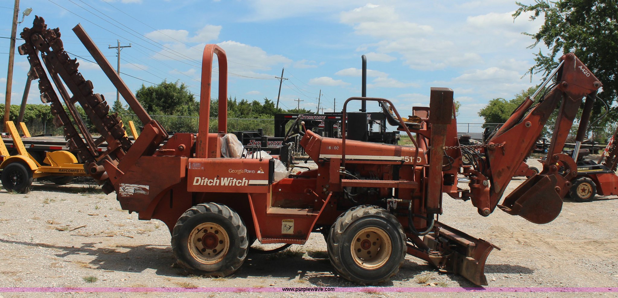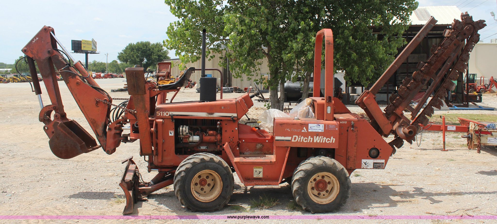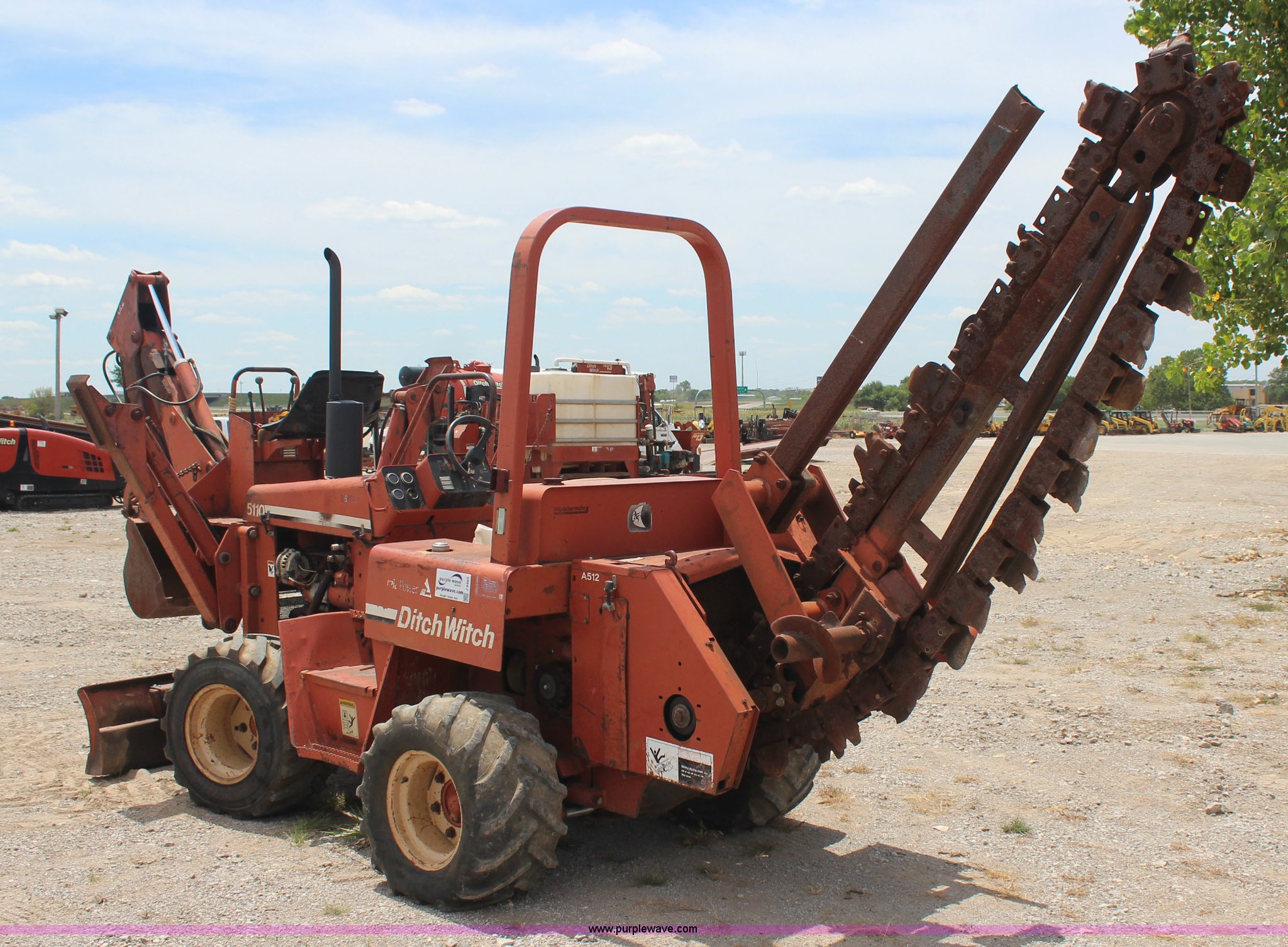 Purple Wave is selling a used Trencher or Rock Saw in Oklahoma. This item is a 1994 Ditch Witch 5110 trencher with the following: Deutz F3L912 diesel engine, Four speed transmission, Two post ROPS, A512 trencher attachment, 5' trencher boom, 6"W trench, Dirt and rock chain, 48" pin to pin, Restraint bar, A420 backhoe attachment, Serial 1D0227, 18"W bucket, Six way back fill blade, 6'W, 31 x 15.5-15 NHS tires, Recently replaced seat, Serial 5L0455
