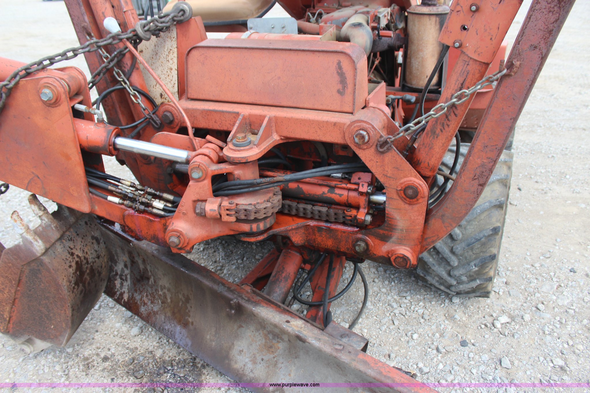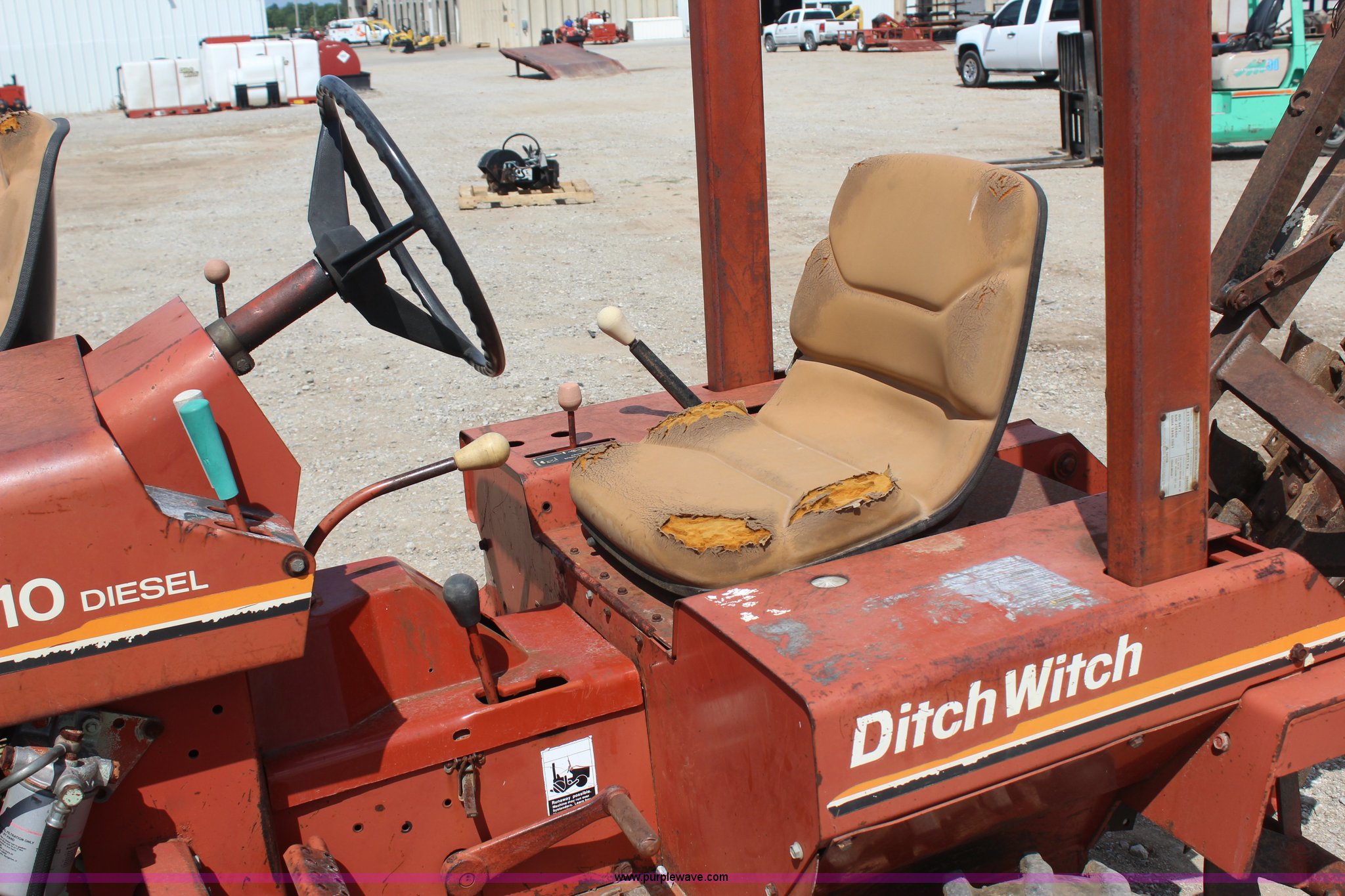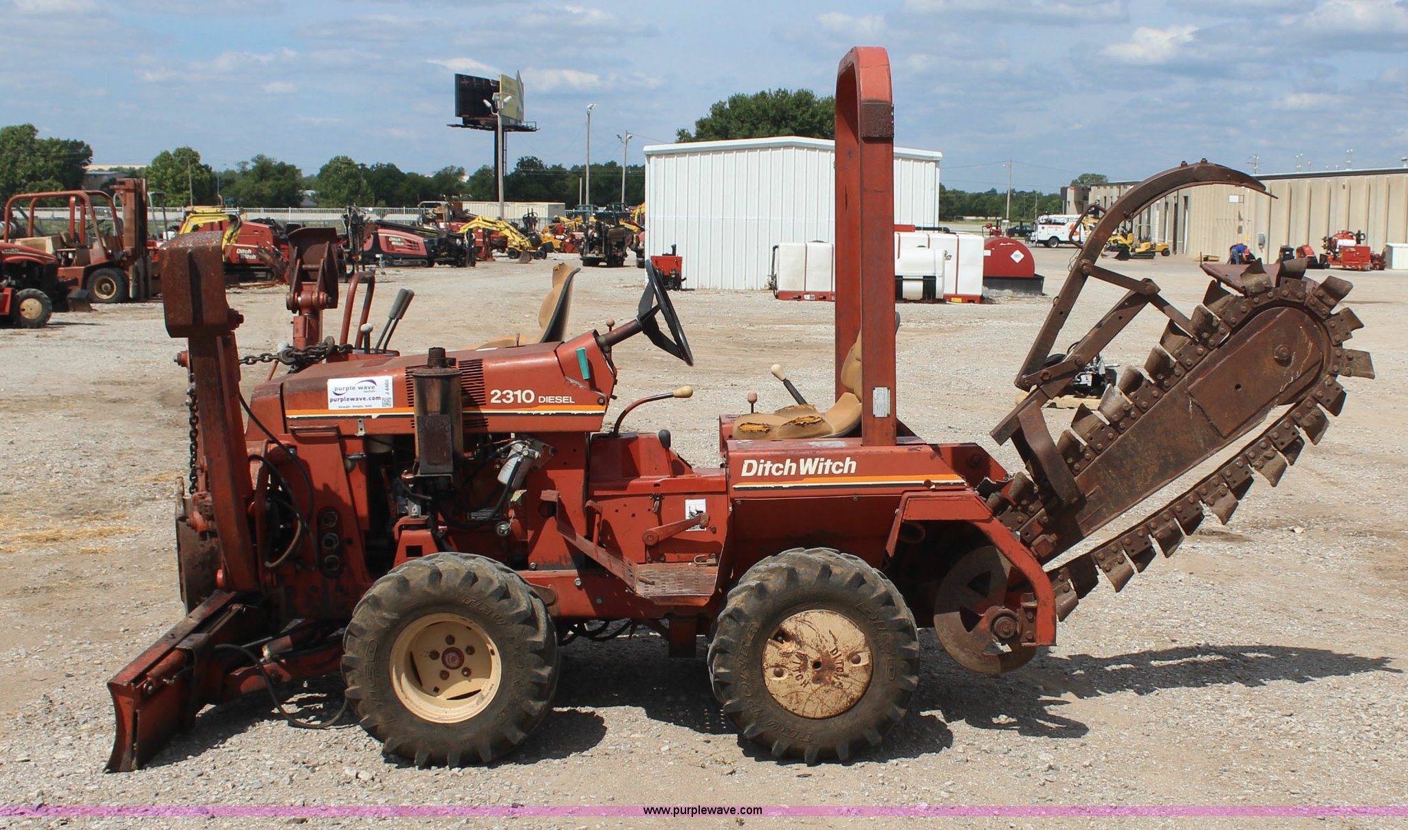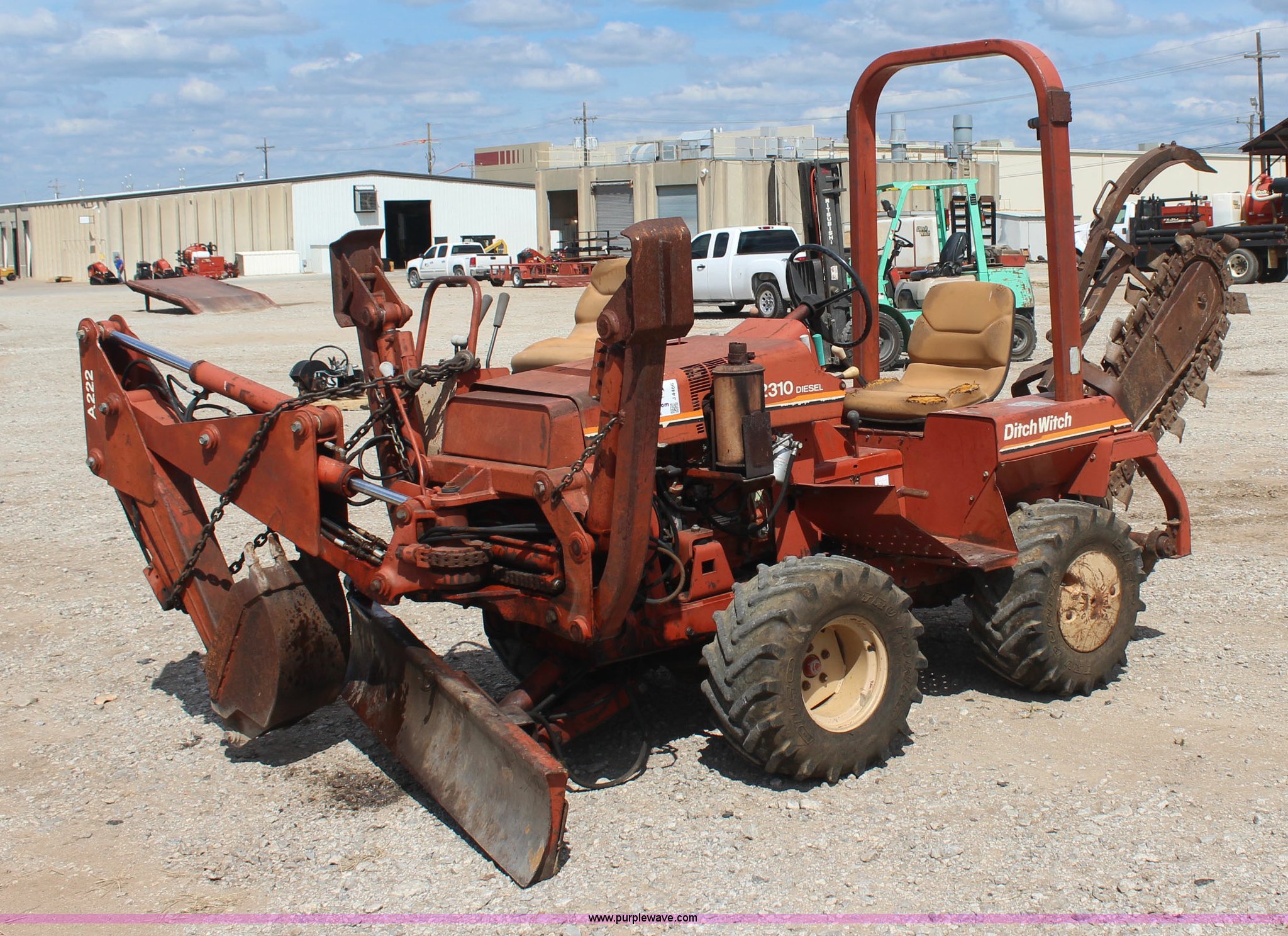Purple Wave is selling a used Trencher or Rock Saw in Oklahoma. This item is a 1989 Ditch Witch 2310DD trencher with the following: 3,747 hours on meter, Deutz F2L511 diesel engine, Three speed manual transmission, ROPS, 4'L trenching boom, Dirt chain, Front mounted auxiliary hydraulics, A222 backhoe attachment, Controller, 13"W four tooth bucket, 57.5"W back fill blade, Trench cleaning bar, Rear wheel weights, 26 x 12.00 NHS tires, Serial 3F0625