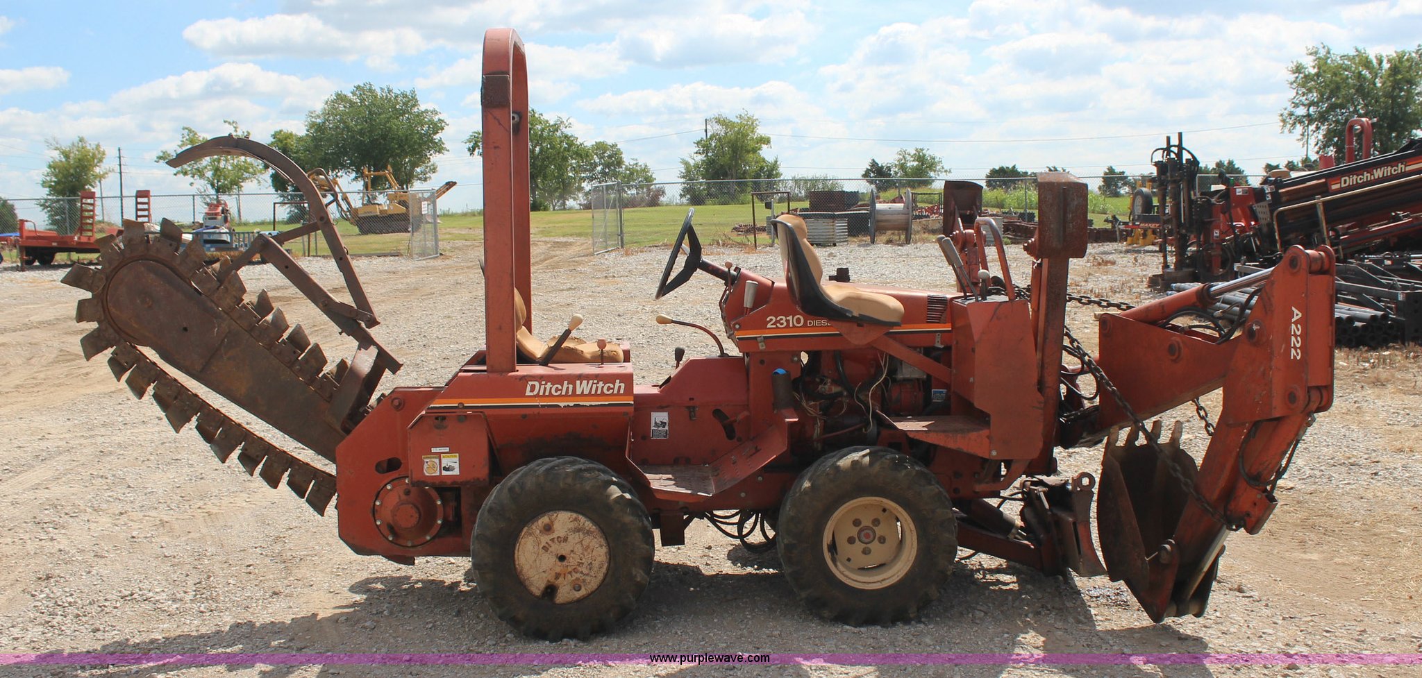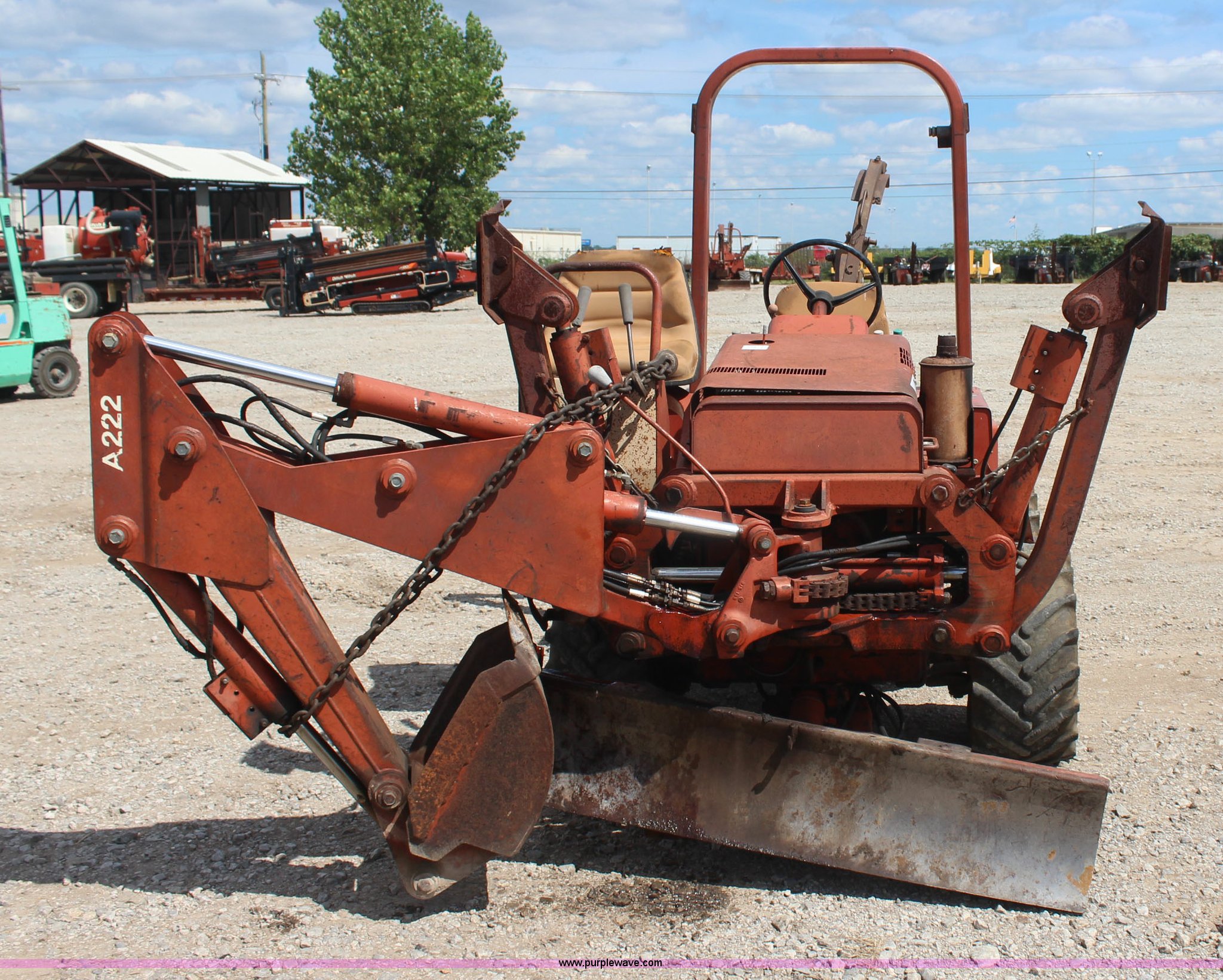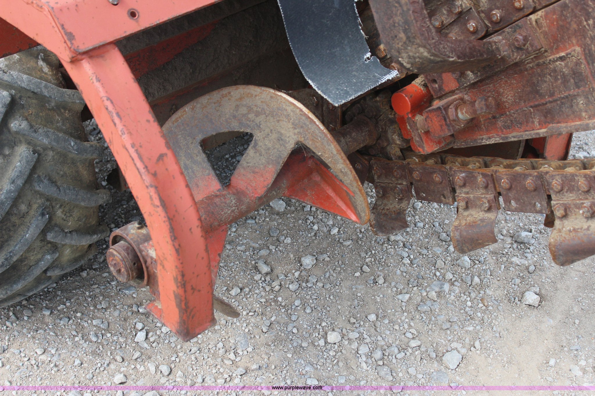 Purple Wave is selling a used Trencher or Rock Saw in Oklahoma. This item is a 1989 Ditch Witch 2310DD trencher with the following: 3,747 hours on meter, Deutz F2L511 diesel engine, Three speed manual transmission, ROPS, 4'L trenching boom, Dirt chain, Front mounted auxiliary hydraulics, A222 backhoe attachment, Controller, 13"W four tooth bucket, 57.5"W back fill blade, Trench cleaning bar, Rear wheel weights, 26 x 12.00 NHS tires, Serial 3F0625