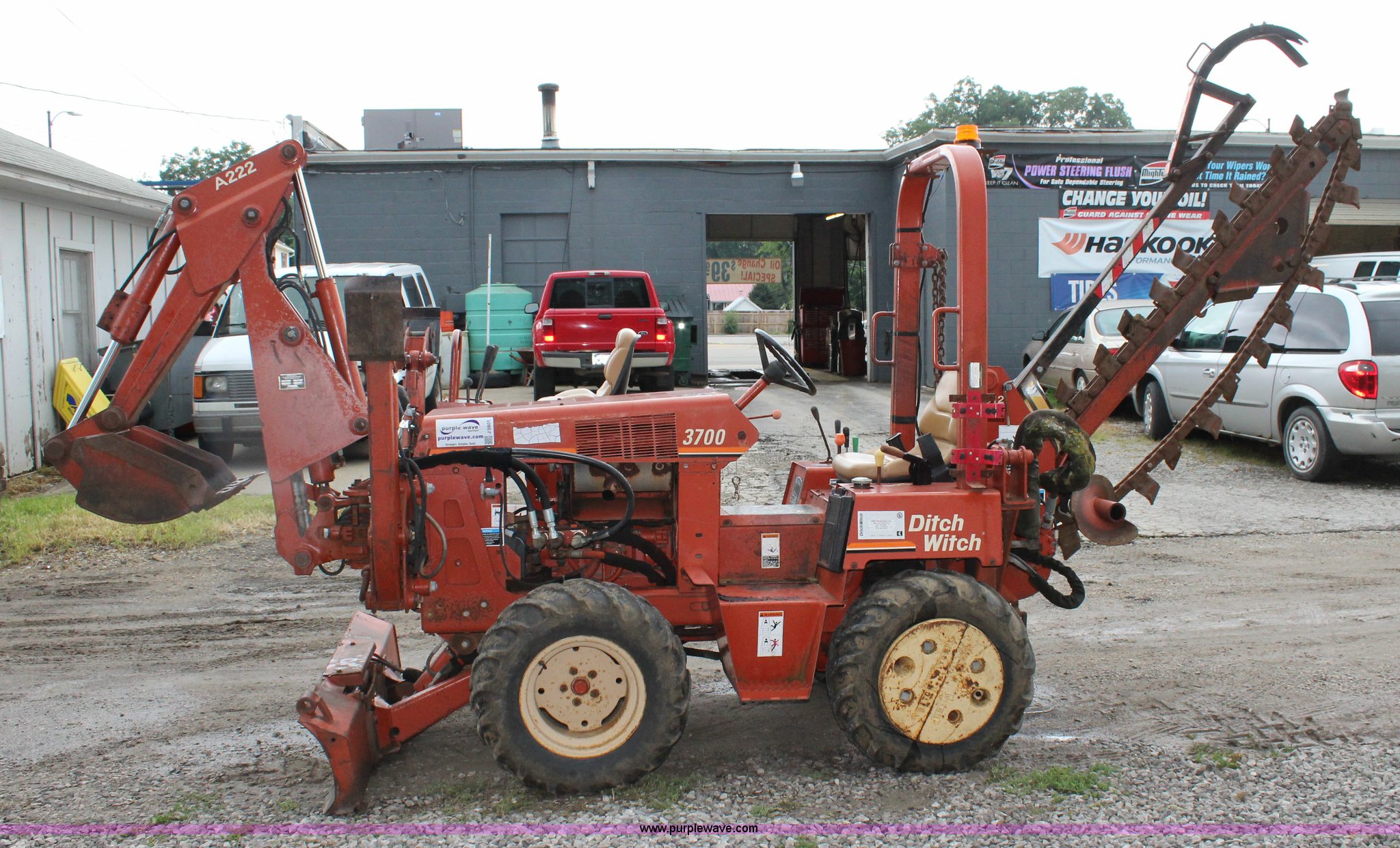 1997 Ditch Witch 3700DD trencher. 932 hours on meter, Deutz three cylinder diesel engine, Hydrostatic transmission, H312 trencher attachment 6' maximum digging depth, Side shift, A222 backhoe attachment 18"W, Serial 7P2980, 64"W back fill blade, Hydraulic bore drive included, Rear wheel weights, 29 x 12.50-15 tires, Serial 3P1054. View equipment video. ALS Inc.. Gardner, KS 66030
