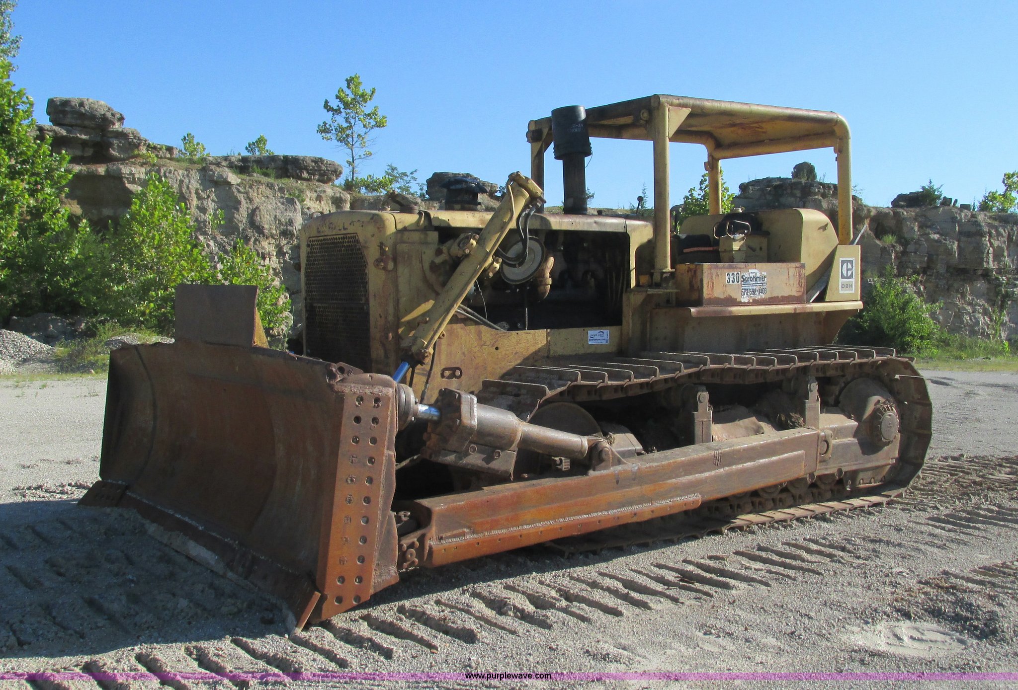 Purple Wave is selling a used Crawler Dozer in Missouri. This item is a 1967 Caterpillar D8H dozer with the following: Caterpillar six cylinder turbo diesel engine, Powershift transmission, 3F-3R gears, Canopy, Clutch brake steering, 152" S-dozer blade, Tilt, Four piece bolt-on cutting edge, Seven bottom rollers, SALT undercarriage, 28"W single grouser track pads, 64,710 lbs. base operating weight, No engine covers, Right blade cylinder leaking, Right carrier bearing is out, Alternator belt missing, Unit must be jump started, Serial 46A15246