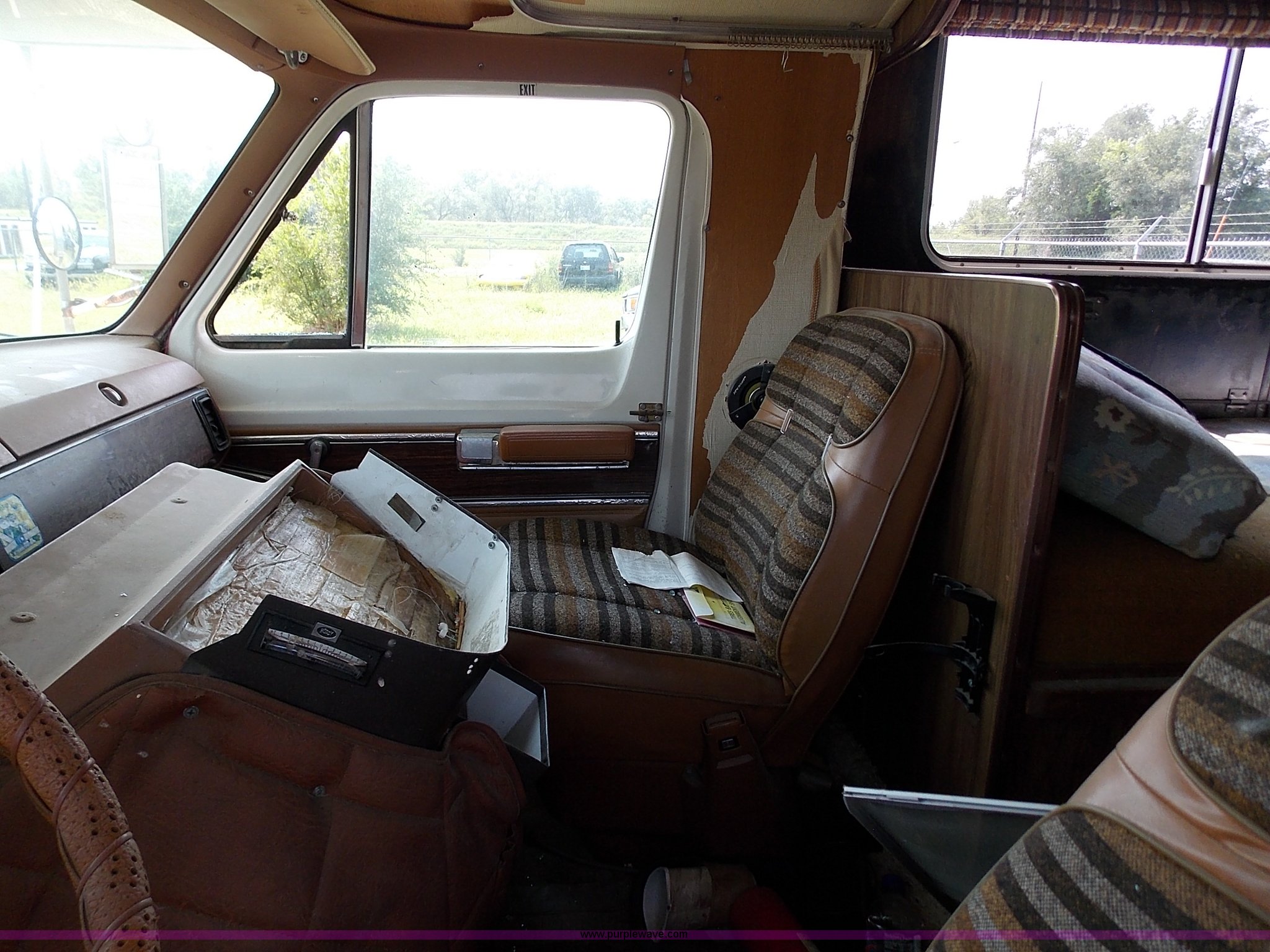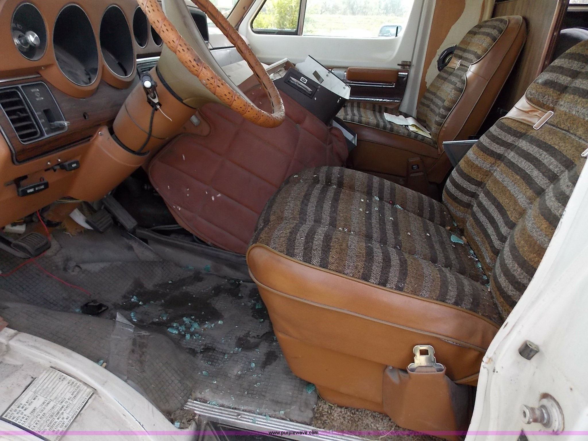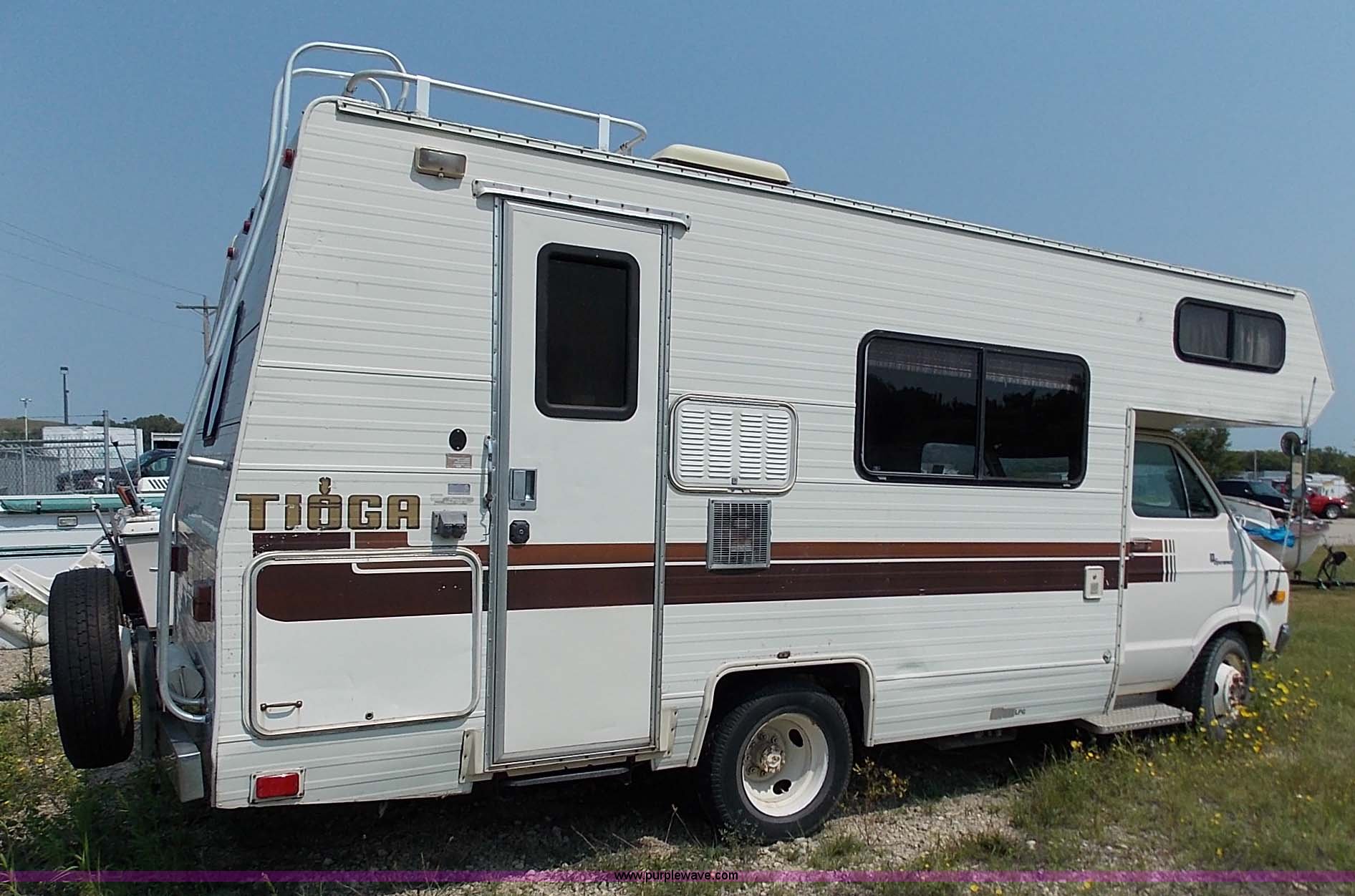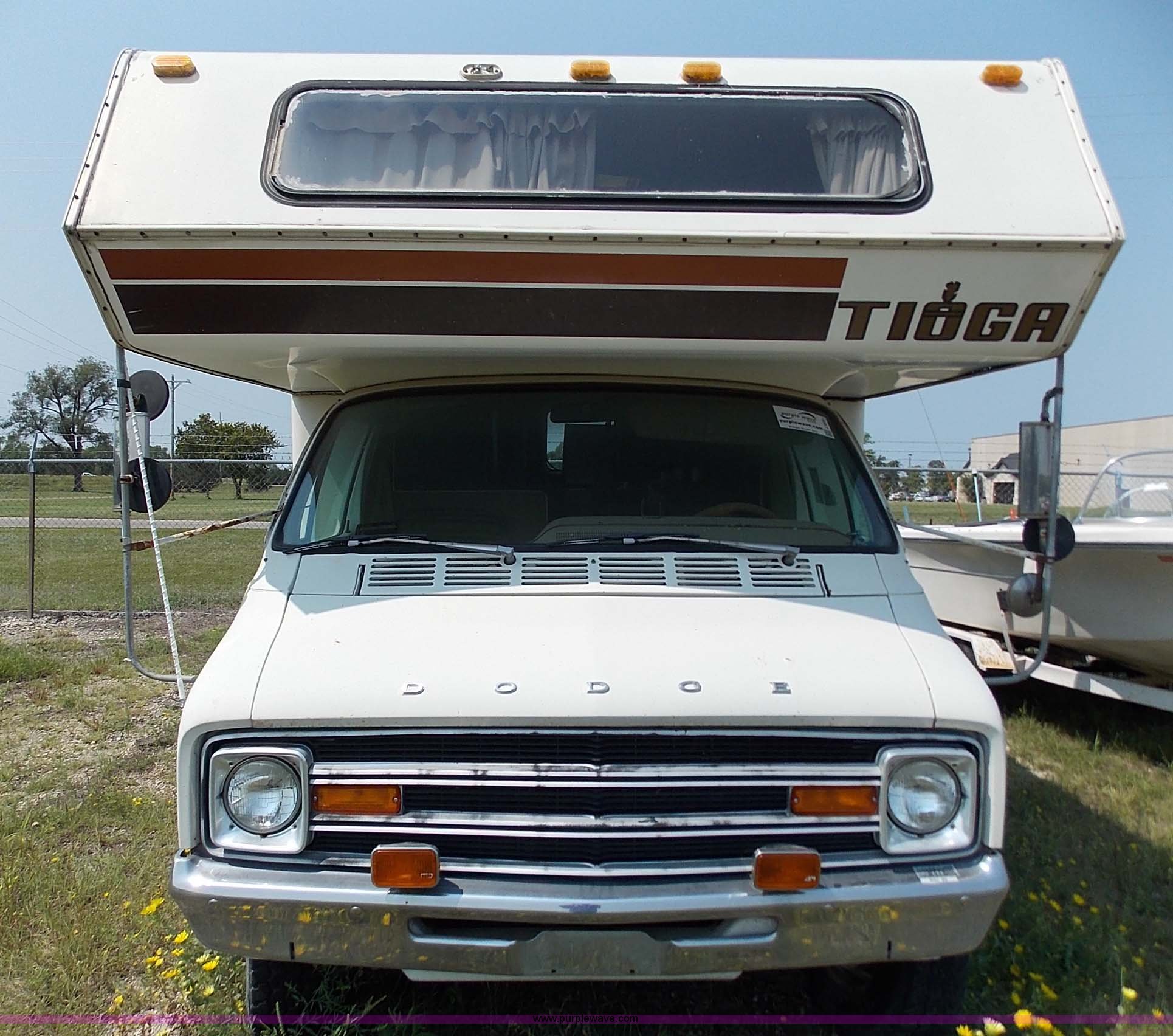 Purple Wave is selling a used RV in Kansas. This item is a 1978 Dodge Sportsman motor home with the following: 12,666 miles on odometer, V8 gas engine, Automatic transmission, Heat, AM/FM/CD, Manual locks, Cloth interior, 8.75/R16.5 tires, Interior/exterior cosmetic damage, Dents and scratches, Unknown operating condition, No keys, No air cleaner, Broken window, Unit# 2013092