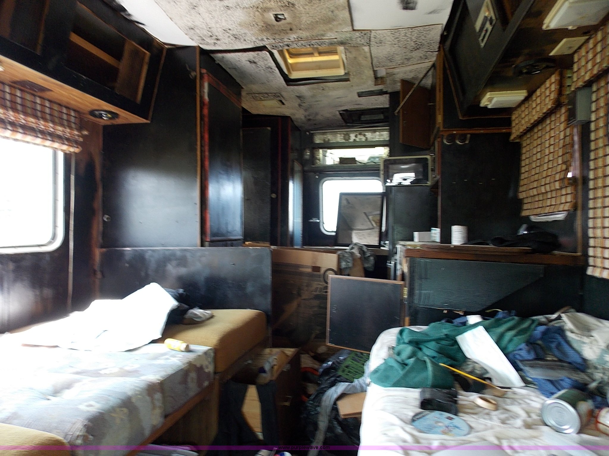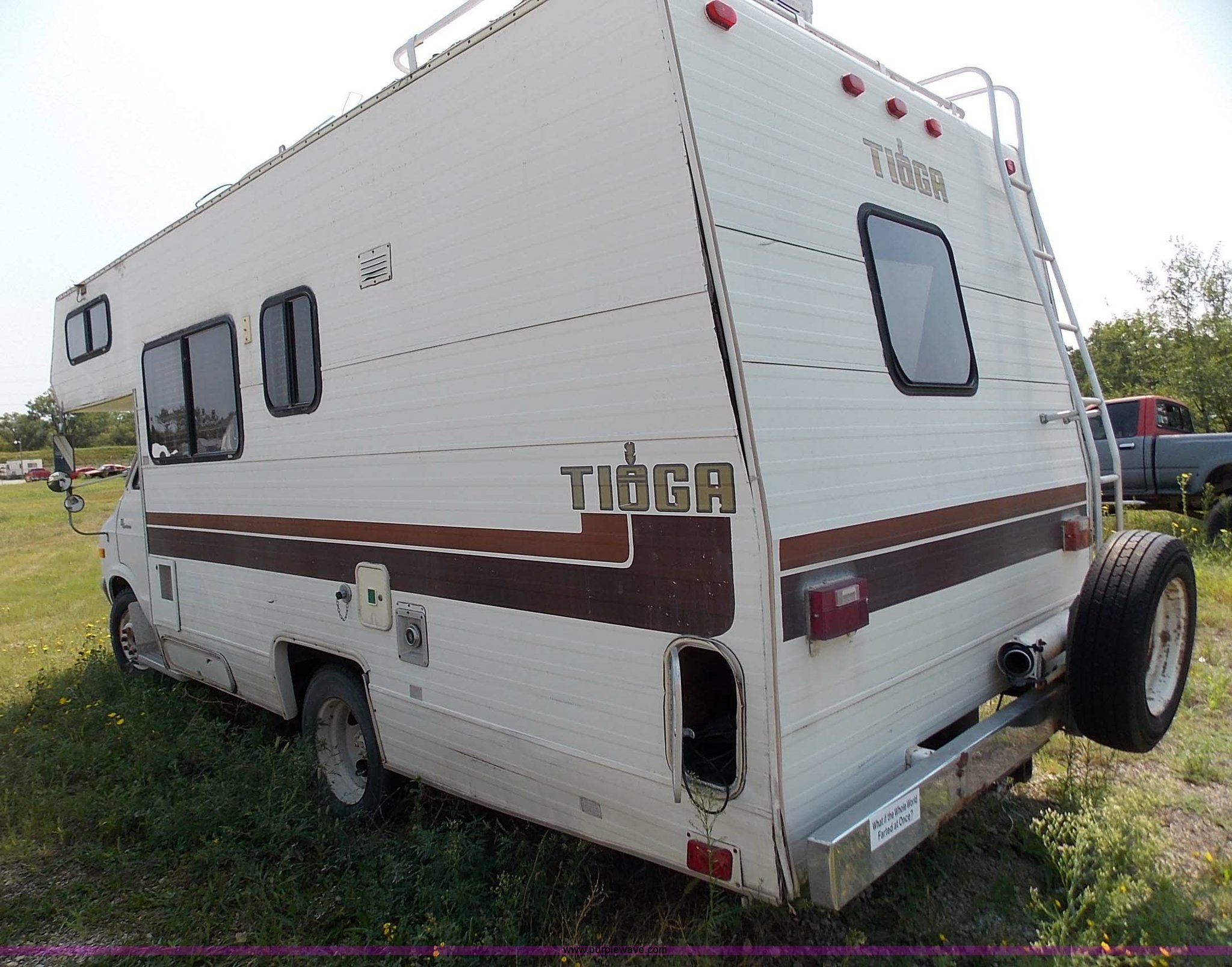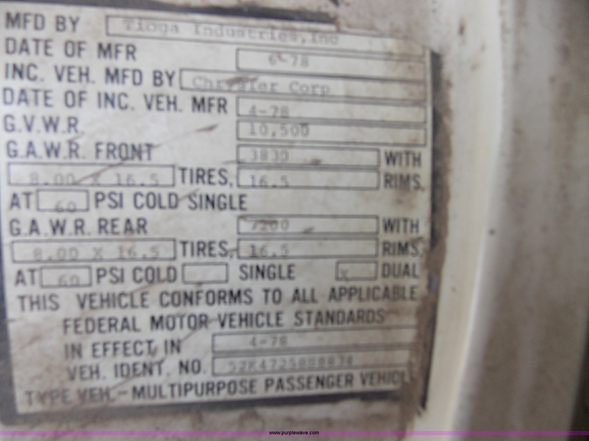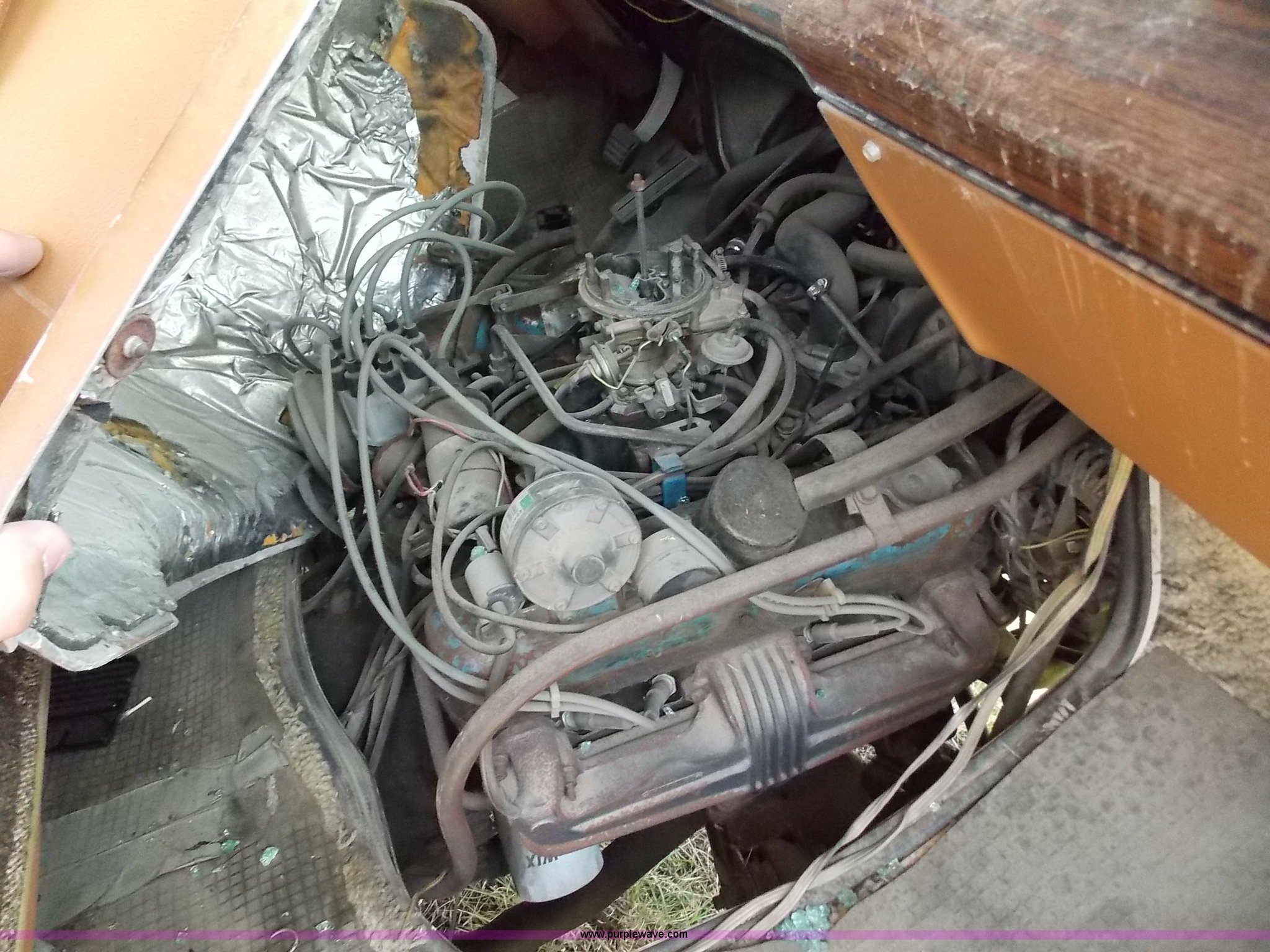Purple Wave is selling a used RV in Kansas. This item is a 1978 Dodge Sportsman motor home with the following: 12,666 miles on odometer, V8 gas engine, Automatic transmission, Heat, AM/FM/CD, Manual locks, Cloth interior, 8.75/R16.5 tires, Interior/exterior cosmetic damage, Dents and scratches, Unknown operating condition, No keys, No air cleaner, Broken window, Unit# 2013092