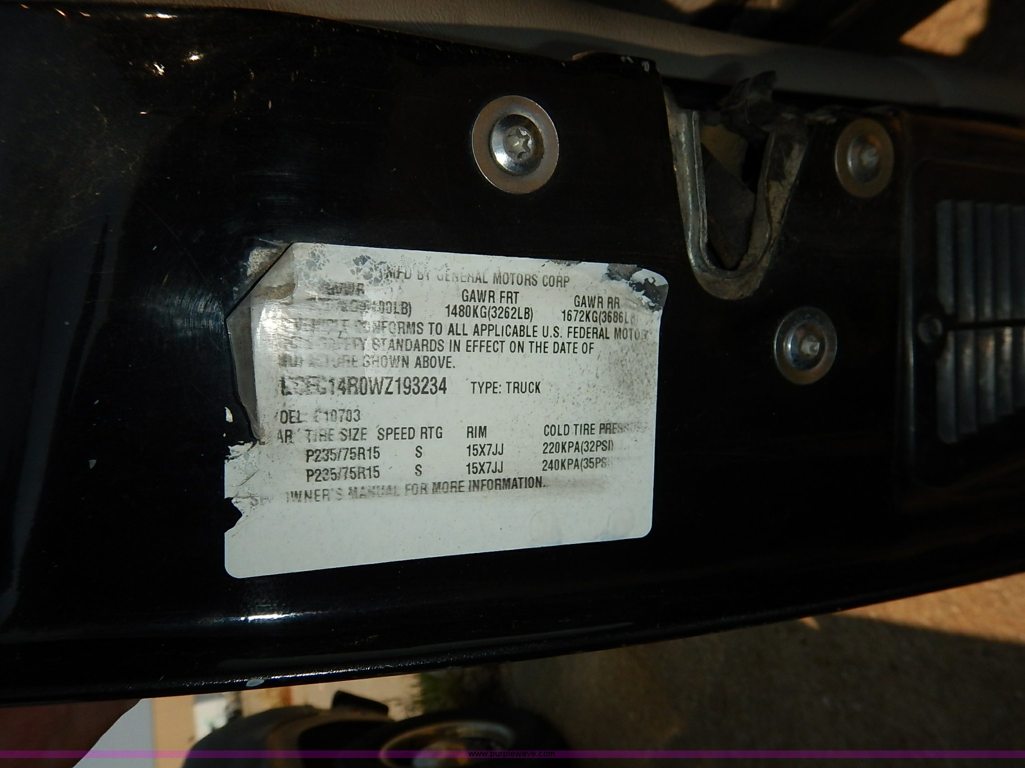 1998 Chevrolet 1500 pickup truck. 223,236 miles on odometer, 5.7L V8 OHV 16V gas engine, Automatic transmission, AC and heat, Tilt, Cruise, AM/FM/CD, Power windows, locks, and mirrors, Cloth interior, 275/60R15 tires, No keys, Interior/exterior cosmetic damage, Door handle broken, Engine has been dis-assembled Parts may be missing, Non-operational unit, Unknown operating condition, Unit# AV2014023. Vehicle abandoned. Title history is unknown.. Buyer will receive US Government issued ownership documentation from the seller which will be sufficient to apply for a title in the buyer's name.. See NAFI specific removal terms. 1GCEC14R0WZ193234. NAFI Abandoned Vehicles. Fort Riley, KS 66442