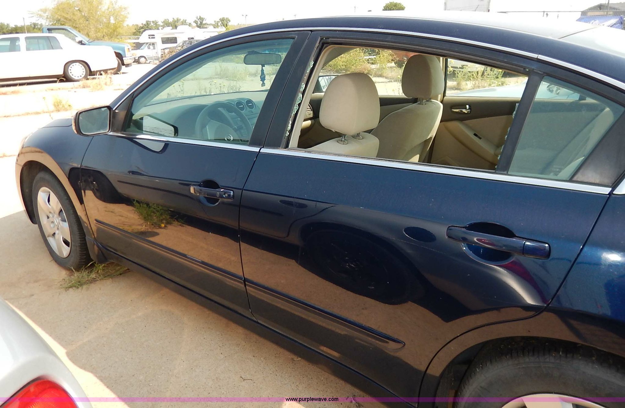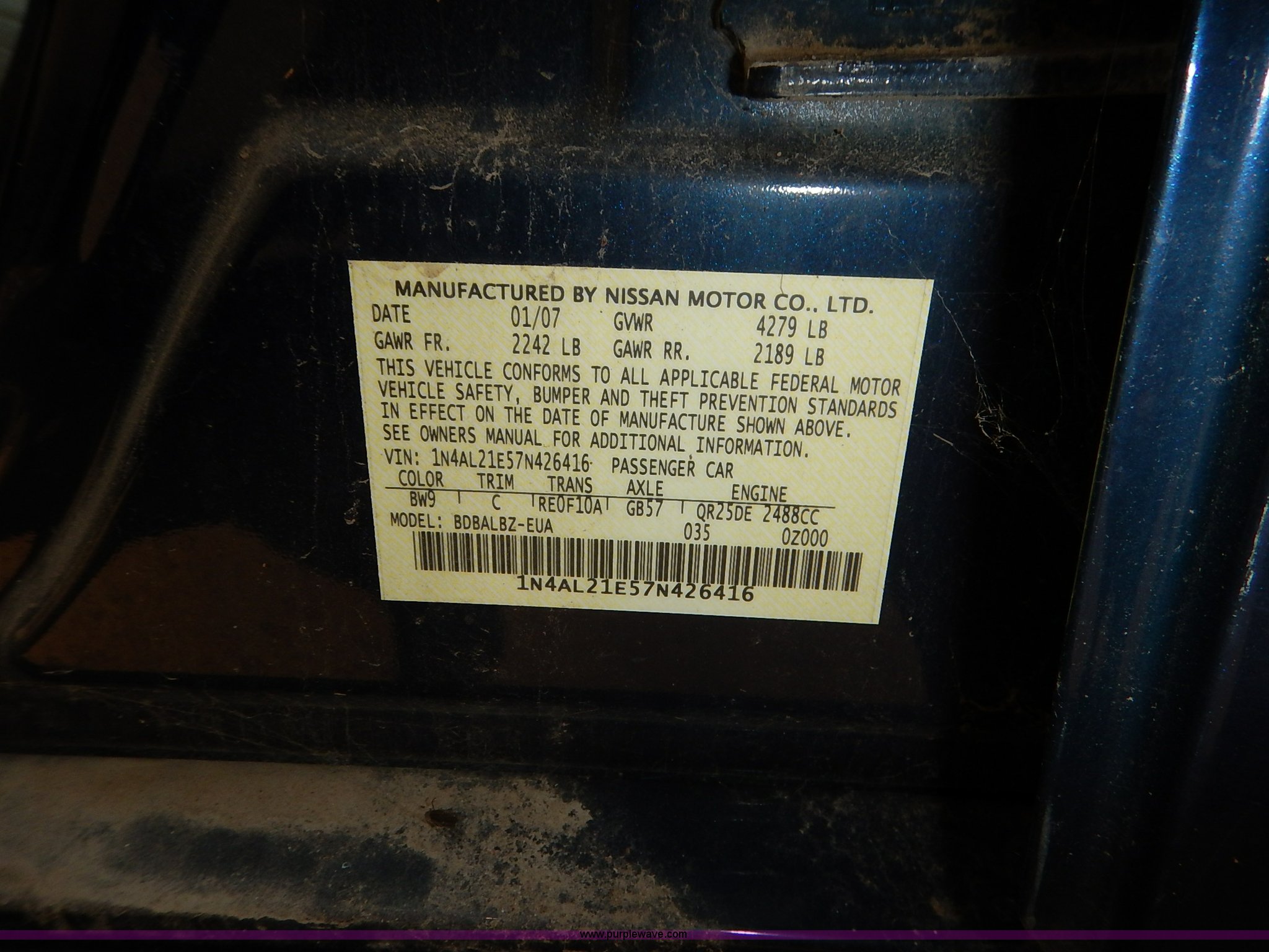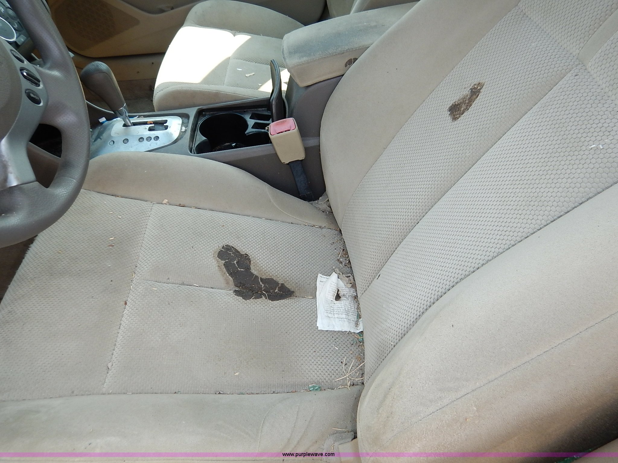 Purple Wave is selling a used Passenger Vehicle in Kansas. This item is a 2007 Nissan Altima with the following: Unknown miles on odometer, 2.5L L4 DOHC 16V gas engine, Automatic transmission, AC and heat, Tilt, Cruise, AM/FM/CD, Power windows, locks, and mirrors, Cloth interior, 215/60R16 tires, No keys, Interior/exterior cosmetic damage, Broken window, Unknown operating condition, Unit# AV2014018