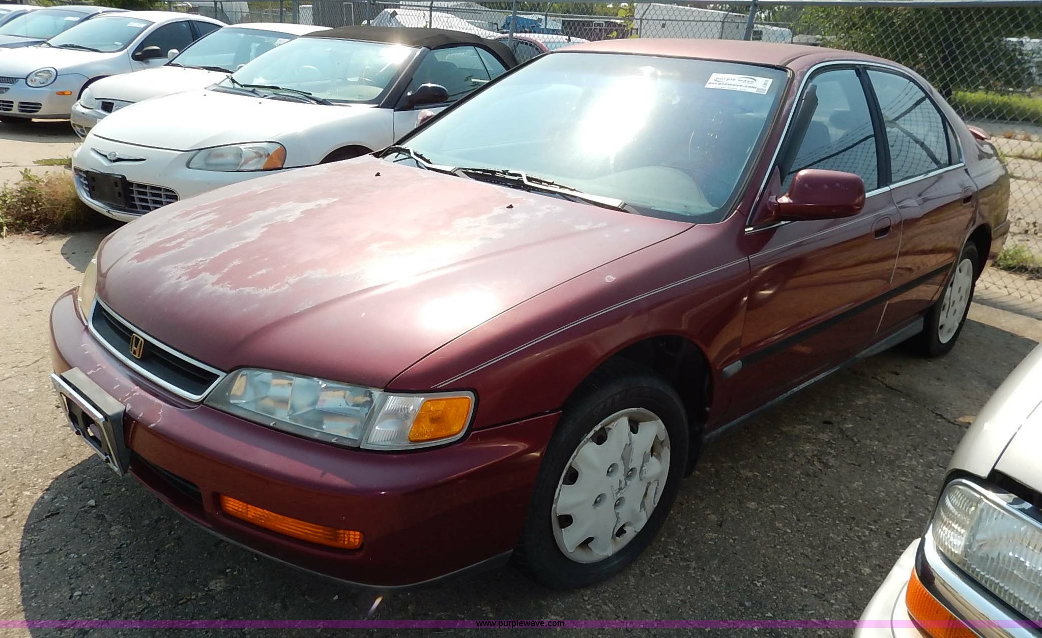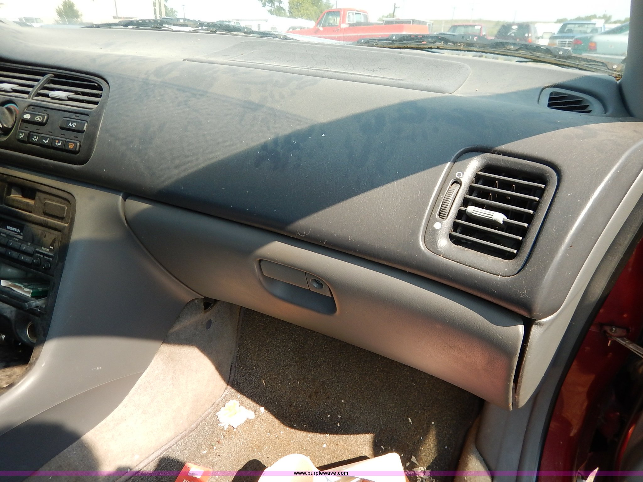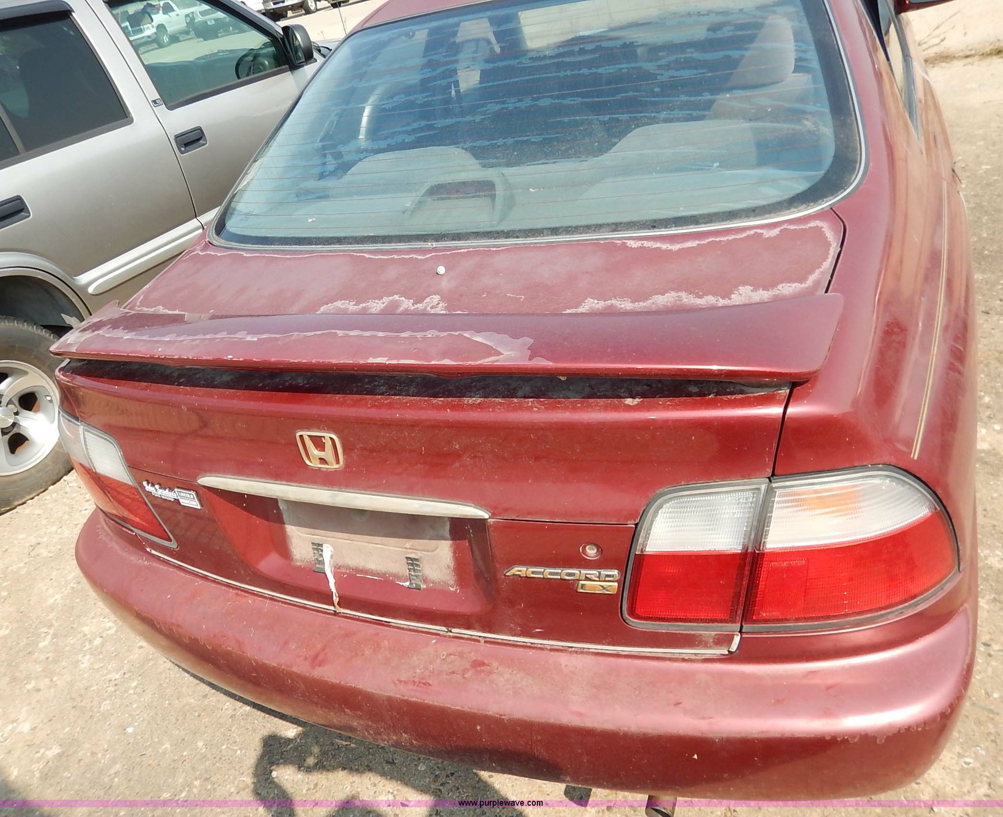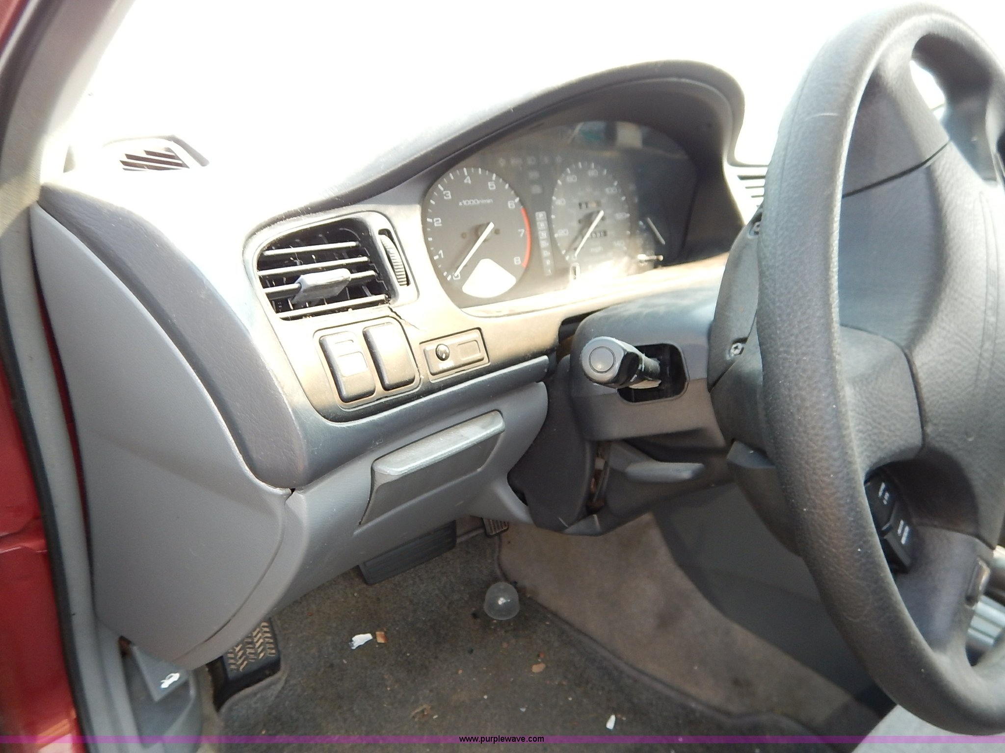 Purple Wave is selling a used Passenger Vehicle in Kansas. This item is a 1996 Honda Accord with the following: 184,538 miles on odometer, 2.2L L4 SOHC 16V gas engine, Automatic transmission, AC and heat, Tilt, Cruise, AM/FM/cassette, Power windows, locks, and mirrors, Cloth interior, 195/60R15 tires, No keys, Interior/exterior cosmetic damage, Dents and scratches, Unknown operating condition, Flat tires, Unit# AV2013058