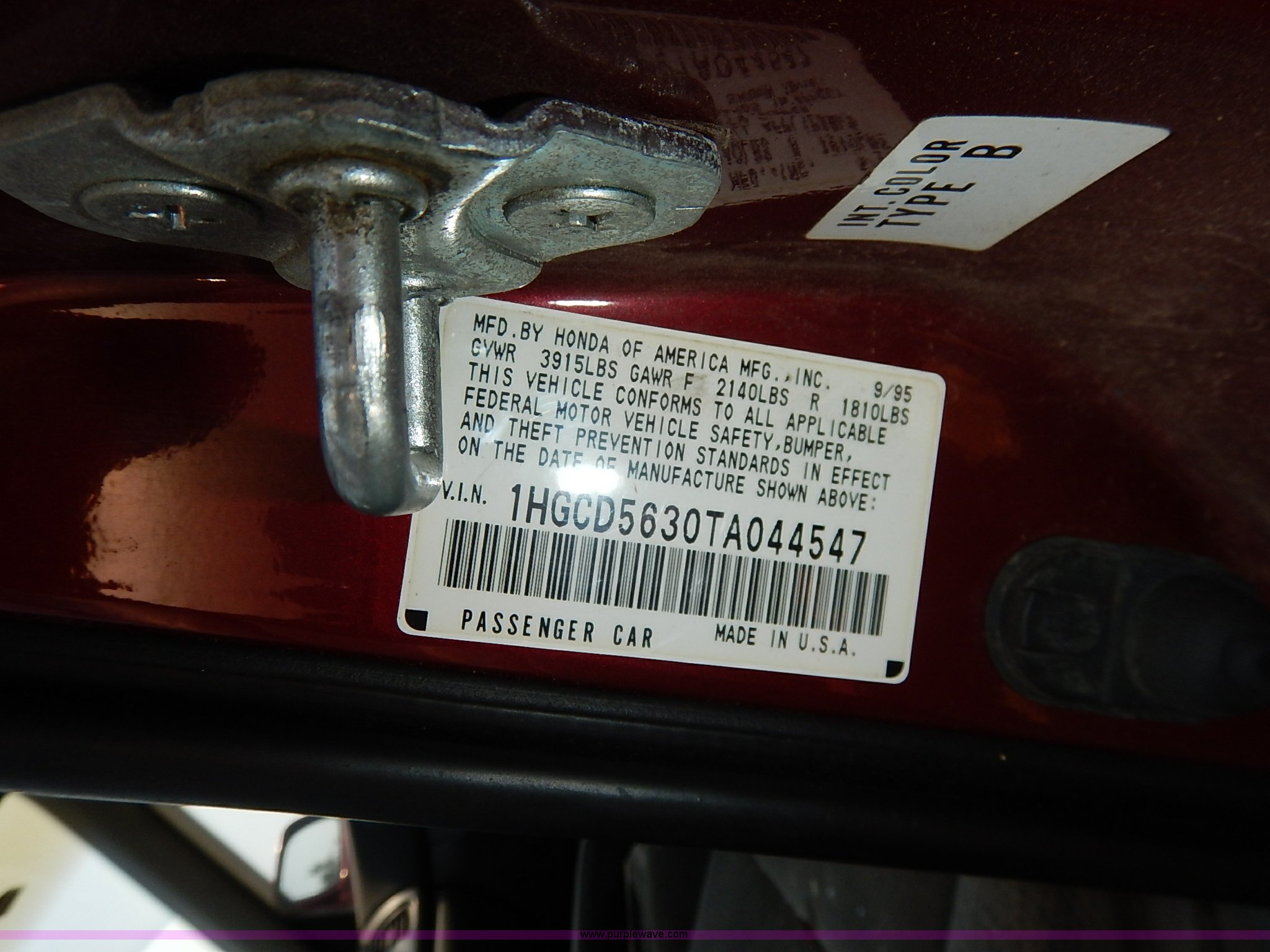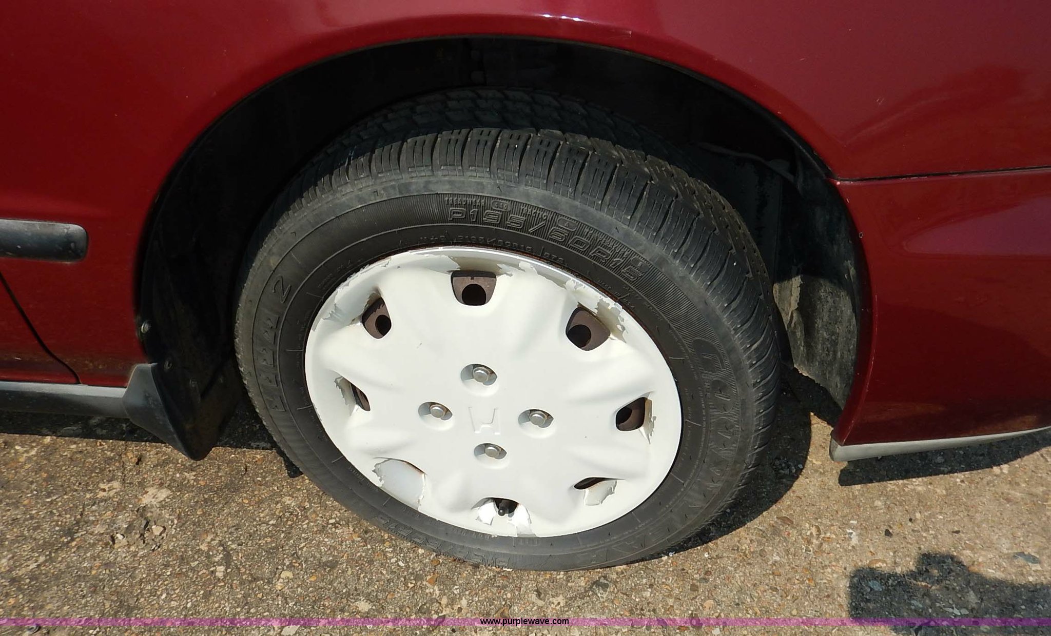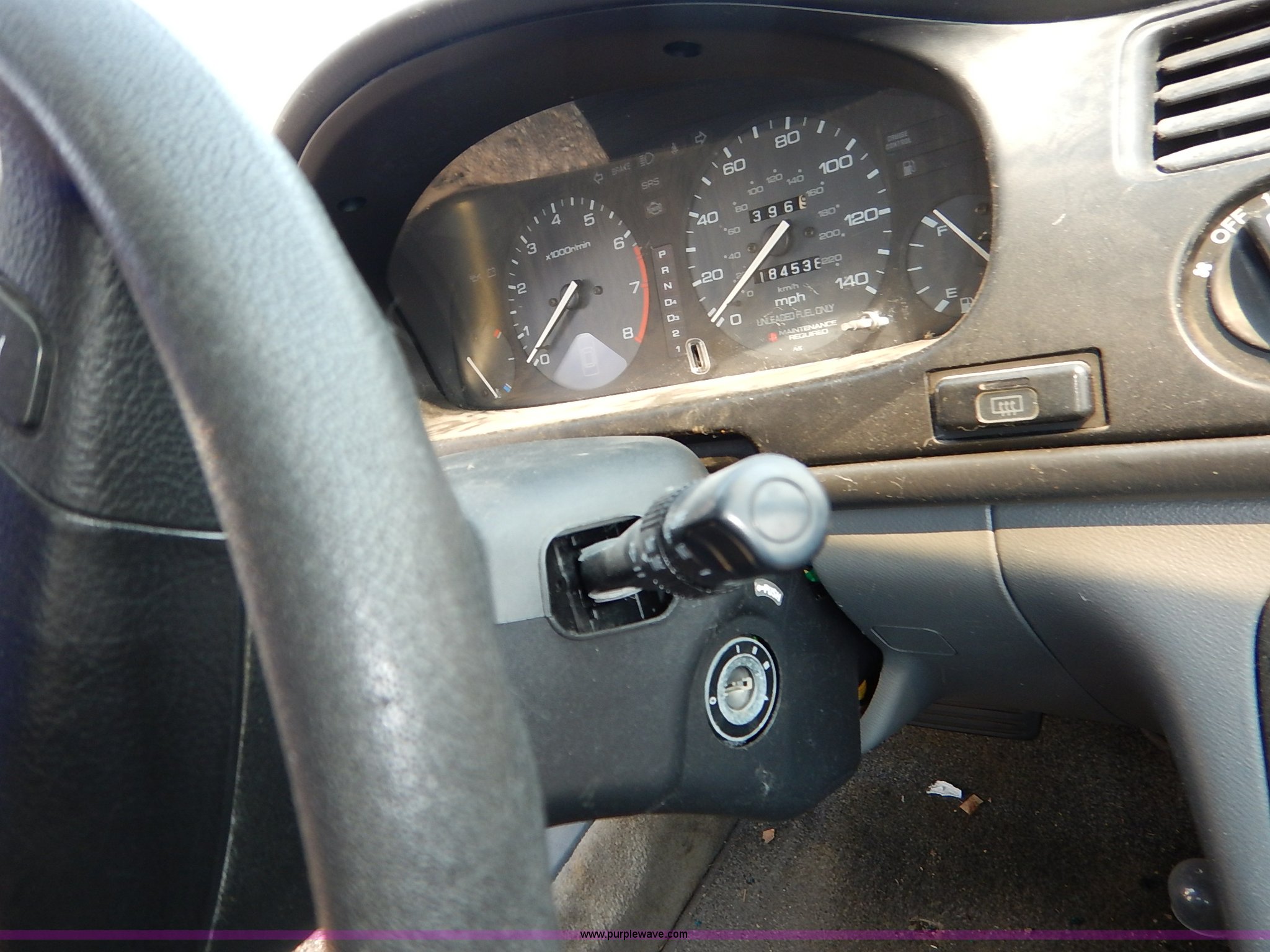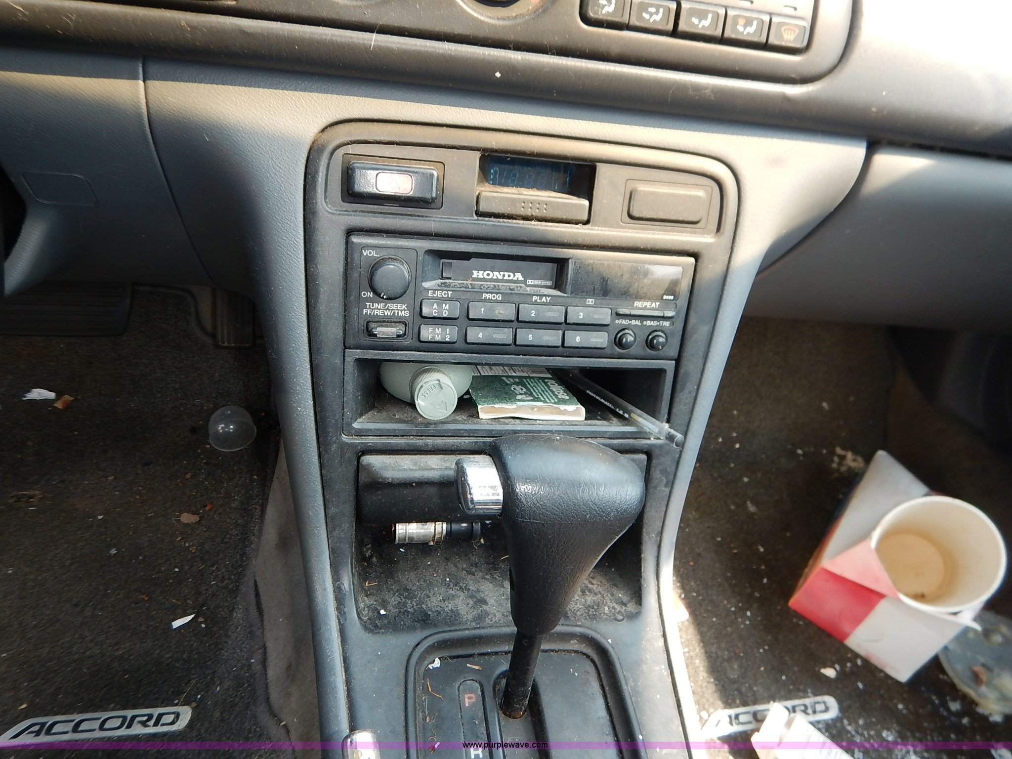 Purple Wave is selling a used Passenger Vehicle in Kansas. This item is a 1996 Honda Accord with the following: 184,538 miles on odometer, 2.2L L4 SOHC 16V gas engine, Automatic transmission, AC and heat, Tilt, Cruise, AM/FM/cassette, Power windows, locks, and mirrors, Cloth interior, 195/60R15 tires, No keys, Interior/exterior cosmetic damage, Dents and scratches, Unknown operating condition, Flat tires, Unit# AV2013058