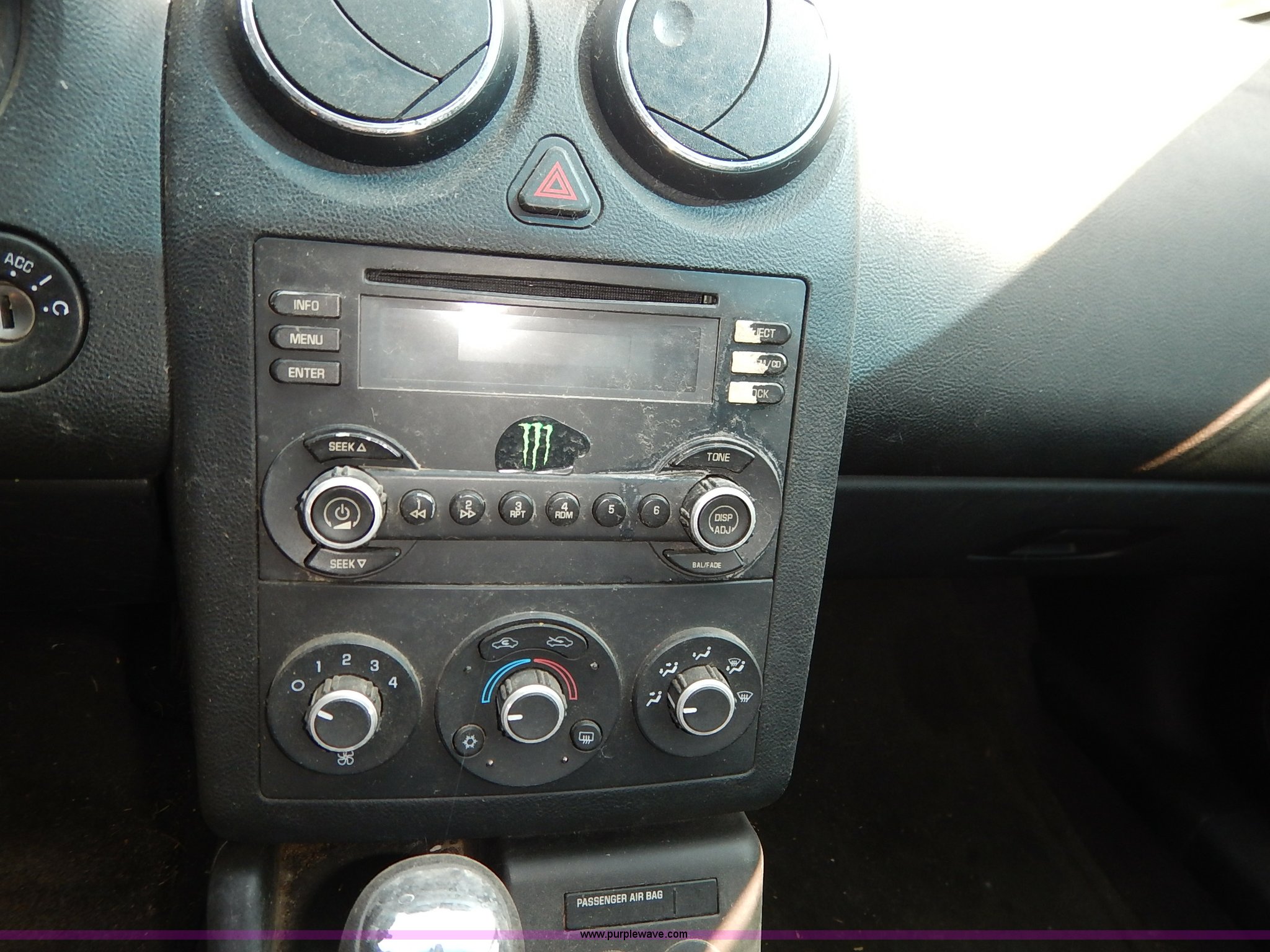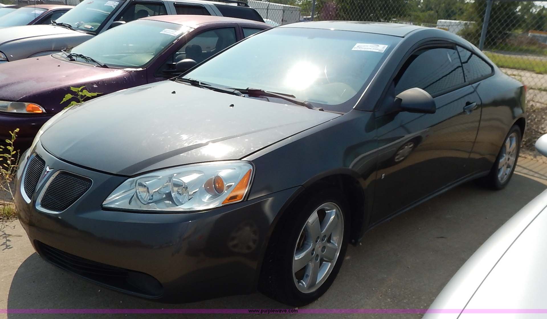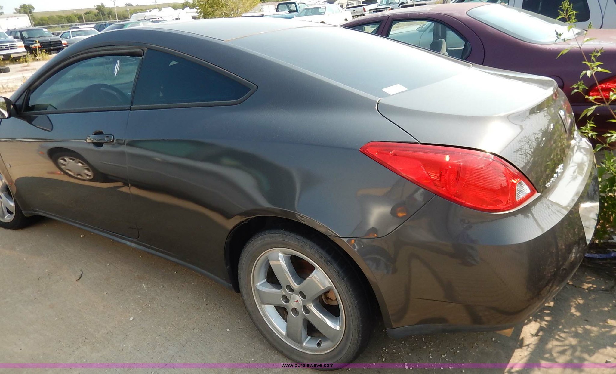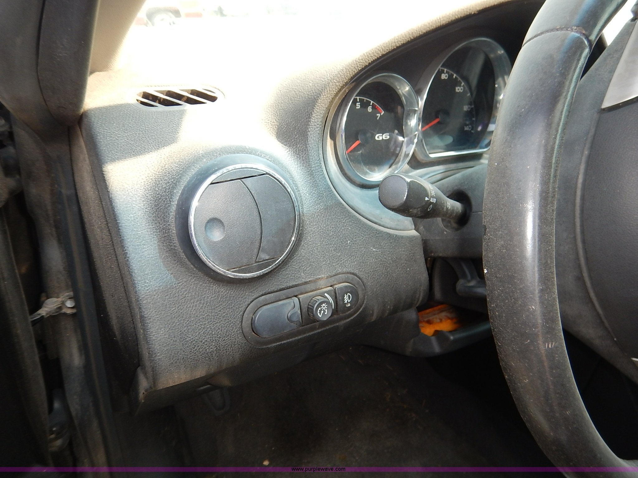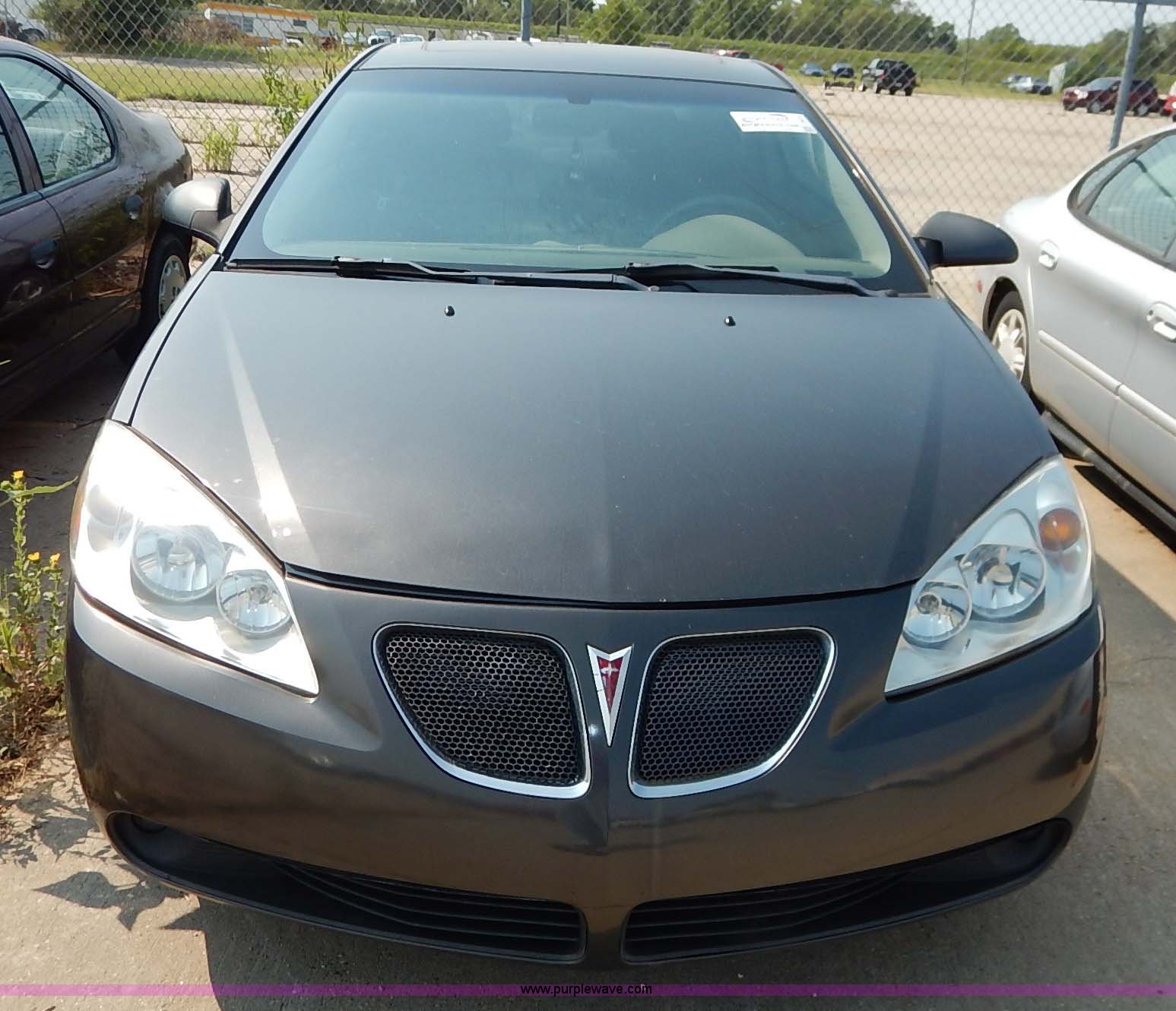 Purple Wave is selling a used Passenger Vehicle in Kansas. This item is a 2007 Pontiac G6 with the following: Unknown miles on odometer, 3.5L V6 OHV 12V gas engine, Automatic transmission, AC and heat, Tilt, Cruise, AM/FM/CD, Power windows, locks, mirrors, and seats, Leather interior, 225/50R17 tires, Nkeys, Interior cosmetic damage, Unknown operating condition, Flat tires, Unit# AV2013052
