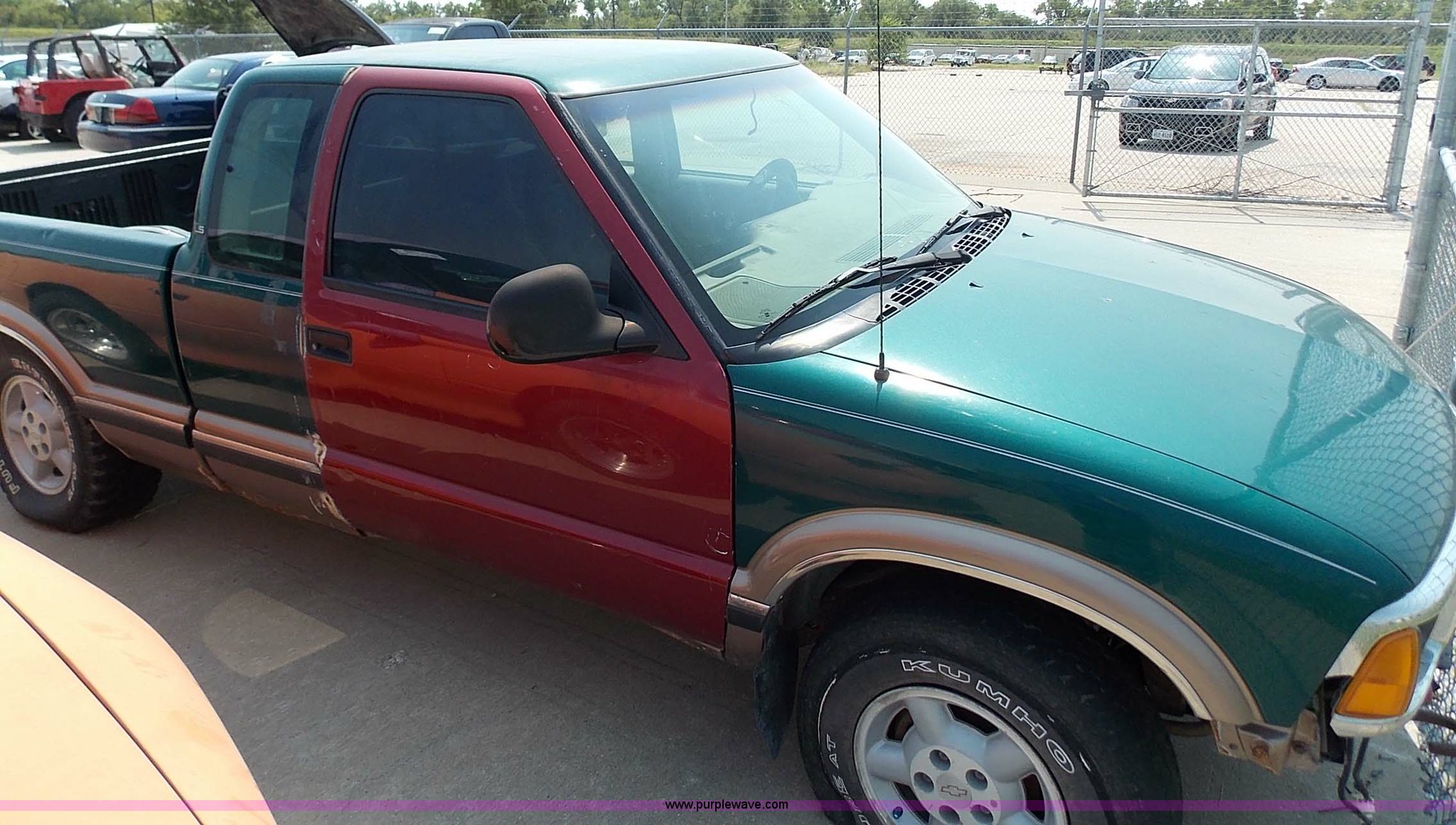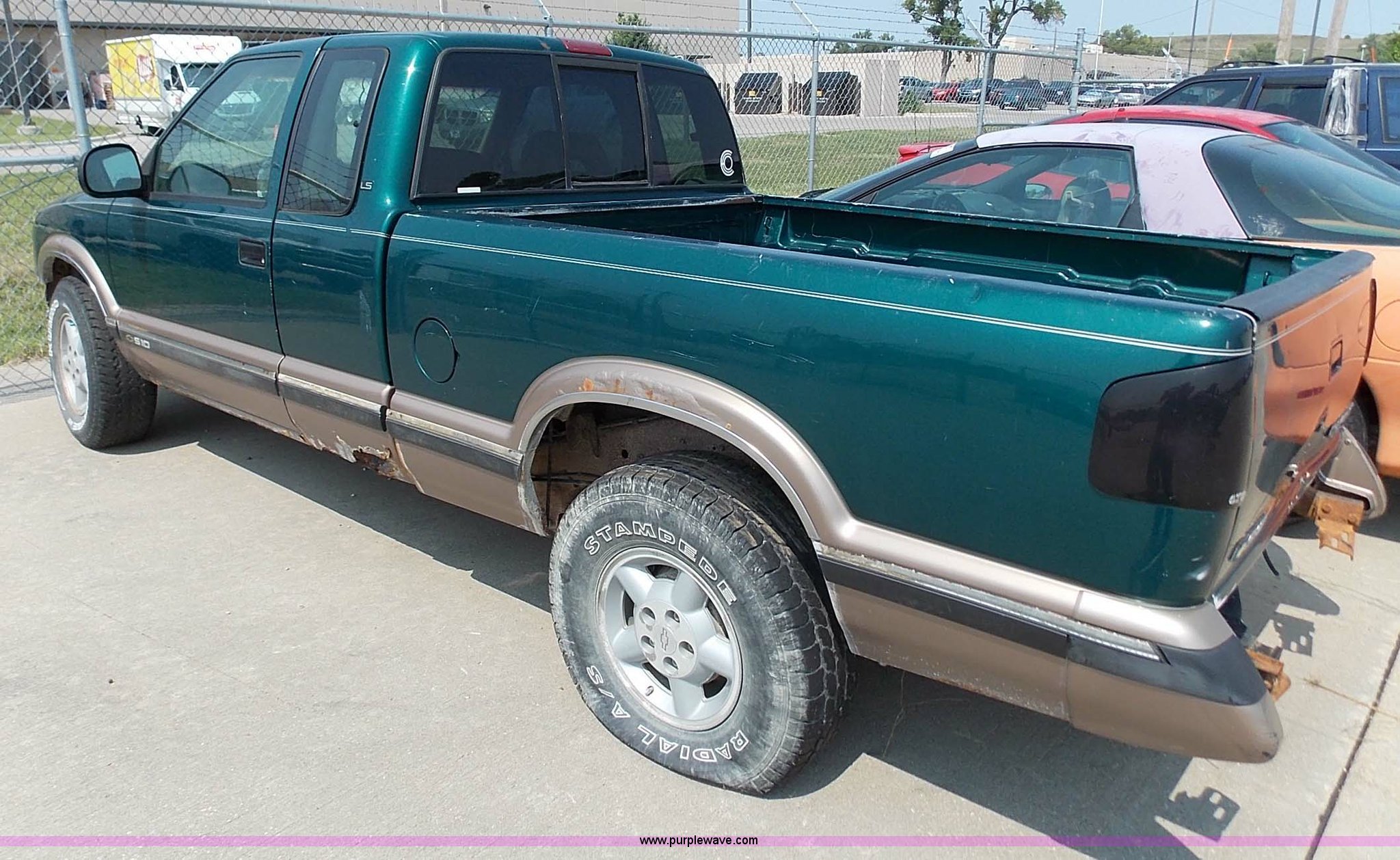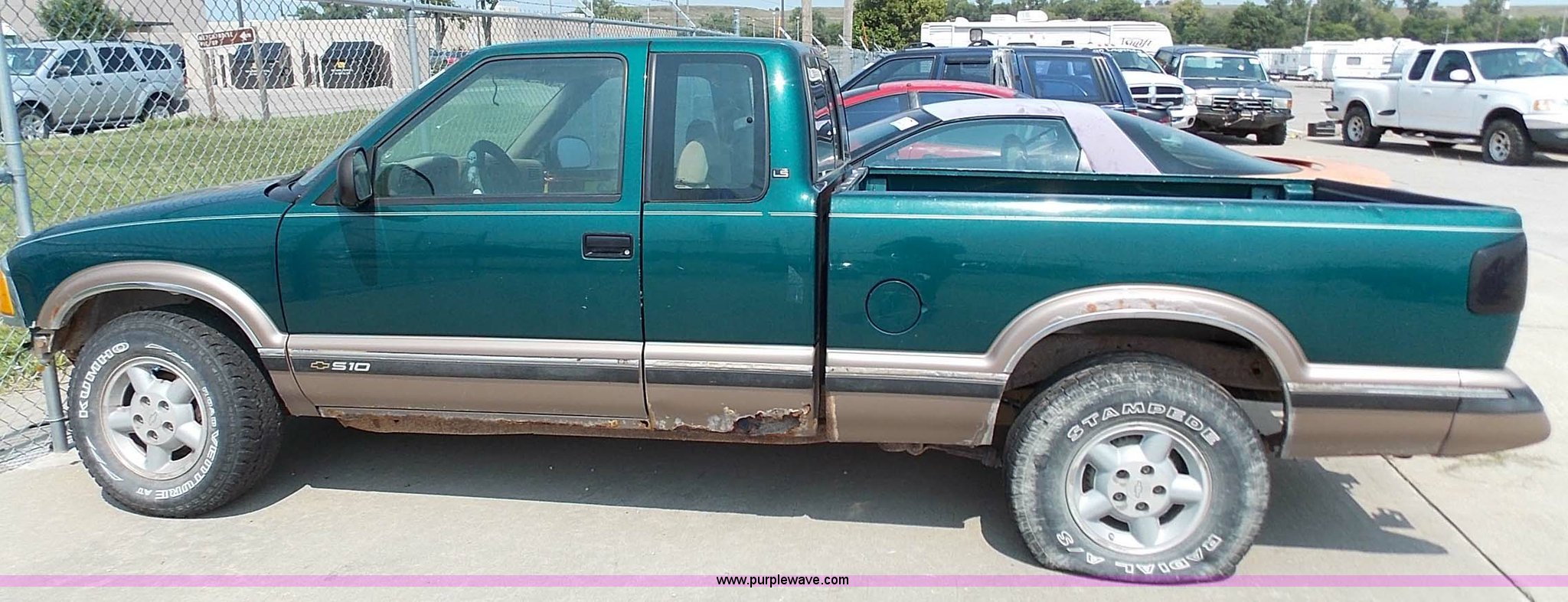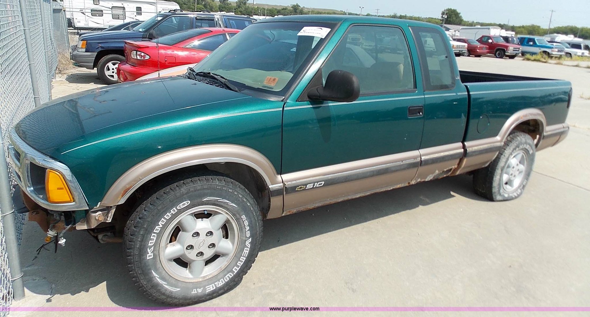 Purple Wave is selling a used Compact Pickup or Van in Kansas. This item is a 1996 Chevrolet S10 Ext. Cab pickup truck with the following: 171,690 miles on odometer, 4.3L V6 OHV 12V gas engine, Automatic transmission, AC and heat, Tilt, Cruise, AM/FM/cassette, Power windows, locks, and mirrors, Cloth interior, Receiver hitch, 31X10.5R15 tires, Interior/exterior cosmetic damage, Dents and scratches, Unknown operating condition, No keys, Broken windshield, Passenger door welded shut, Rear bumper missing, Front bumper in bed, Flat tires, Unit# AV2015027