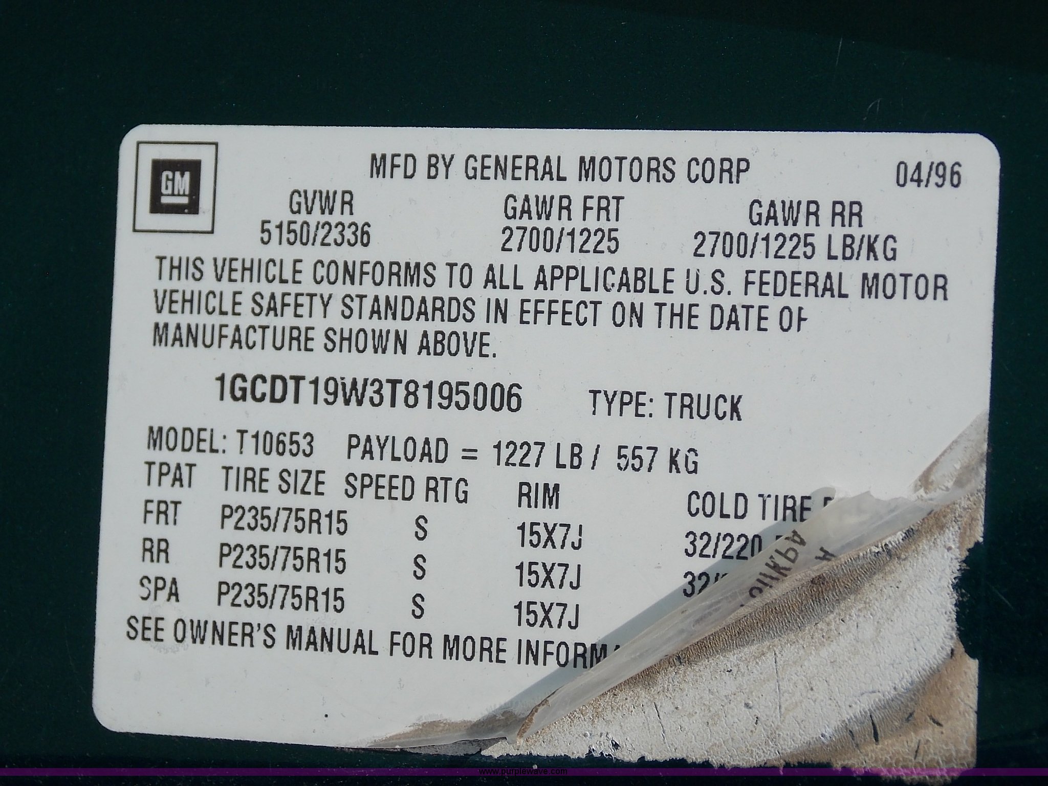 1996 Chevrolet S10 Ext. Cab pickup truck. 171,690 miles on odometer, 4.3L V6 OHV 12V gas engine, Automatic transmission, AC and heat, Tilt, Cruise, AM/FM/cassette, Power windows, locks, and mirrors, Cloth interior, Receiver hitch, 31X10.5R15 tires, Interior/exterior cosmetic damage, Dents and scratches , Unknown operating condition, No keys, Broken windshield , Passenger door welded shut, Rear bumper missing, Front bumper in bed, Flat tires, Unit# AV2015027. Vehicle abandoned. Title history is unknown.. Buyer will receive US Government issued ownership documentation from the seller which will be sufficient to apply for a title in the buyer's name.. See NAFI specific removal terms. 1GCDT19W3T8195006. NAFI Abandoned Vehicles. Fort Riley, KS 66442