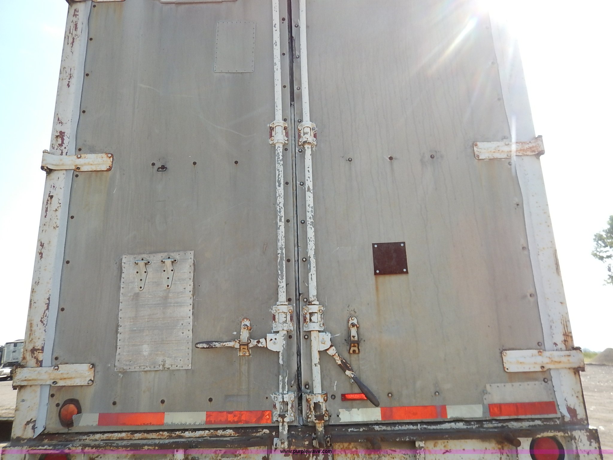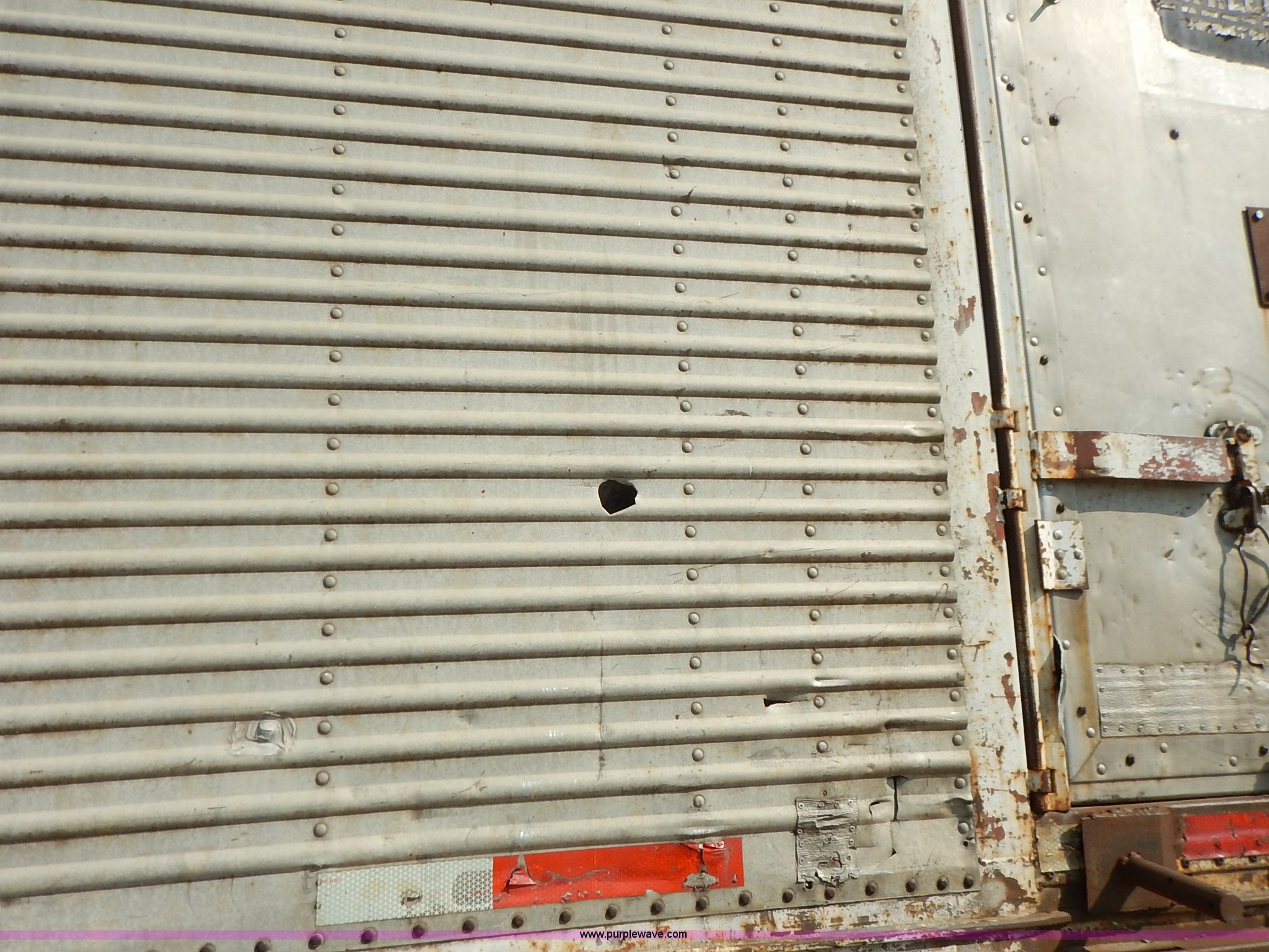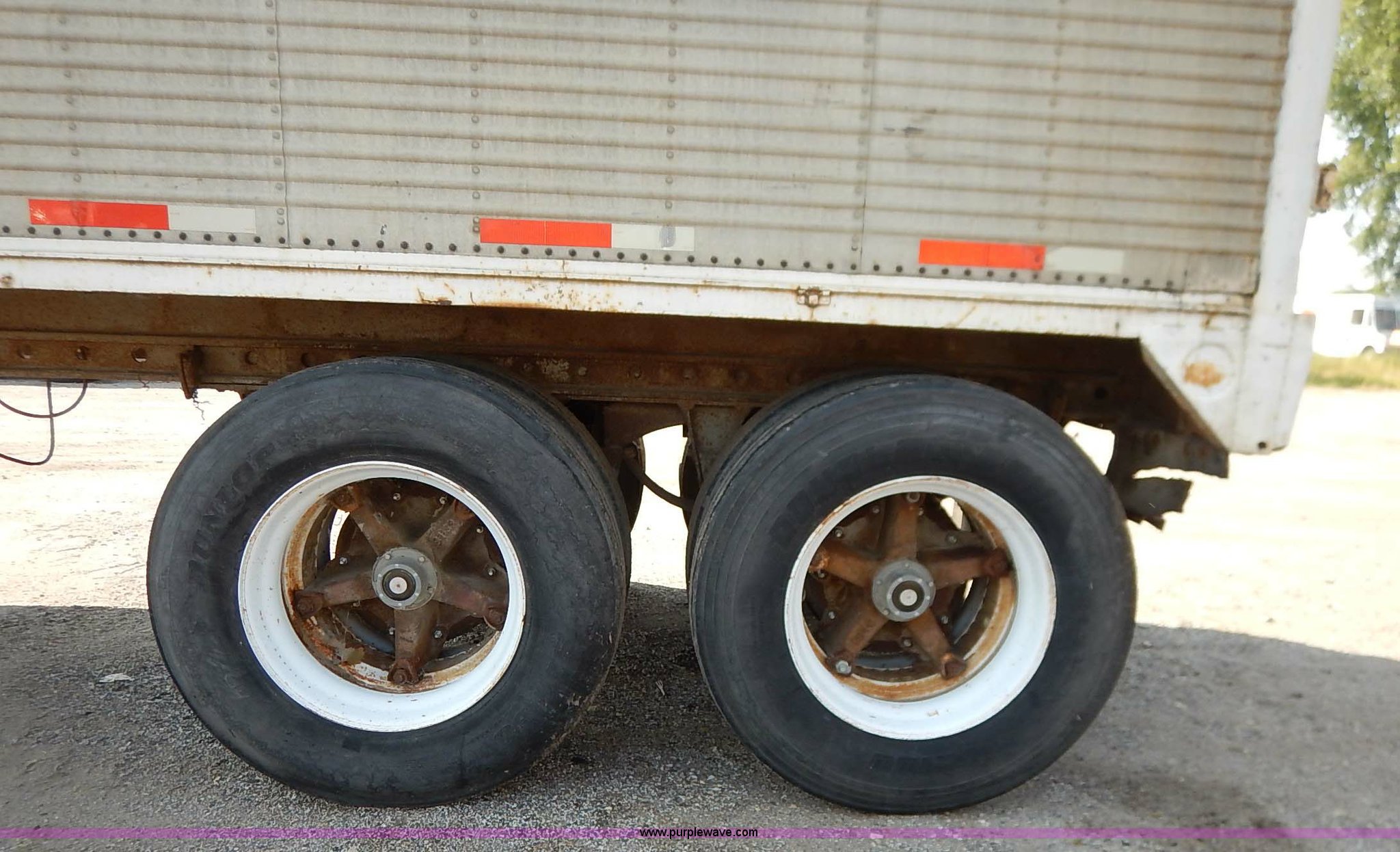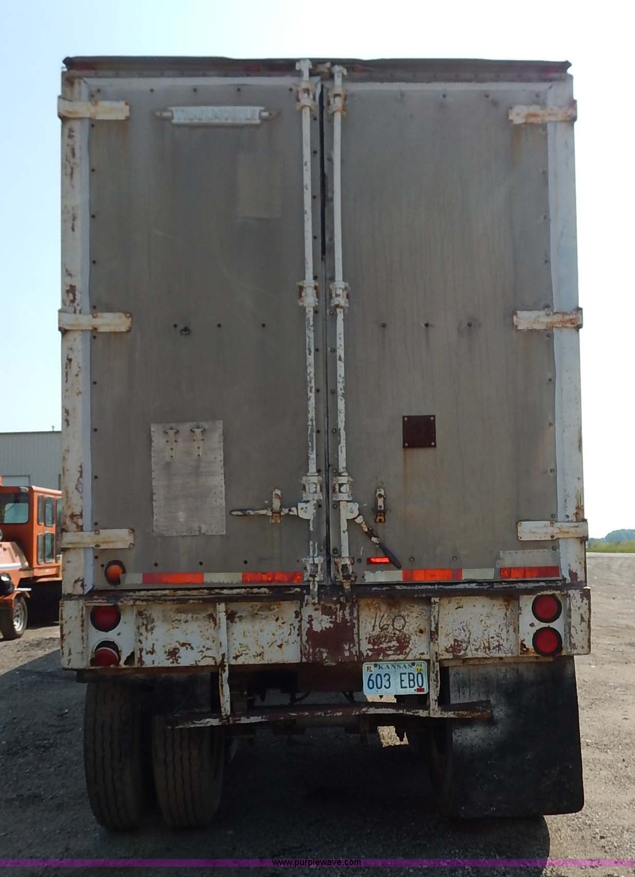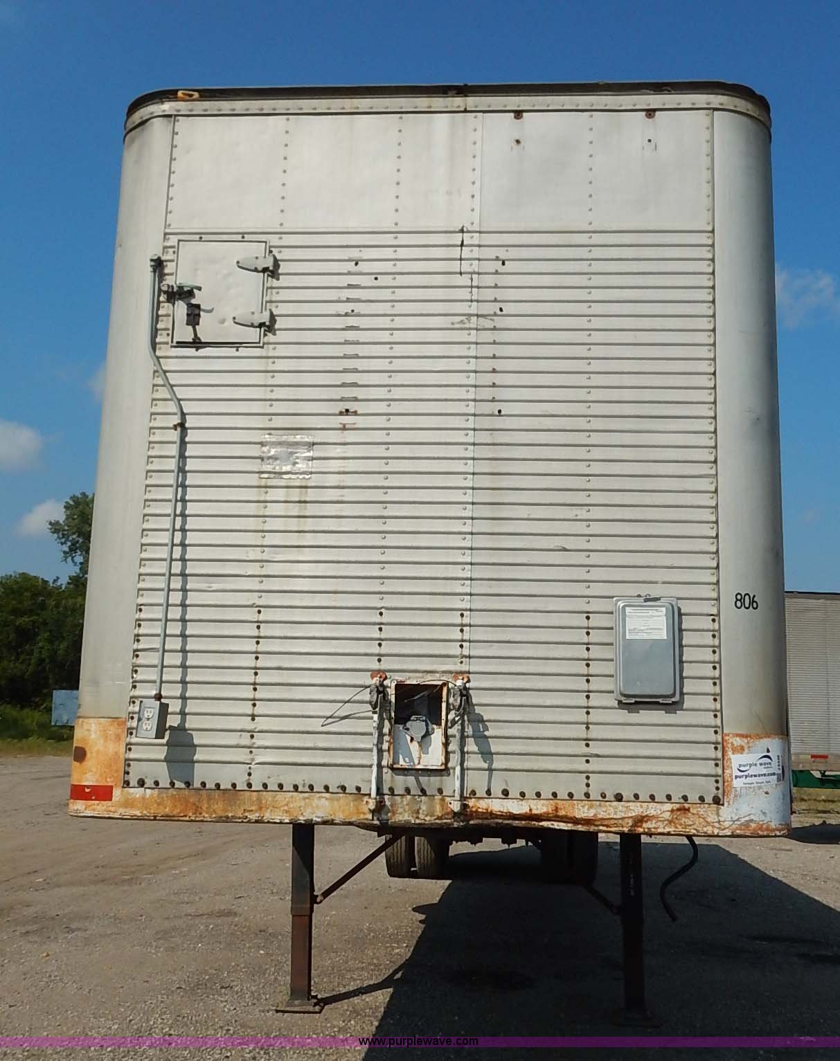 Purple Wave is selling a used Dry Van Trailer in Kansas. This item is a 1962 dry van trailer with the following: Landing gear, Dual rear swing doors, Single side entry door, Wood floor, sides, and roof, Interior lights, Spring suspension, Air brakes, Sliding tandem axles, 11R24.5 tires, Spare tire rack and tire, Contents not included, Exterior cosmetic damage, Unit# 806