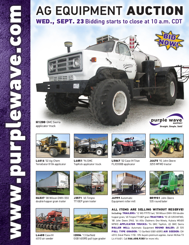 Bids over the amount of $10,000.00 are subject to Purple Wave's qualification process. Verification may include, but is not limited to, providing a bank letter of guarantee, credit references or credit card pre-authorization. Purple Wave may take any or all of these measures at any point during the auction. Purple Wave reserves the right to strike any Internet bid if the bidder refuses or fails to timely cooperate with Purple Wave's efforts to verify the bidder's qualification to bid. By registering to bid in this auction, you authorize all credit references, banks and credit reporting agencies to provide complete information about your credit to Purple Wave. For questions regarding Purple Wave's bid qualification process, please contact Maggie Deckert, Credit Specialist, at Maggie [email protected] or call 785.246.5298.