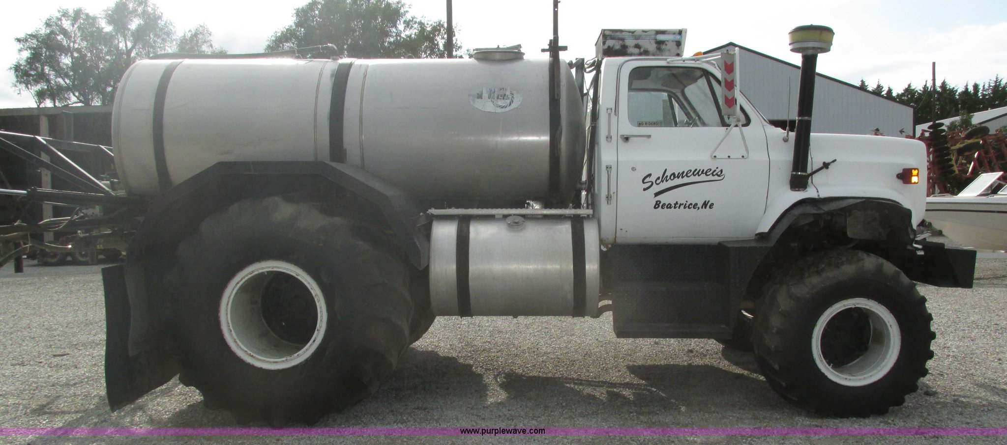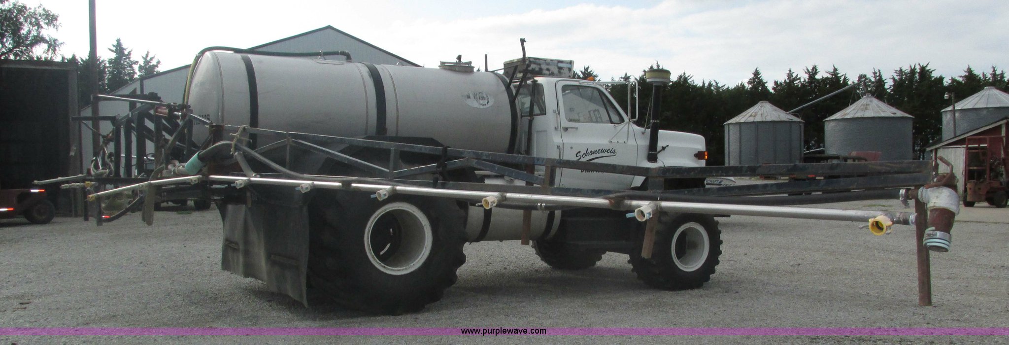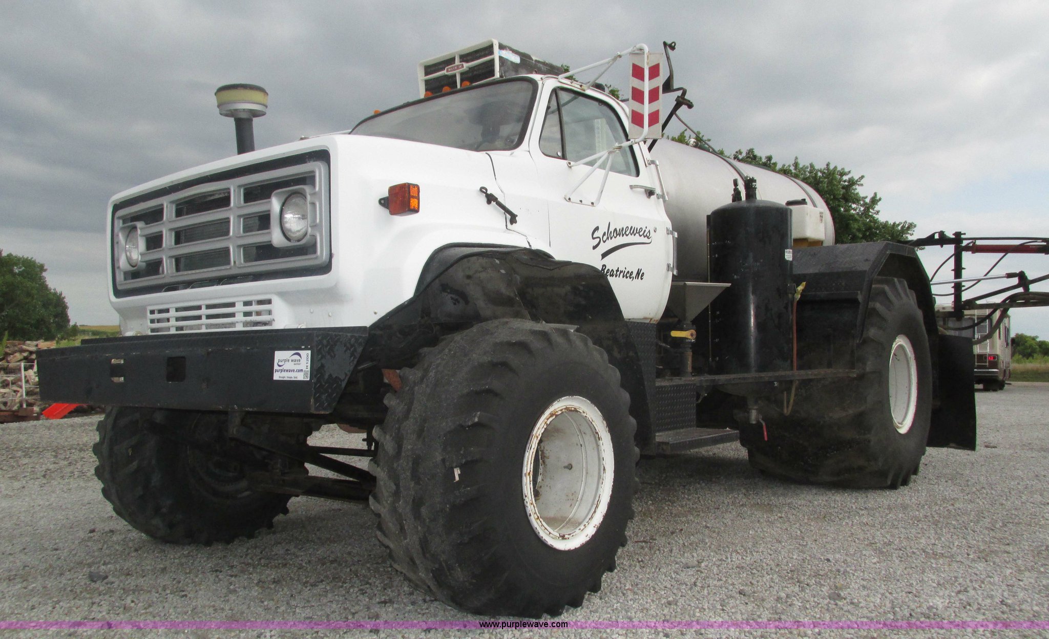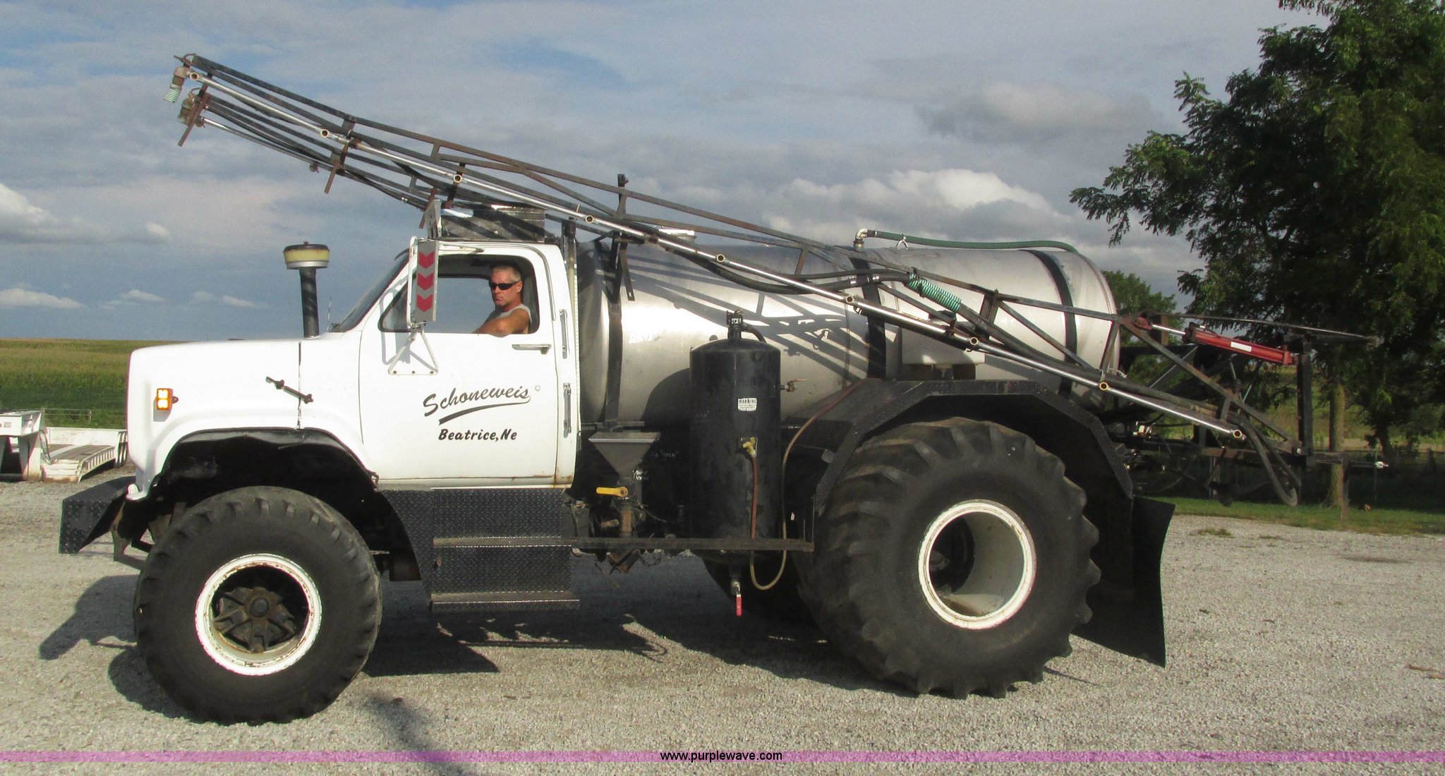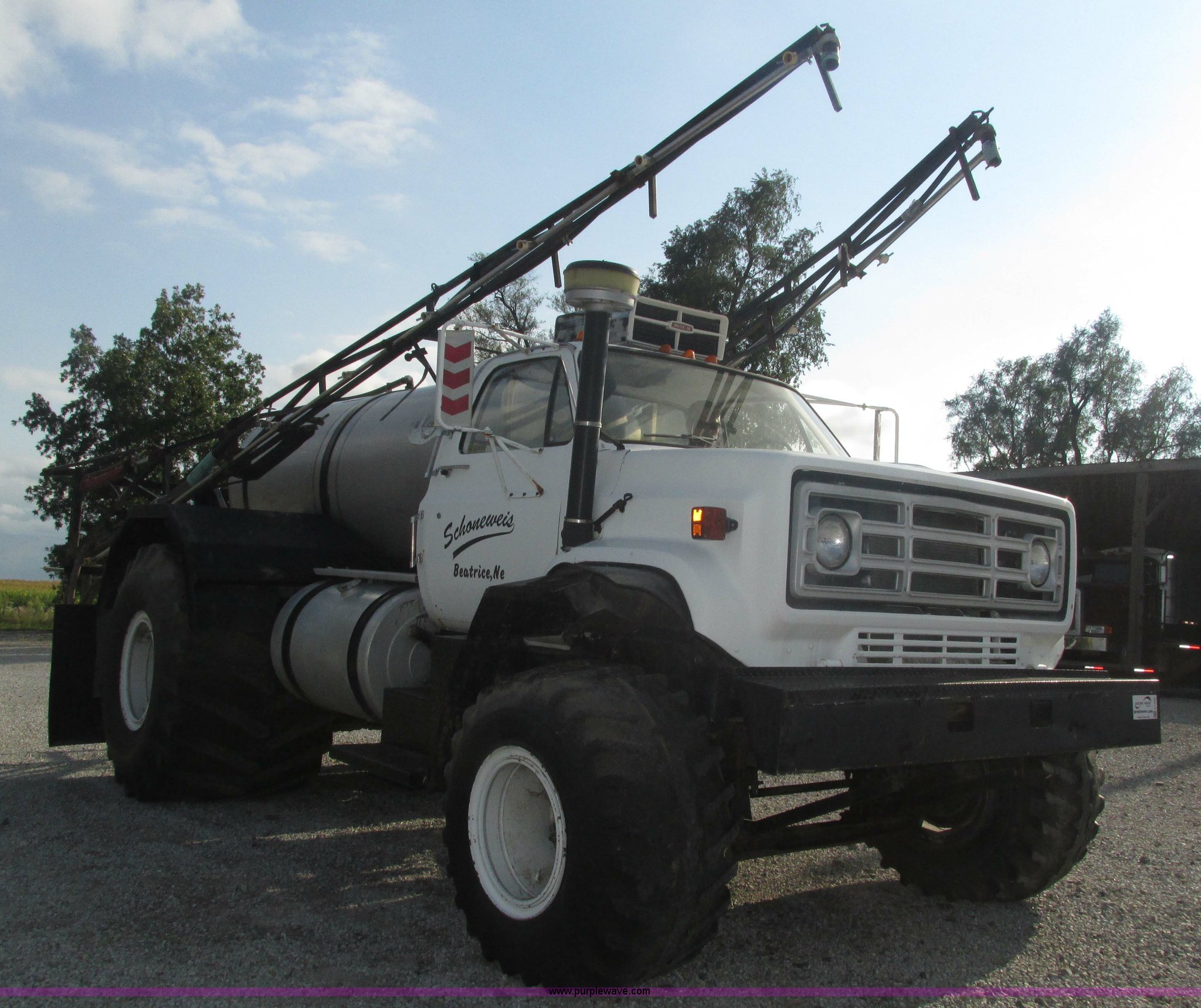 Purple Wave is selling a used Applicator Truck in Nebraska. This item is a GMC Sierra applicator truck with the following: 55,422 miles on odometer, 2,276 hours on meter, 427 C.I.D. V8 gas engine, Allison automatic transmission, 5F-1R gears, AC and heat, Mark IV roof mounted AC, Suspension seat, 1,200 gallon stainless steel solution tank, Five gallon rinse tank, 60'W boom, (5) sections, Break-away boom, Hydraulic boom fold, 30" nozzle spacing, Assorted TeeJet and Banjo nozzles and assorted fittings, 54 gallon foamer, Dual 50 gallon aluminum fuel tanks, Air brakes, 48x25.00-20 front flotation tires, 66x43.00-25 rear flotation tires, Product pump rebuilt two years ago