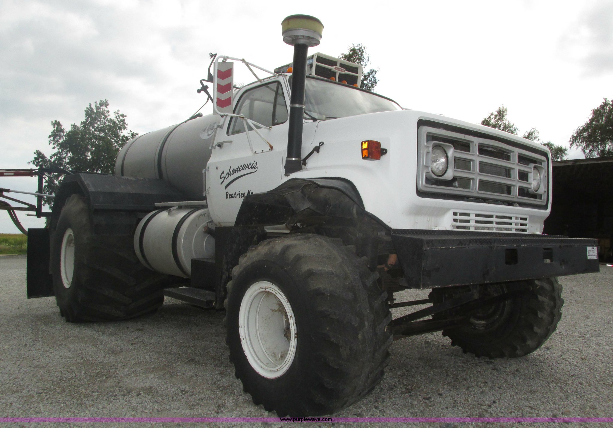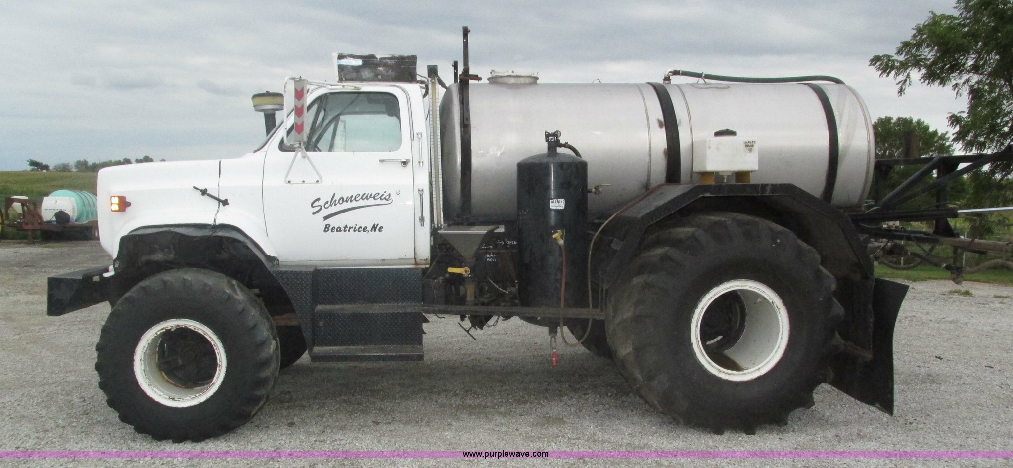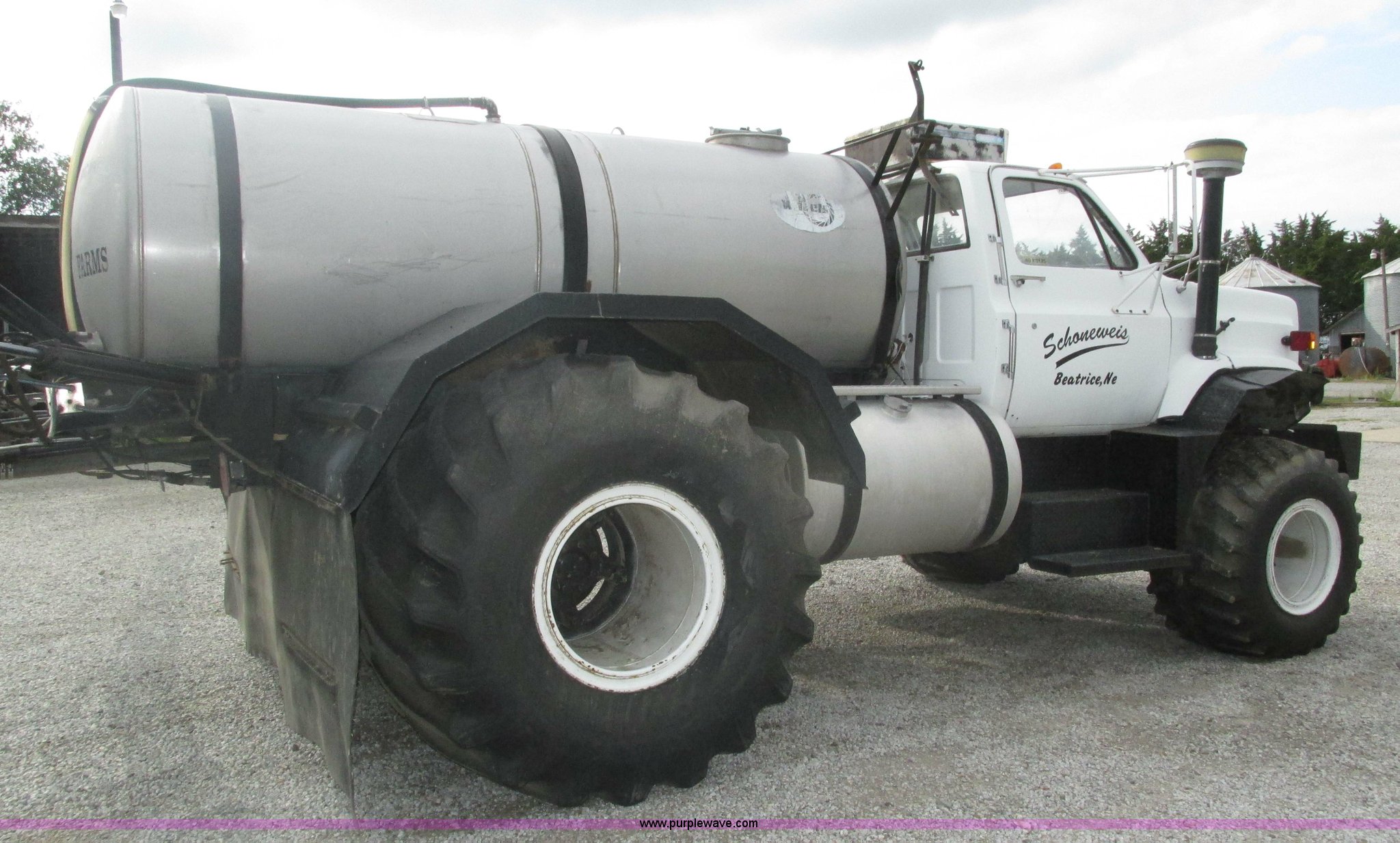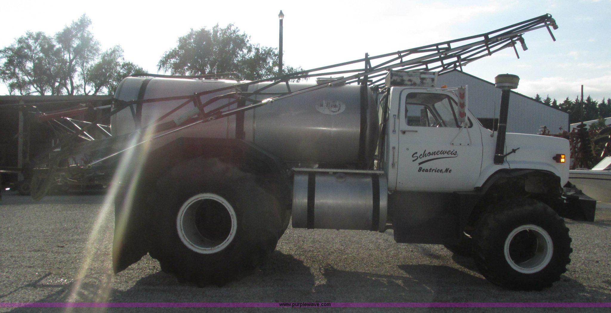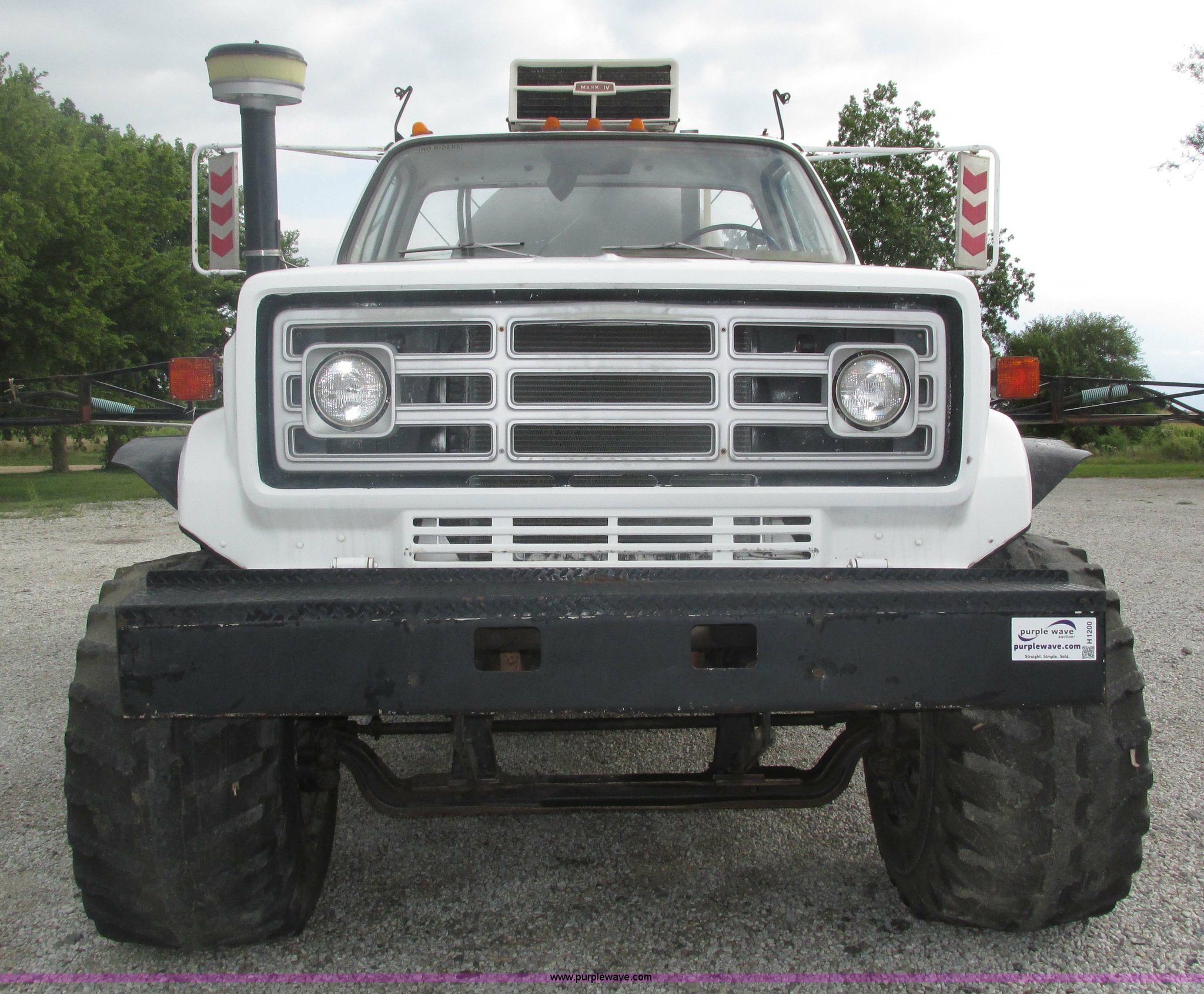 Purple Wave is selling a used Applicator Truck in Nebraska. This item is a GMC Sierra applicator truck with the following: 55,422 miles on odometer, 2,276 hours on meter, 427 C.I.D. V8 gas engine, Allison automatic transmission, 5F-1R gears, AC and heat, Mark IV roof mounted AC, Suspension seat, 1,200 gallon stainless steel solution tank, Five gallon rinse tank, 60'W boom, (5) sections, Break-away boom, Hydraulic boom fold, 30" nozzle spacing, Assorted TeeJet and Banjo nozzles and assorted fittings, 54 gallon foamer, Dual 50 gallon aluminum fuel tanks, Air brakes, 48x25.00-20 front flotation tires, 66x43.00-25 rear flotation tires, Product pump rebuilt two years ago