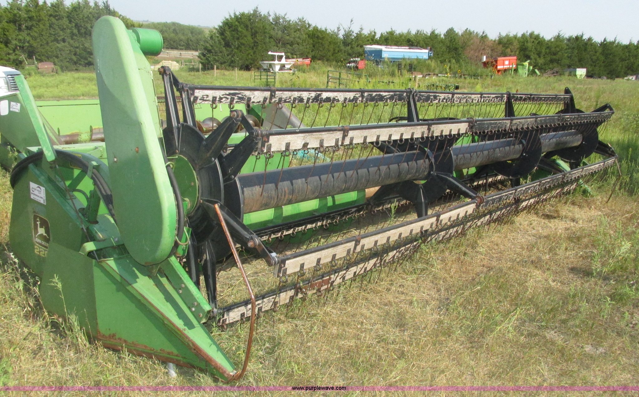 Purple Wave is selling a used Platform or Stripper Head in Nebraska. This item is a John Deere 220 bean head with the following: 20'W, 48" diameter six bar reel, Wood boards, (3) hydraulic hose, 9" tines, Belt cracked, Serial 440538
