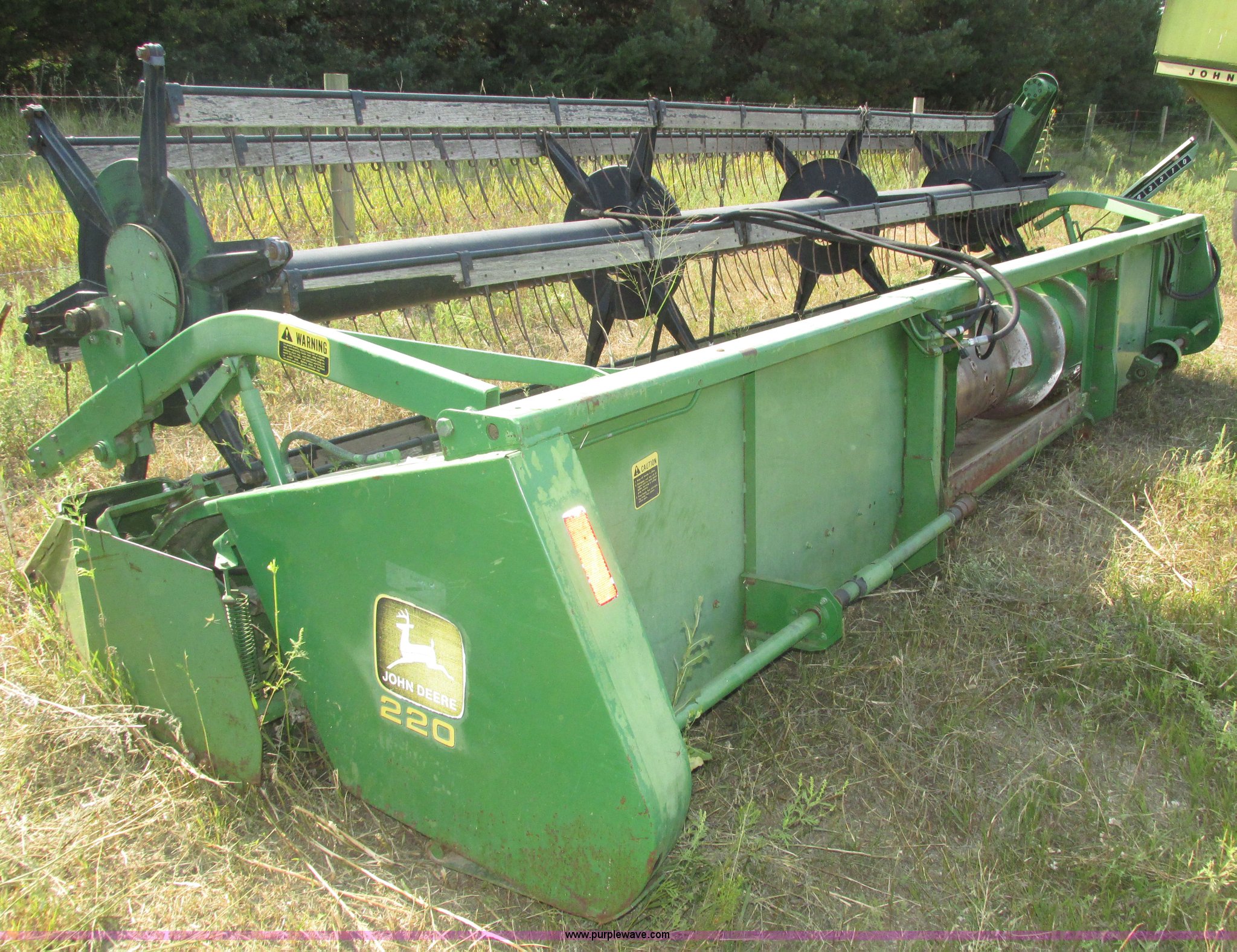 John Deere 220 bean head. 20'W, 48" diameter six bar reel Wood boards, (3) hydraulic hose, 9" tines, Belt cracked, Serial 440538. Prime Contracting. 79033 485th Ave. Ashton, NE 68817