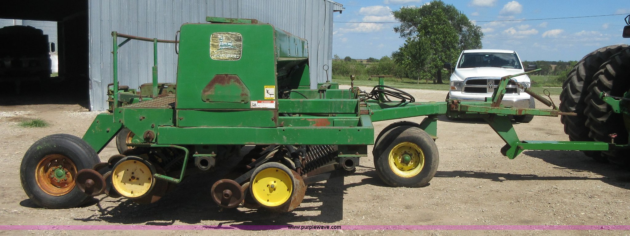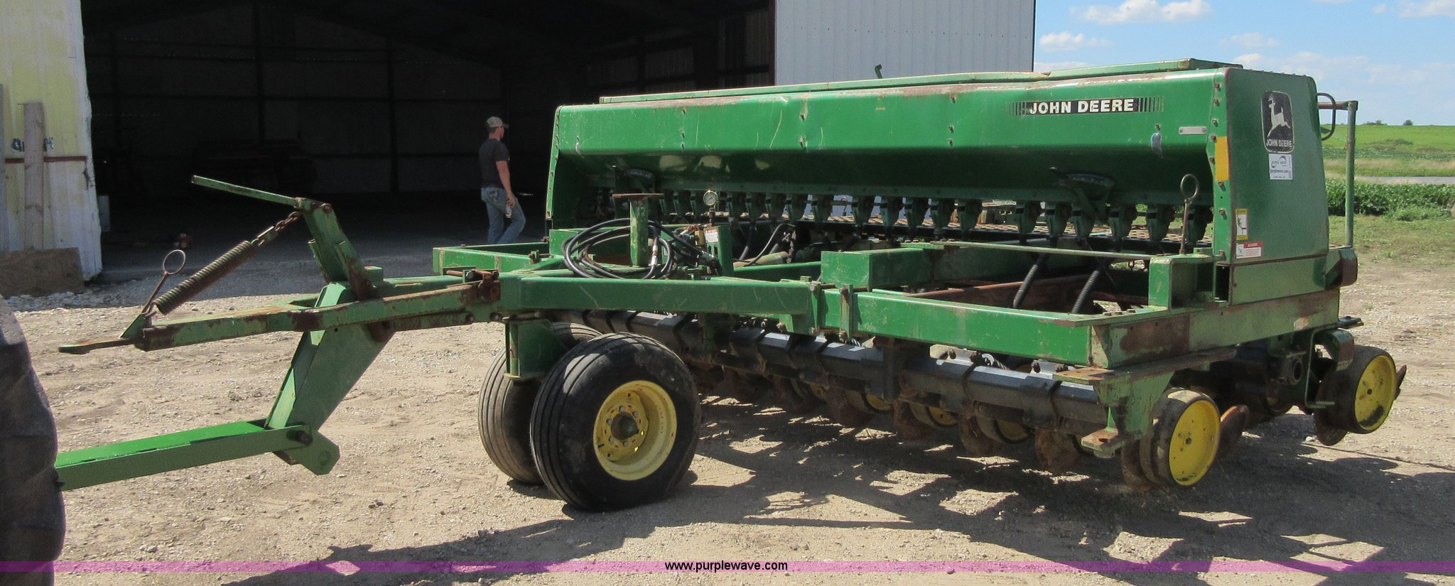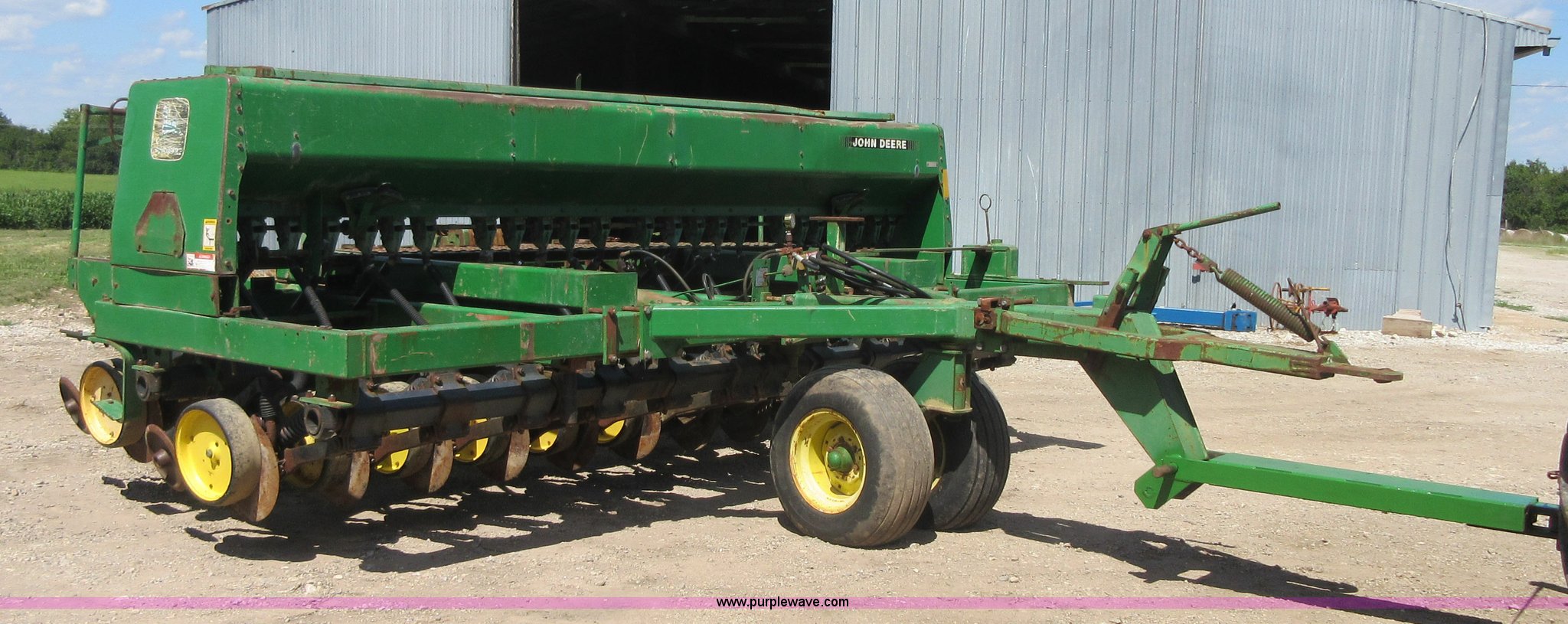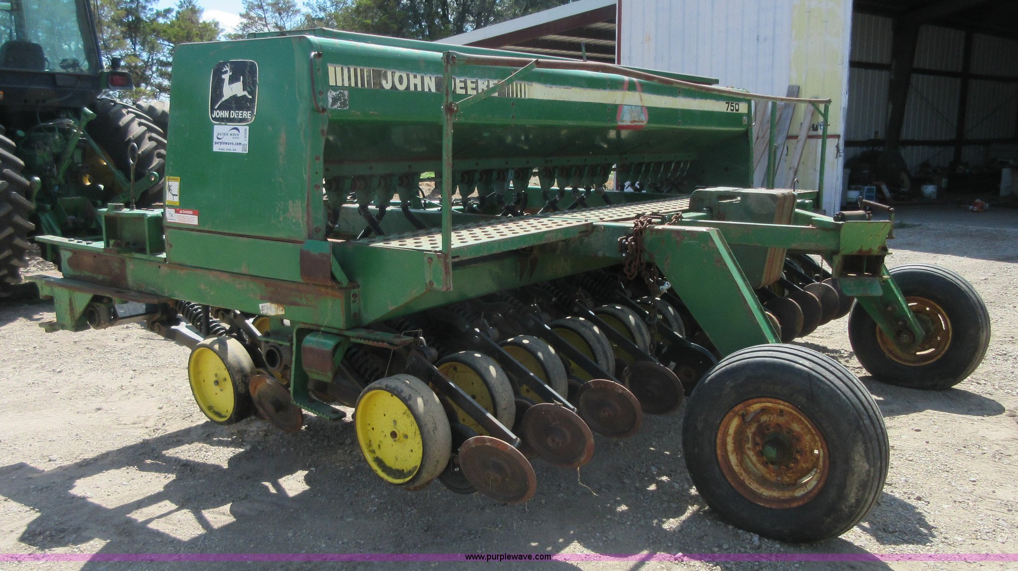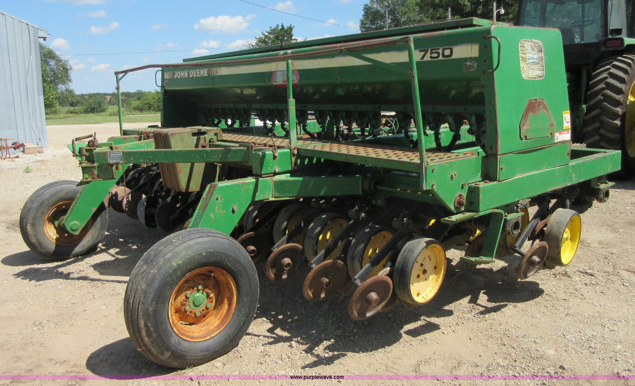 Purple Wave is selling a used Grain Drill or Seeder in Kansas. This item is a John Deere 750 grain drill with the following: 24 row units, 7.5" spacing, Bulk fill, Ground meter drive, Heavy duty spring down pressure, Single disk openers, Single press wheels, Cast closing system, Pin hitch, (4) 11L-15 transport tires, Serial N00750X007673