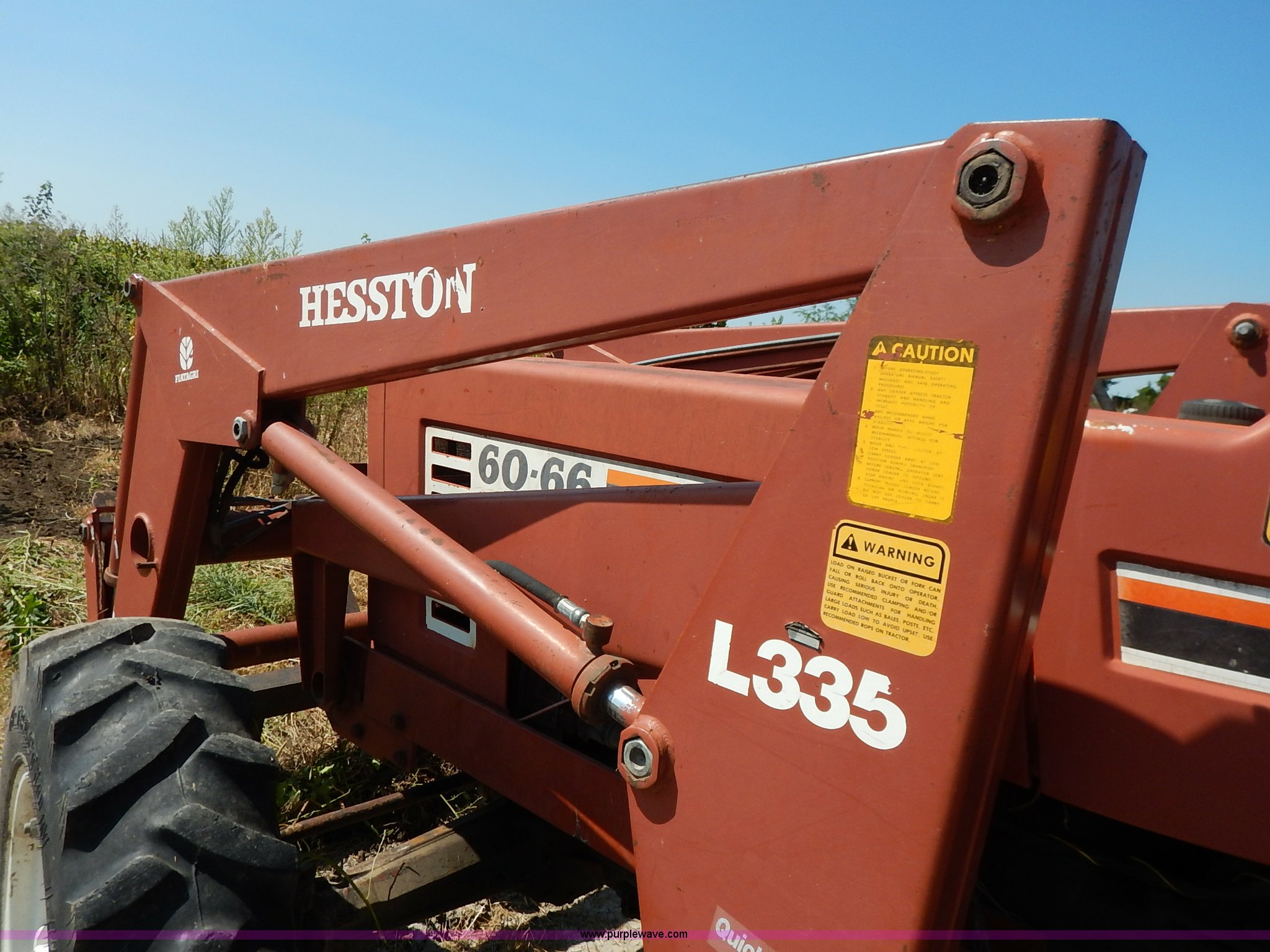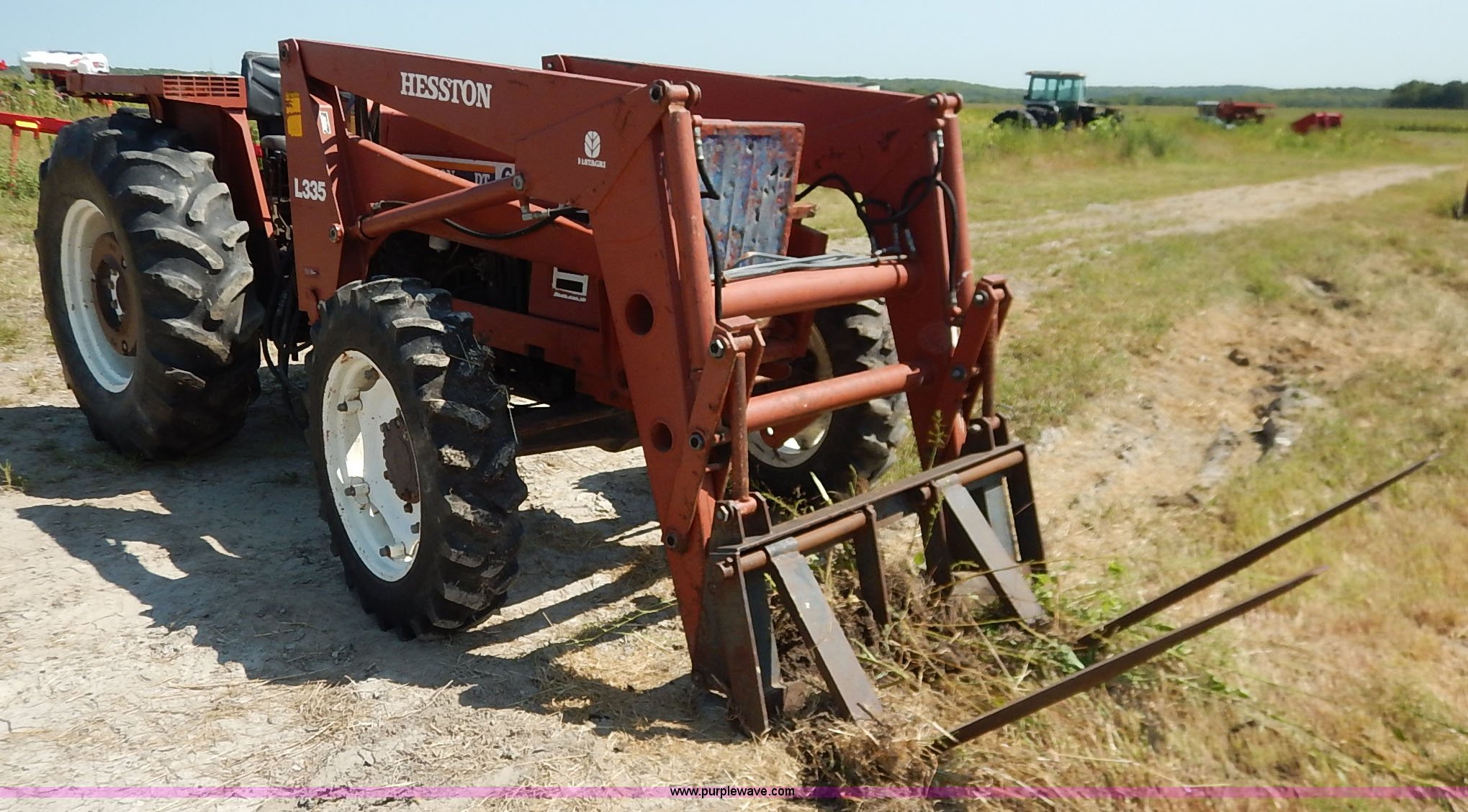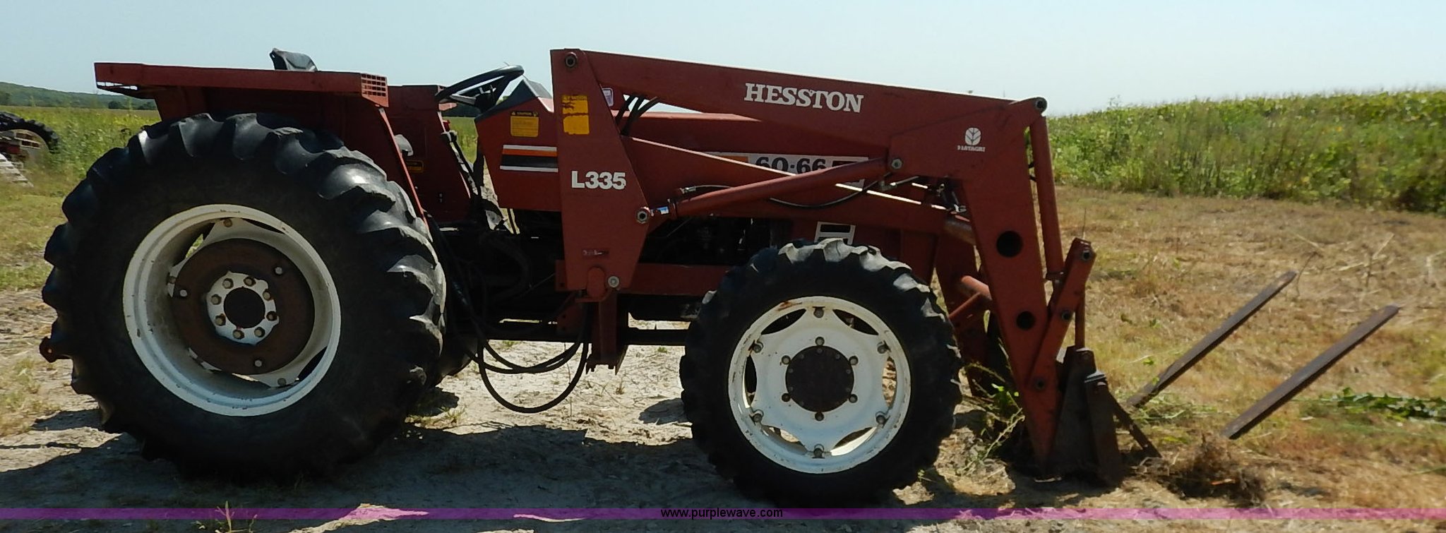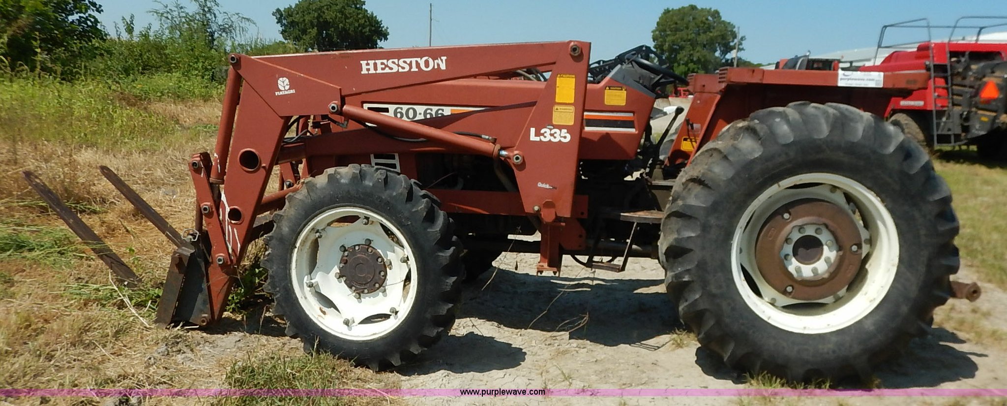 Purple Wave is selling a used Tractor in Kansas. This item is a Fiat Hesston DT60-66 MFWD tractor with the following: 4,243 hours on meter, Fiat 8035.05 2.9L three cylinder diesel engine, 60 HP, Hydrostatic transmission, 12F-4R gears, Hesston L335 loader, 5'W bucket, Weld-on cutting edge, Two-lever controls, 42" x 4" x 1.5" forks, Three point, 540 PTO, Draw bar, ISO electrical outlet, (2) rear hydraulic remotes, Wheel weights, 58" wheelbase, Titan 9.5-24 front tires, 16.9-28 rear tires, Water in fuel, Fuel injector pump needs replaced, Serial DT60-66T/12