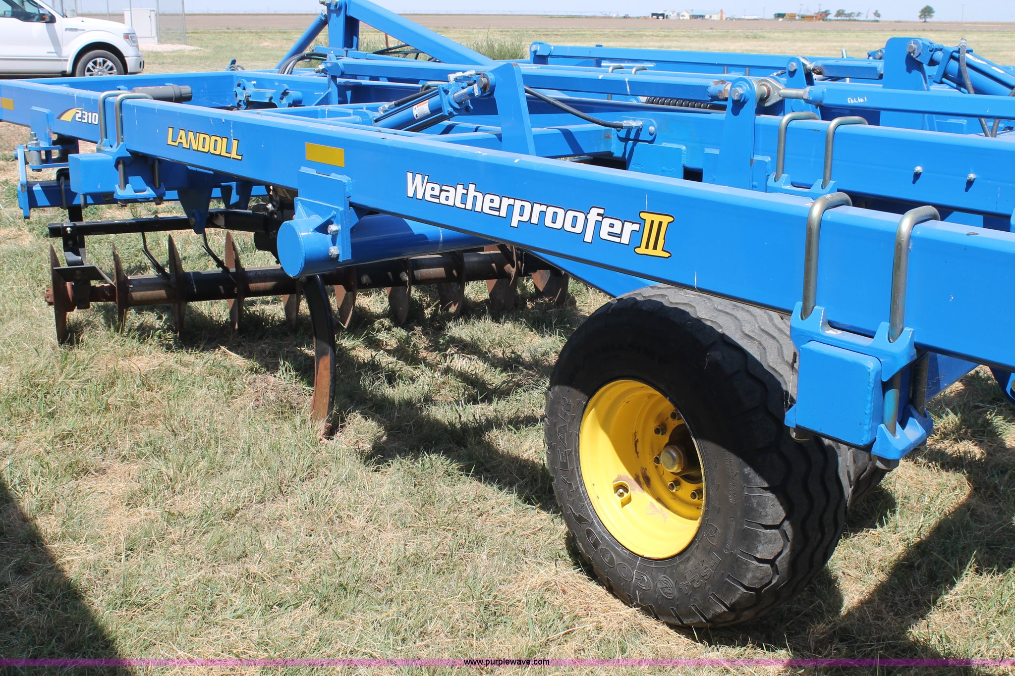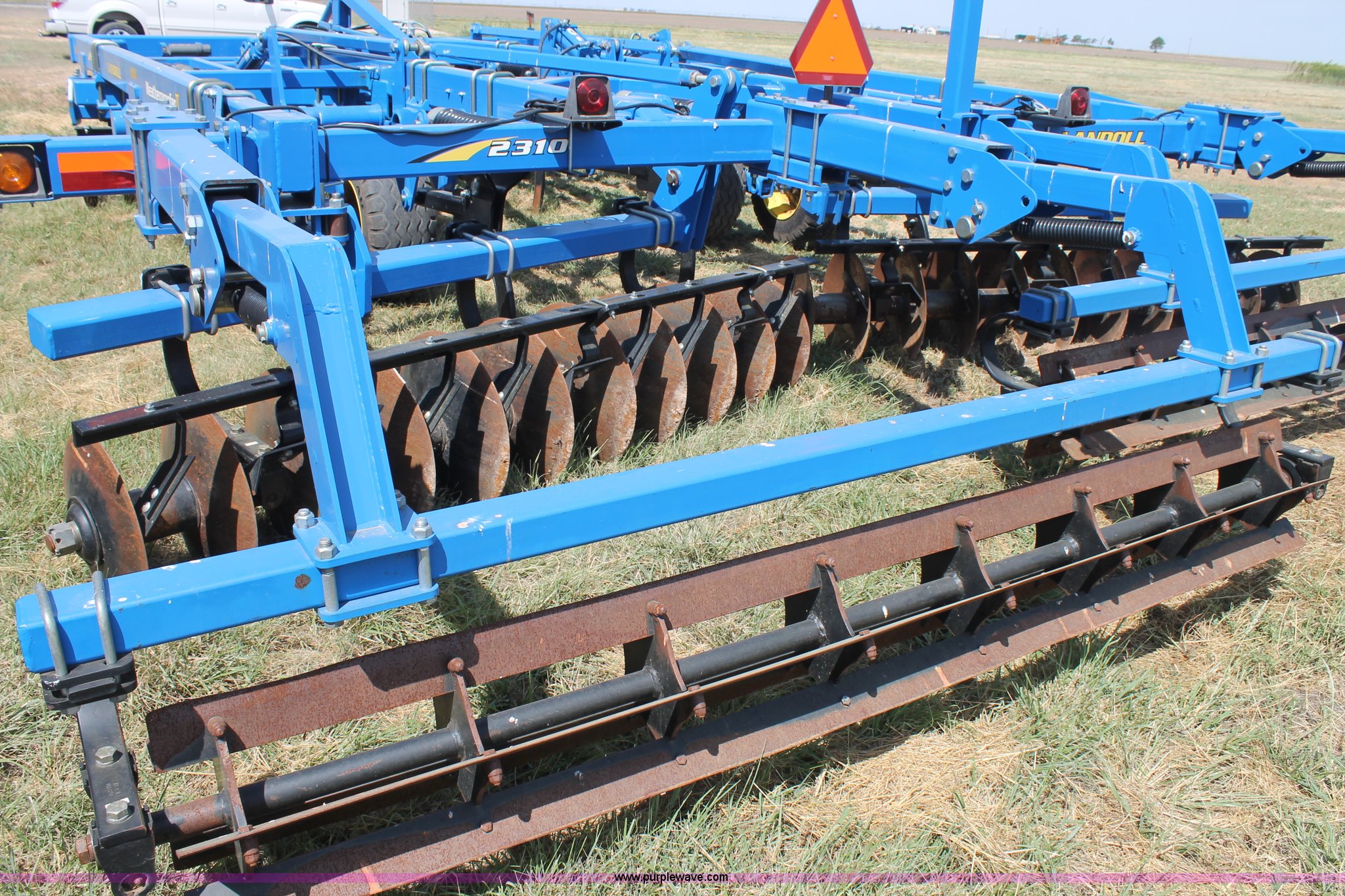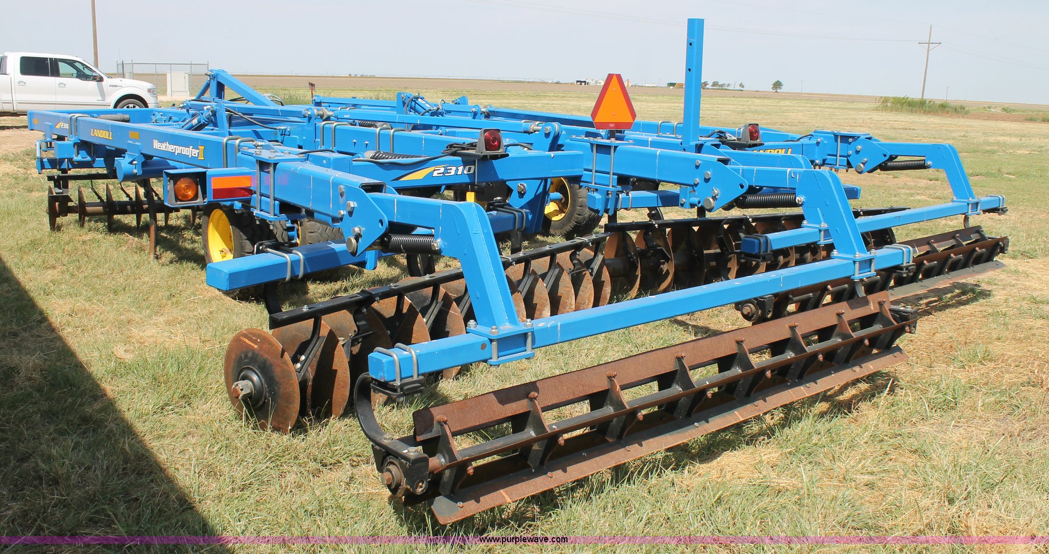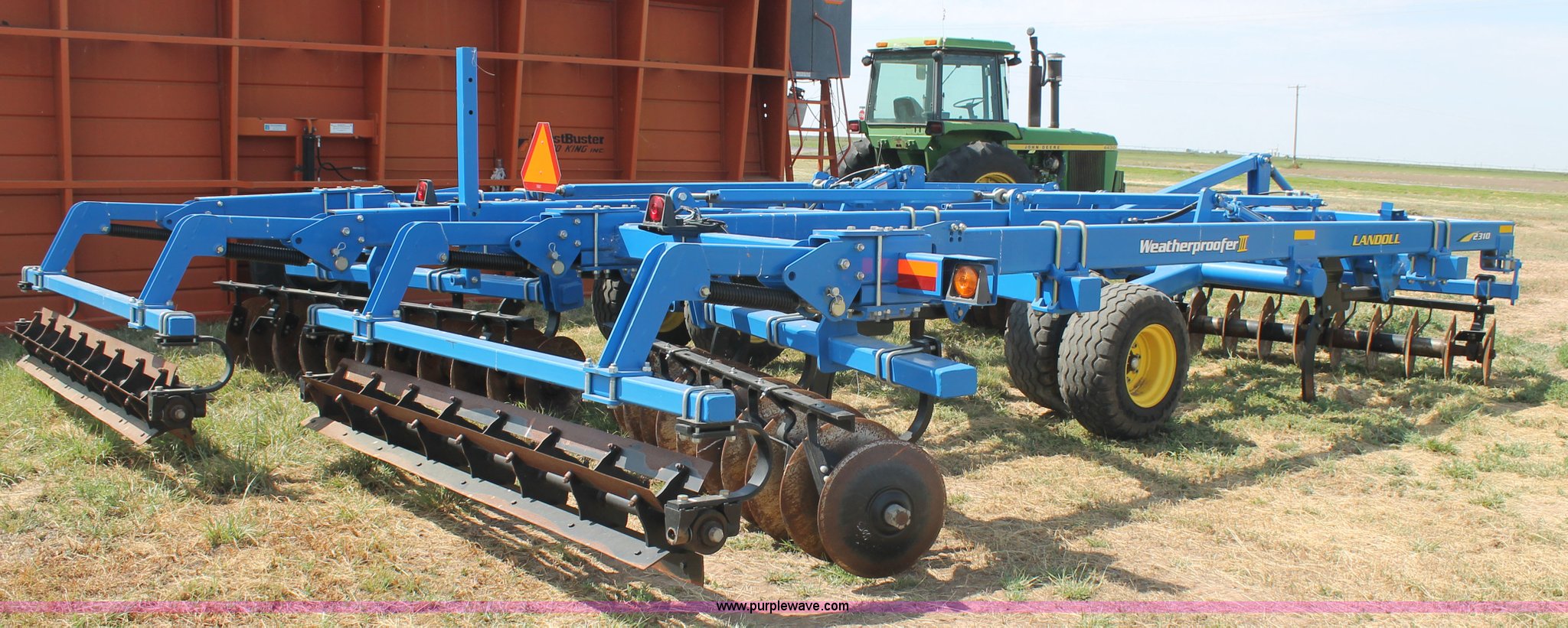 Purple Wave is selling a used Ripper in Texas. This item is a Landoll Weatherproofer III 2310 disk ripper with the following: Model 2310-7-24, 20' work width, Seven ripper, 24" spacing, Self-leveling hitch, Single point depth control, Front and rear 15 degree gang angle, Heavy scrapers, 1 3/4" gang bolt, C-cushion bearing mounts, 20.5" front gang disks, 22" rear gang disks, Adjustment/maintenance wrenches, Chopper reel attachment with spring loaded frame, Heavy spring loaded staggered rippers, Hydraulic raise and lower, 380/55R16.5 tires, Serial 23H1200170