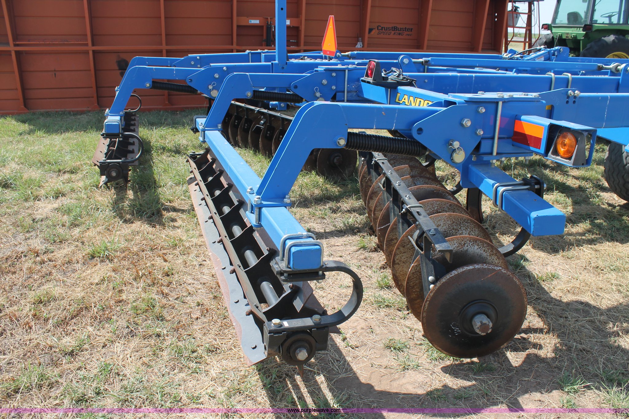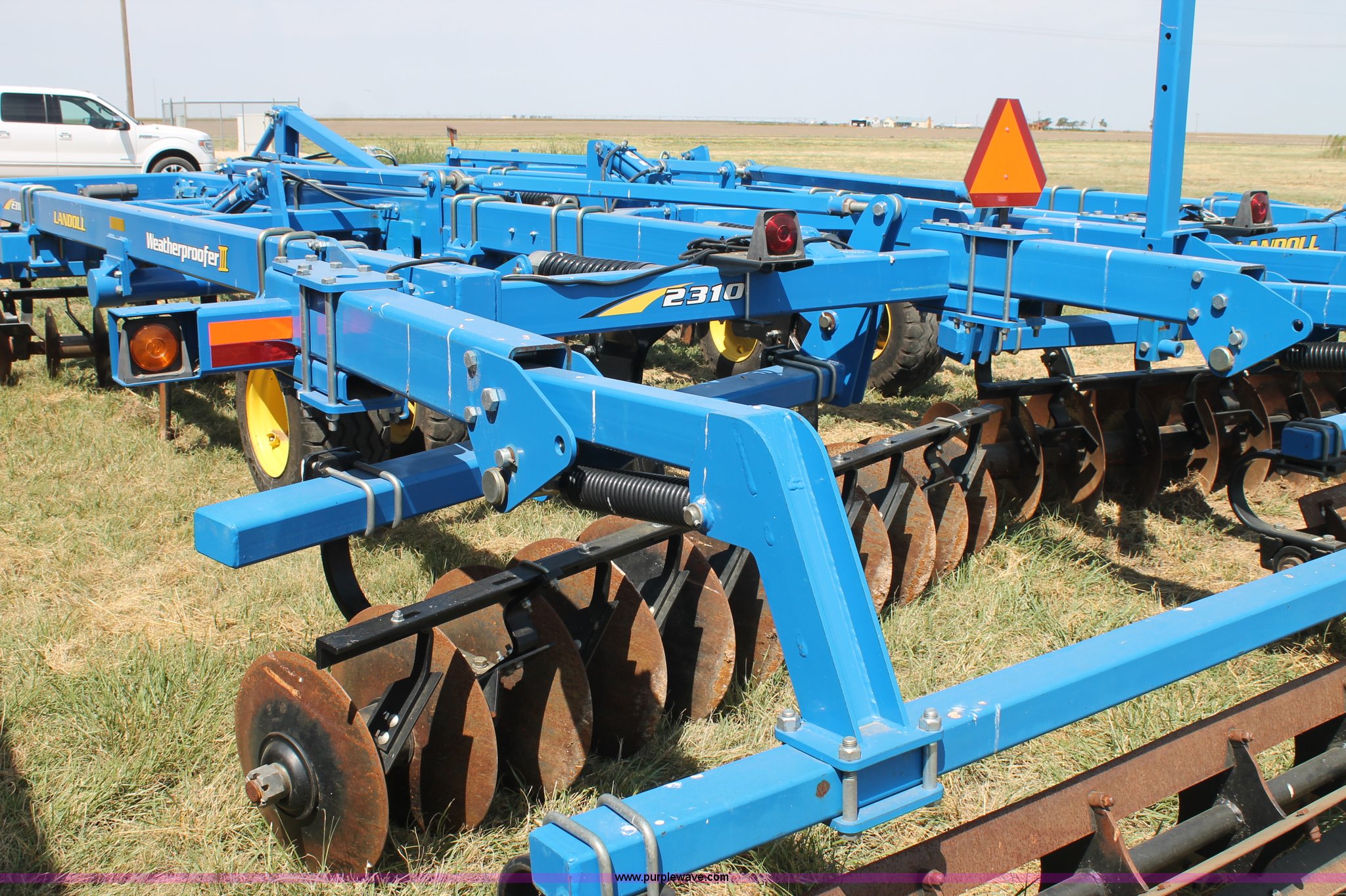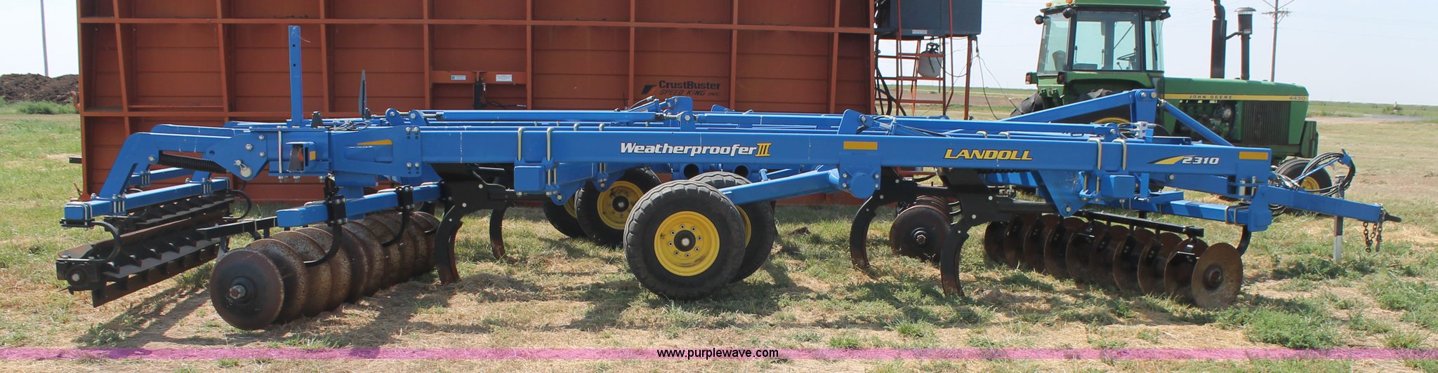 Purple Wave is selling a used Ripper in Texas. This item is a Landoll Weatherproofer III 2310 disk ripper with the following: Model 2310-7-24, 20' work width, Seven ripper, 24" spacing, Self-leveling hitch, Single point depth control, Front and rear 15 degree gang angle, Heavy scrapers, 1 3/4" gang bolt, C-cushion bearing mounts, 20.5" front gang disks, 22" rear gang disks, Adjustment/maintenance wrenches, Chopper reel attachment with spring loaded frame, Heavy spring loaded staggered rippers, Hydraulic raise and lower, 380/55R16.5 tires, Serial 23H1200170