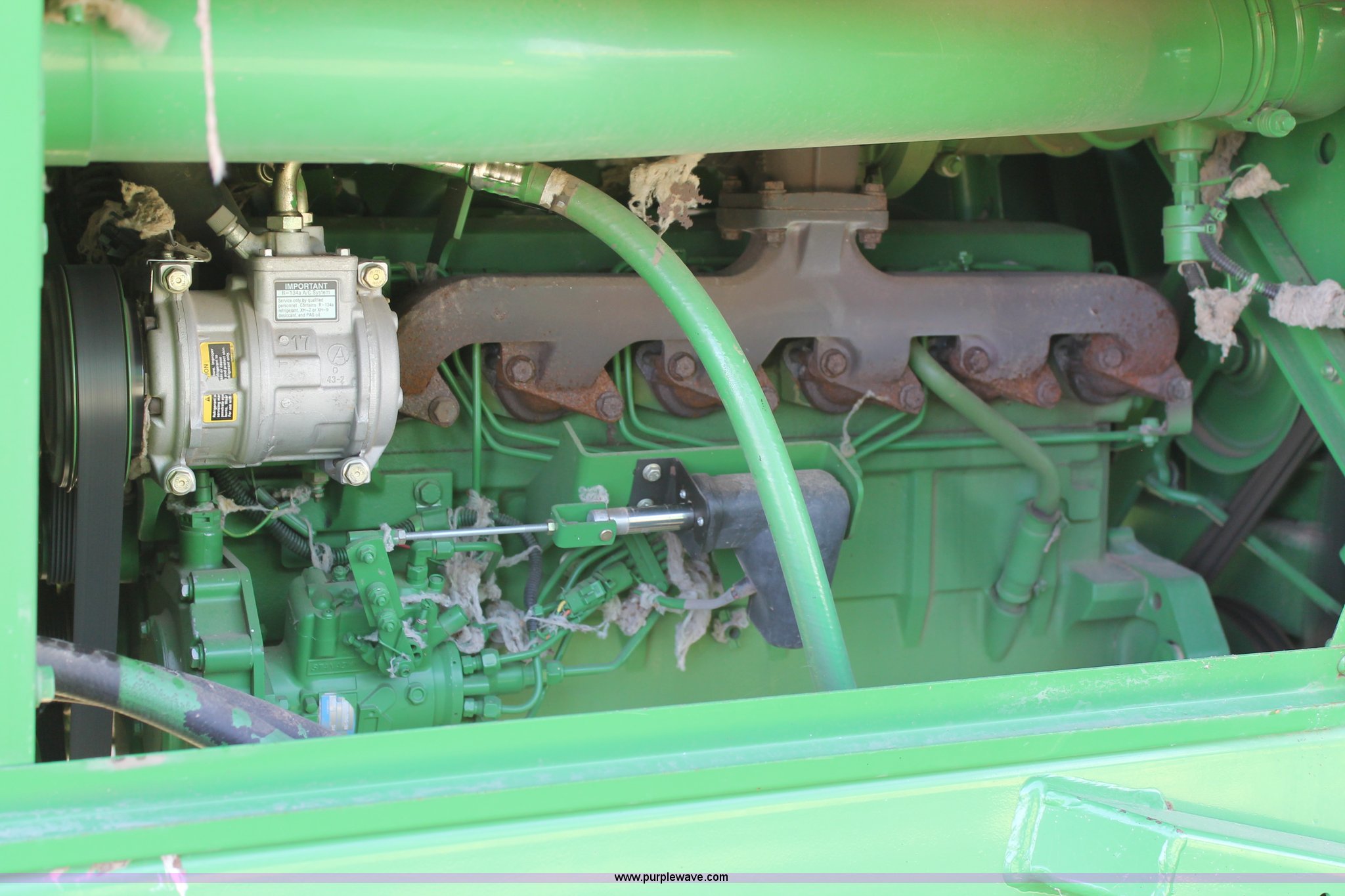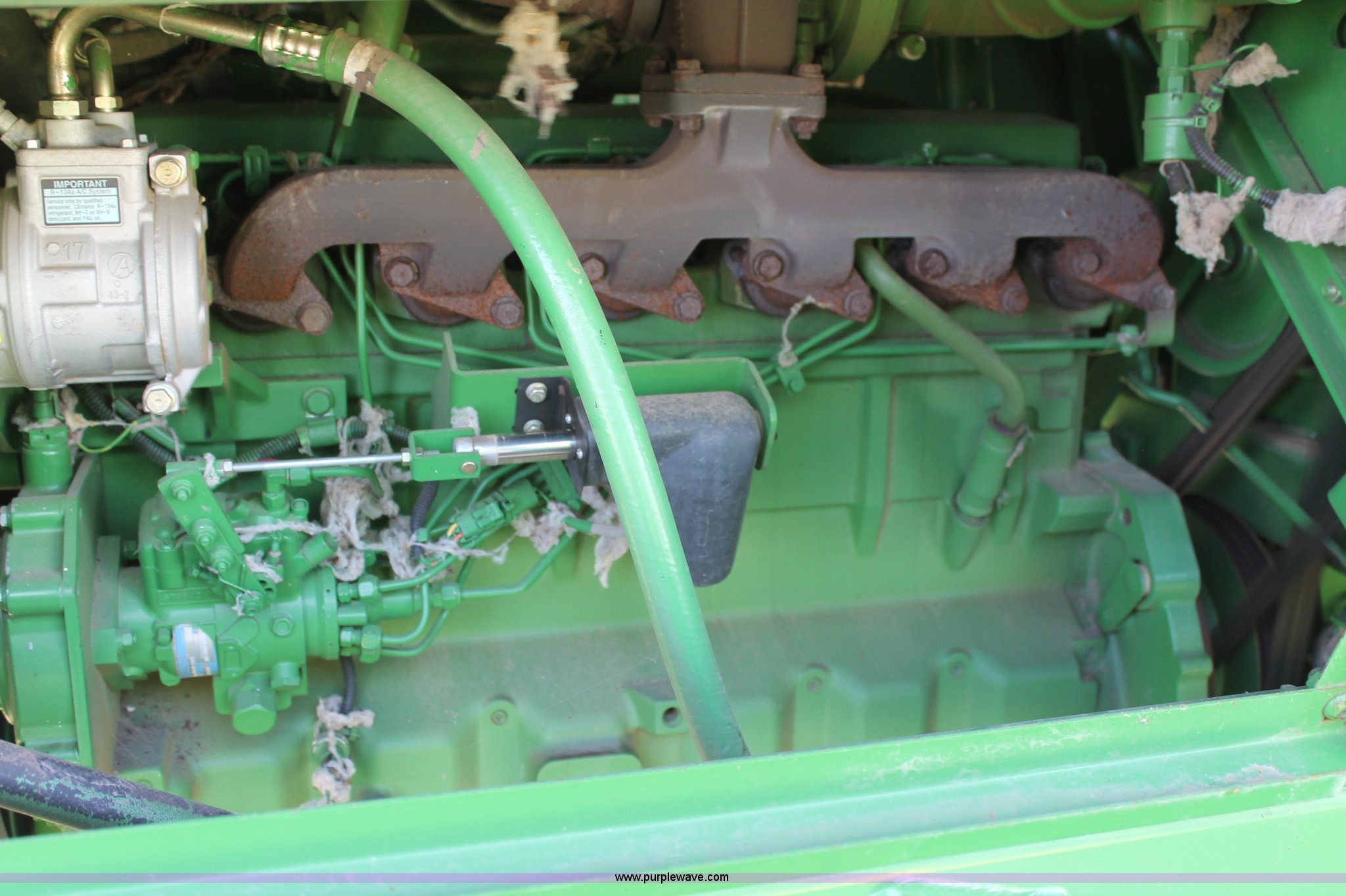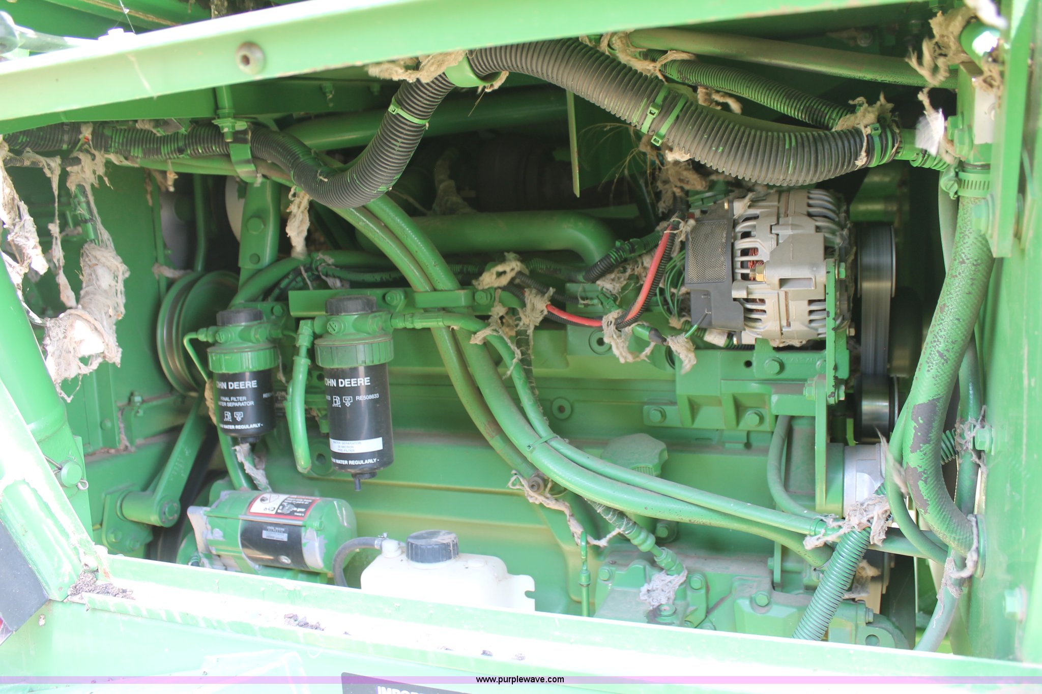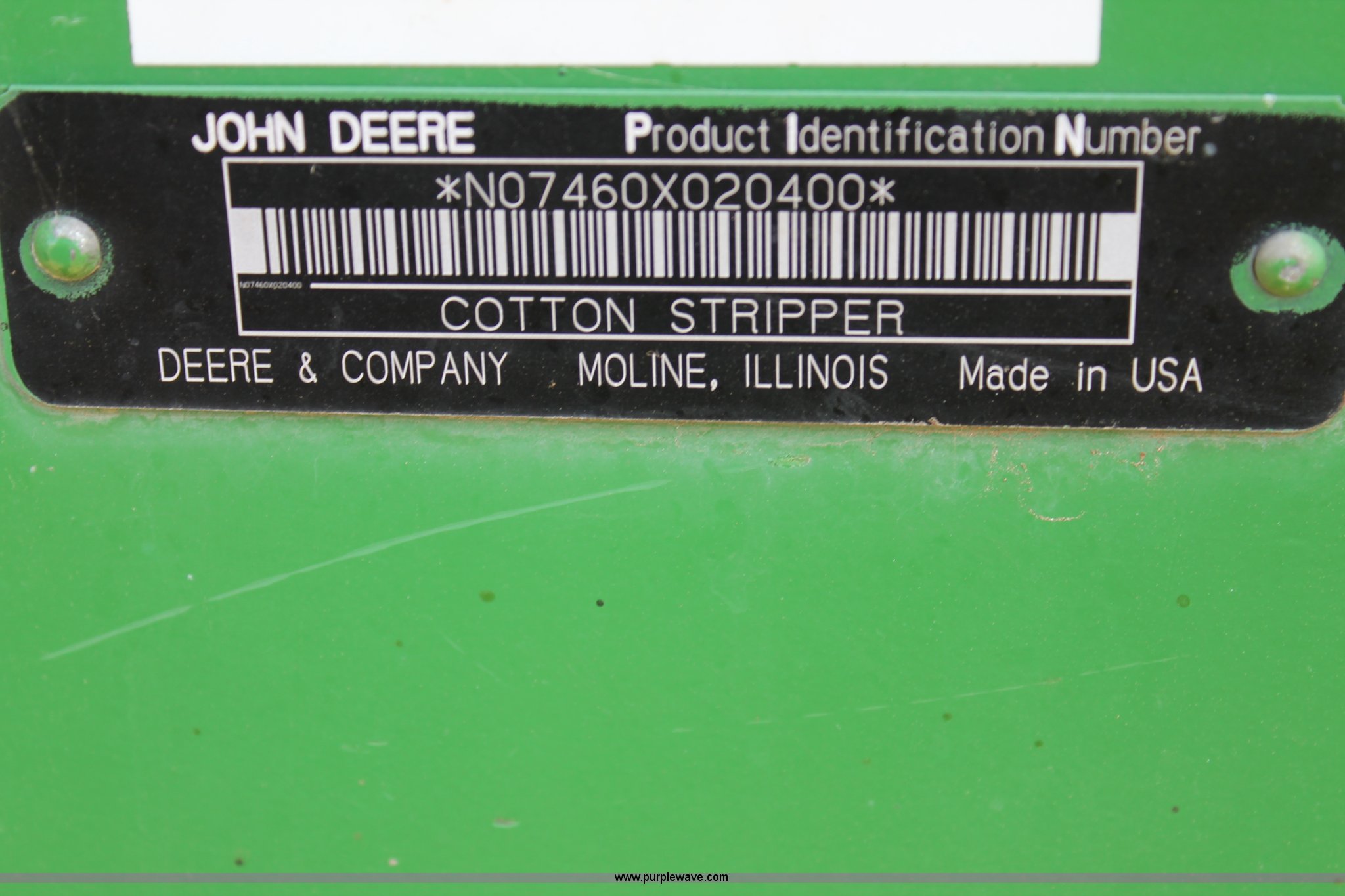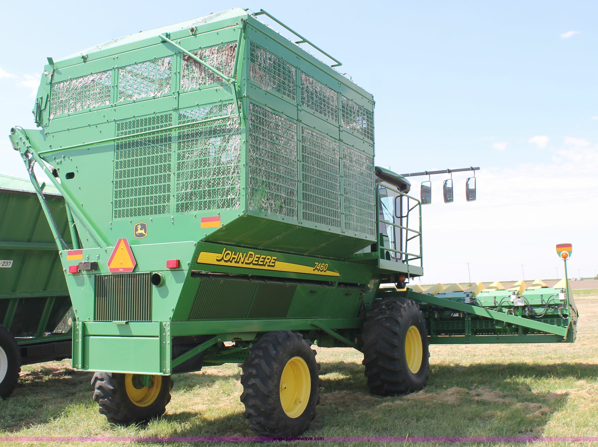 Purple Wave is selling a used Cotton Harvester Equip. in Texas. This item is a 2006 John Deere 7460 cotton stripper with the following: 1,086 engine hours on meter, 857 cleaner hours on meter, John Deere 6.8L six cylinder turbo diesel engine, Model 6068TS91440, 190 HP, Three speed hydrostatic transmission, AC and heat, AM/FM/CD, Instructor's seat, Row-trak guidance system, John Deere cotton stripper head, Eight row, 30" spacing, Stream line air system, Cleaner with trash chute, 60" saw, Oiler for saws, Van computation and unloading system, 808 cu. ft. basket capacity, 120 gallon fuel tank, 23.1-26 front tires, 14.9-24 rear tires, Operators manual, Serial N07460X020400