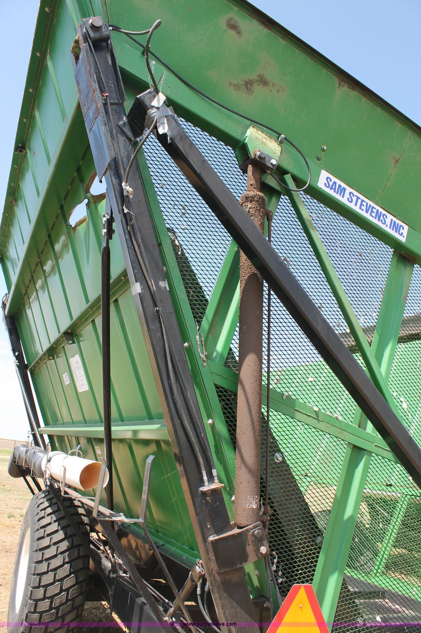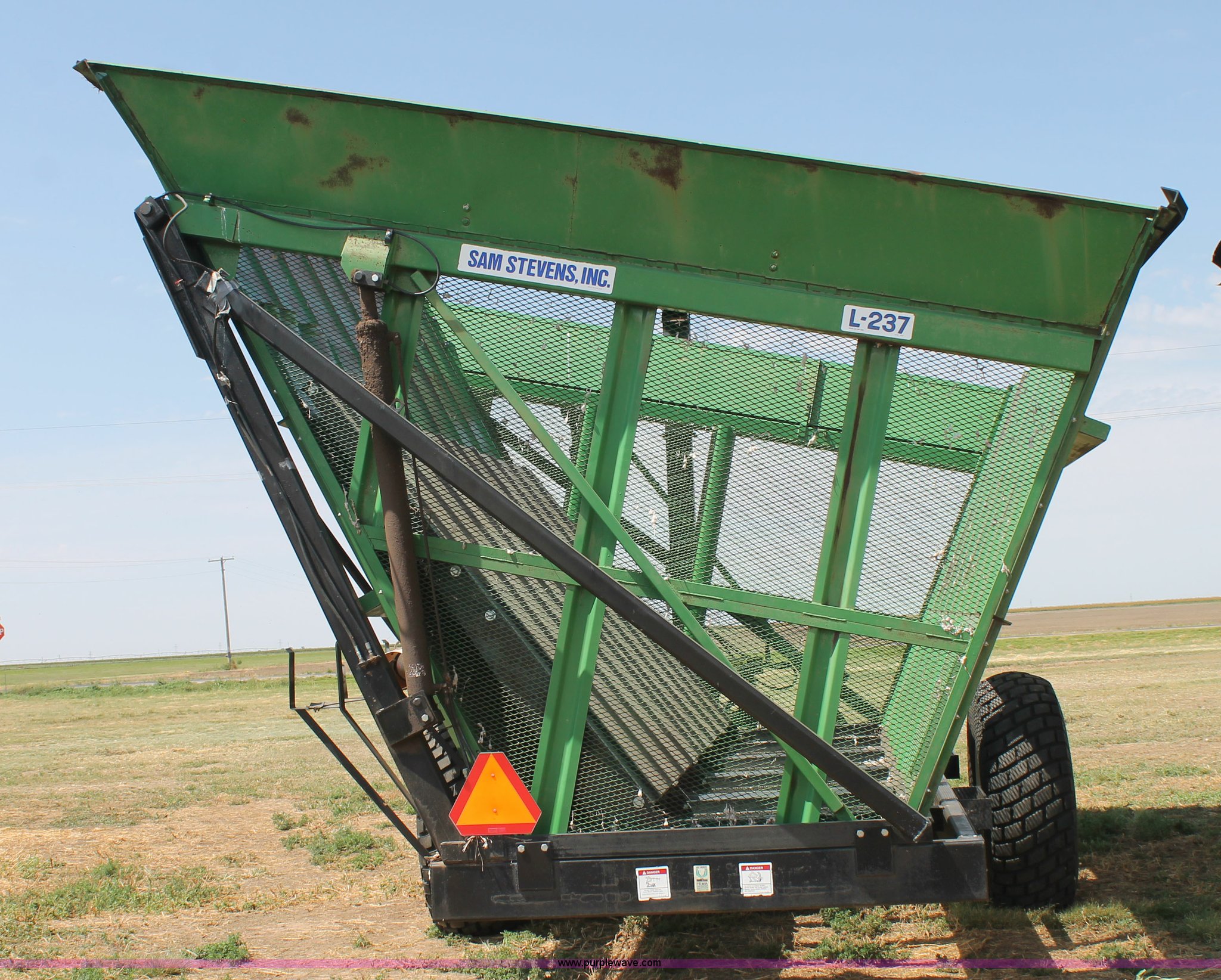 Sam-stevens L-237 boll buggy. Hydraulic pac and dump, Vac clean-up system, Over top ball hitch, 18.4-26 tires, Sheet metal damage on dump side, Serial TOV6035. 3 Sides Farms. 4819 FM 809. Wildorado, TX 79098