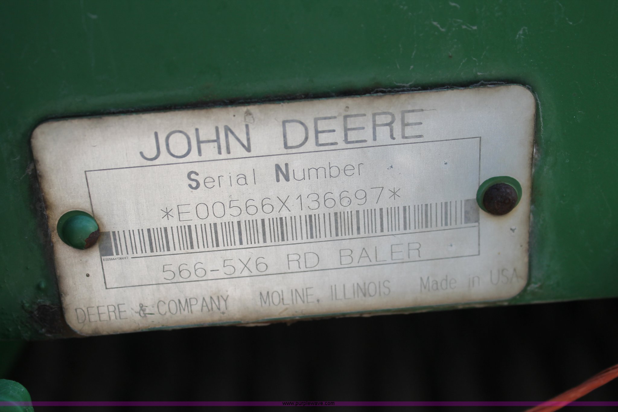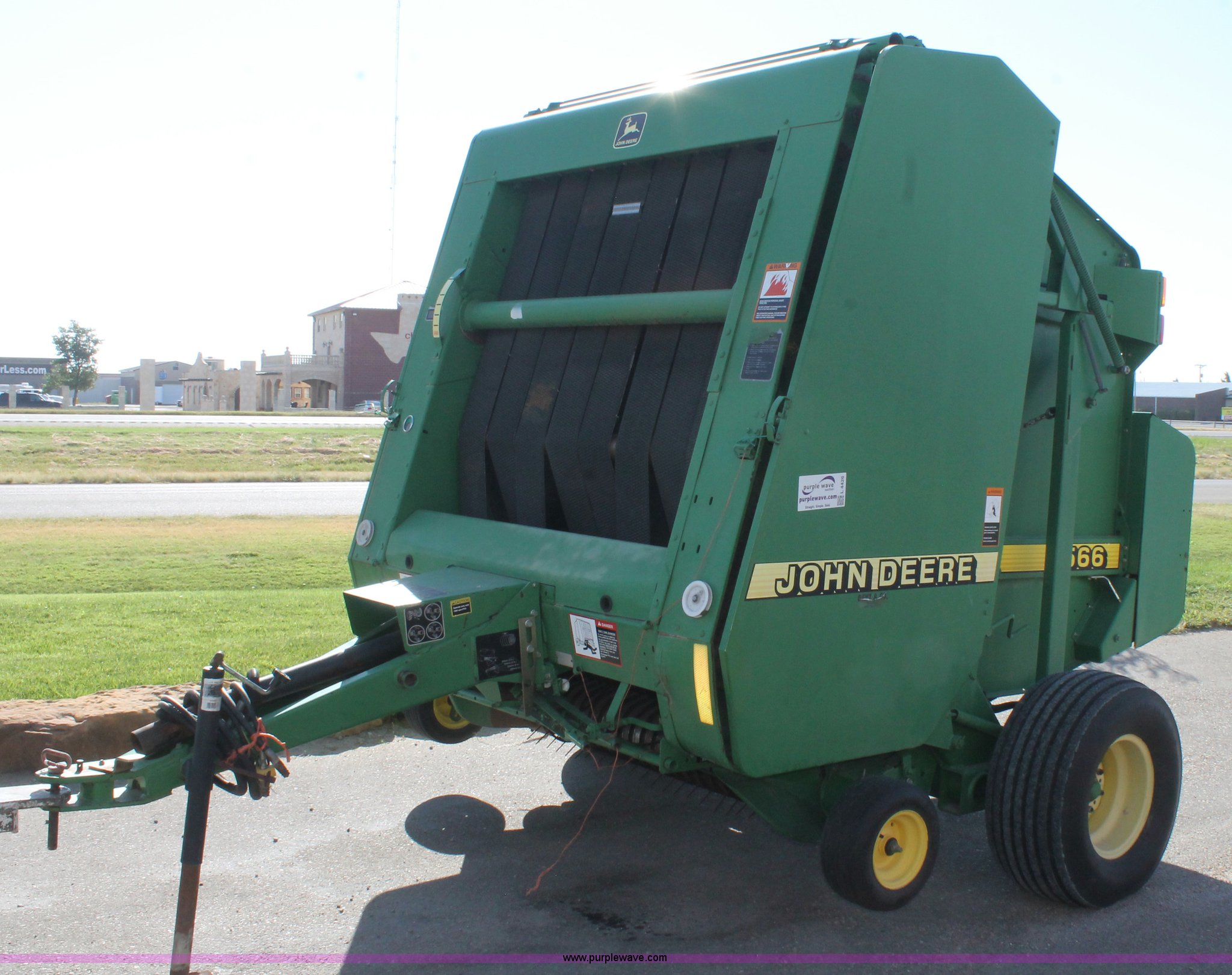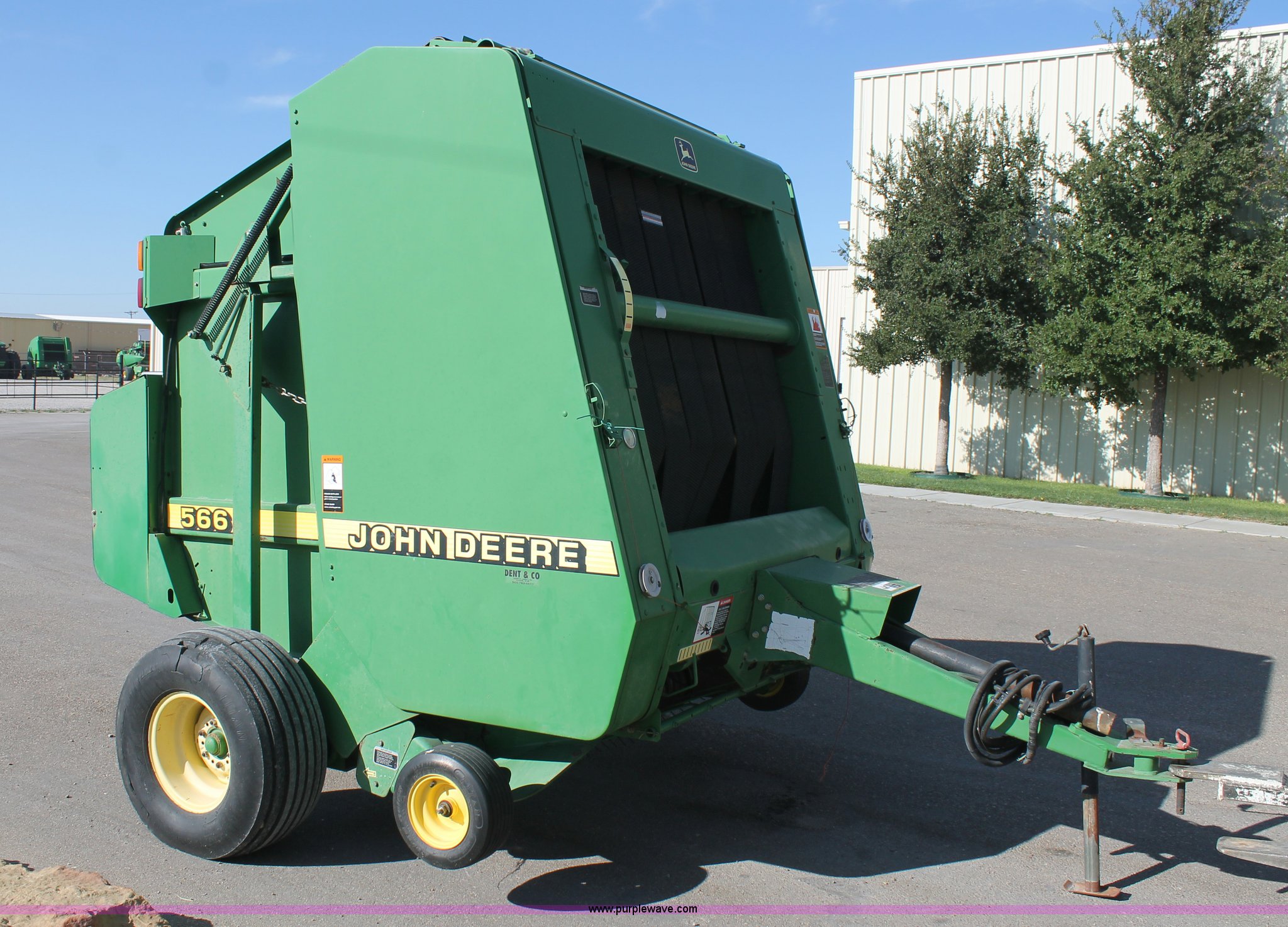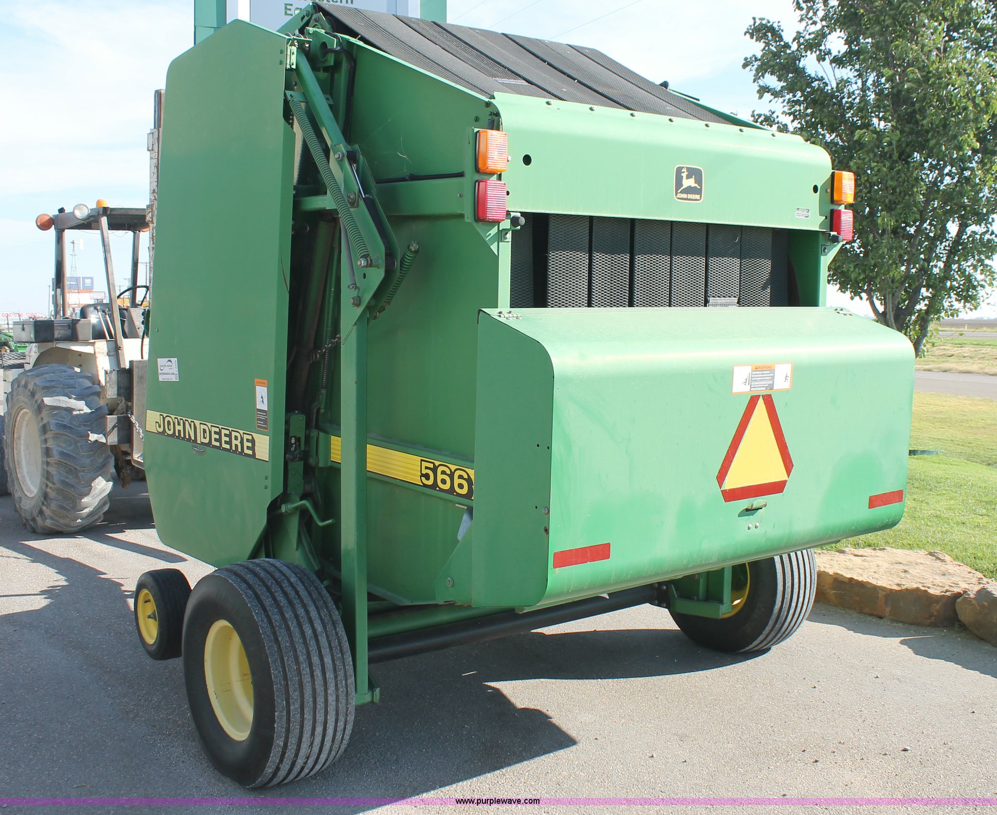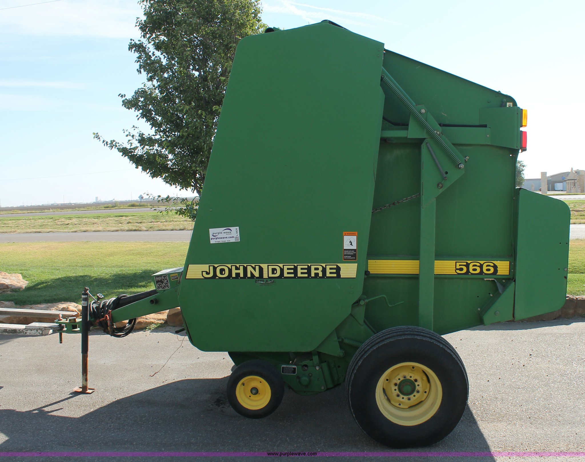 Purple Wave is selling a used Round Baler in Texas. This item is a 1999 John Deere 566 round baler with the following: 5' x 6' bale capacity, John Deere monitor, 5'W pickup, Gauge wheels, Twin twine tie or net-wrap, Bale kicker, John Deere monitor, Transport lights, 1000 PTO, Pin hitch, 31x13.5 hi-flotation tires, 8 PR, 13,124 bale count, Serial E00566X136697