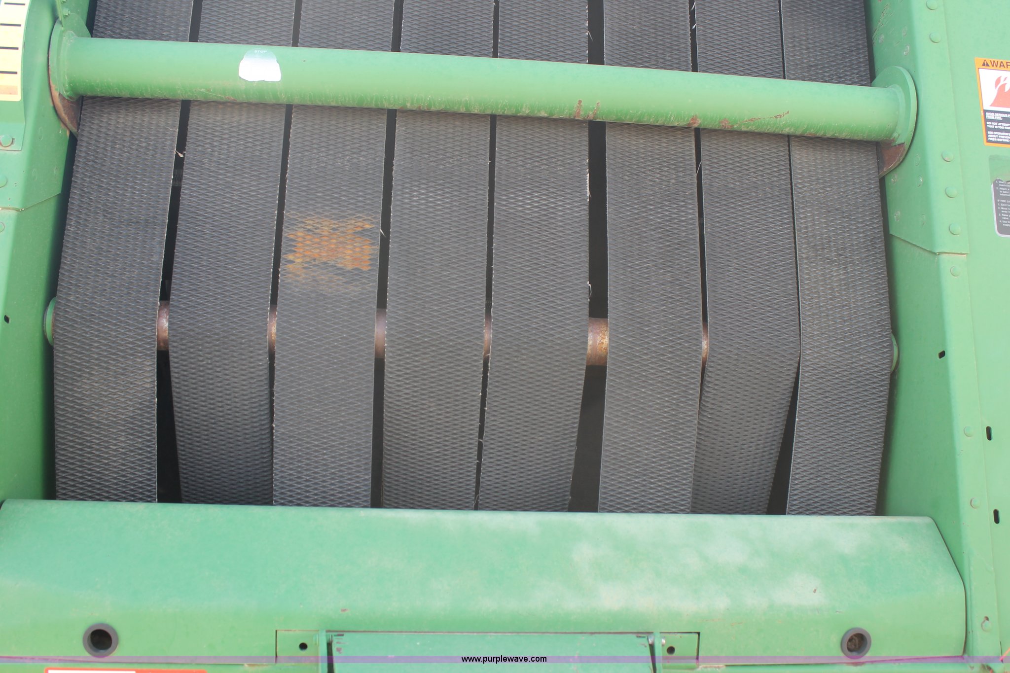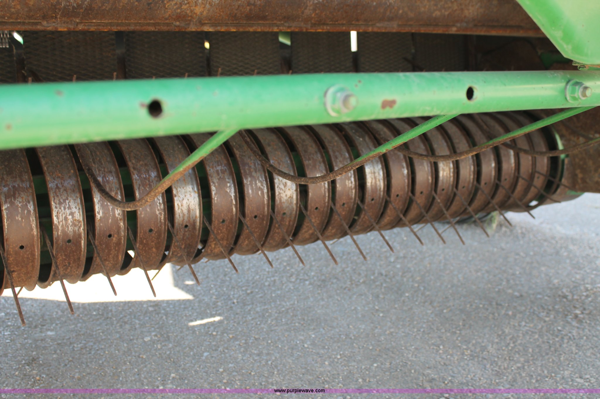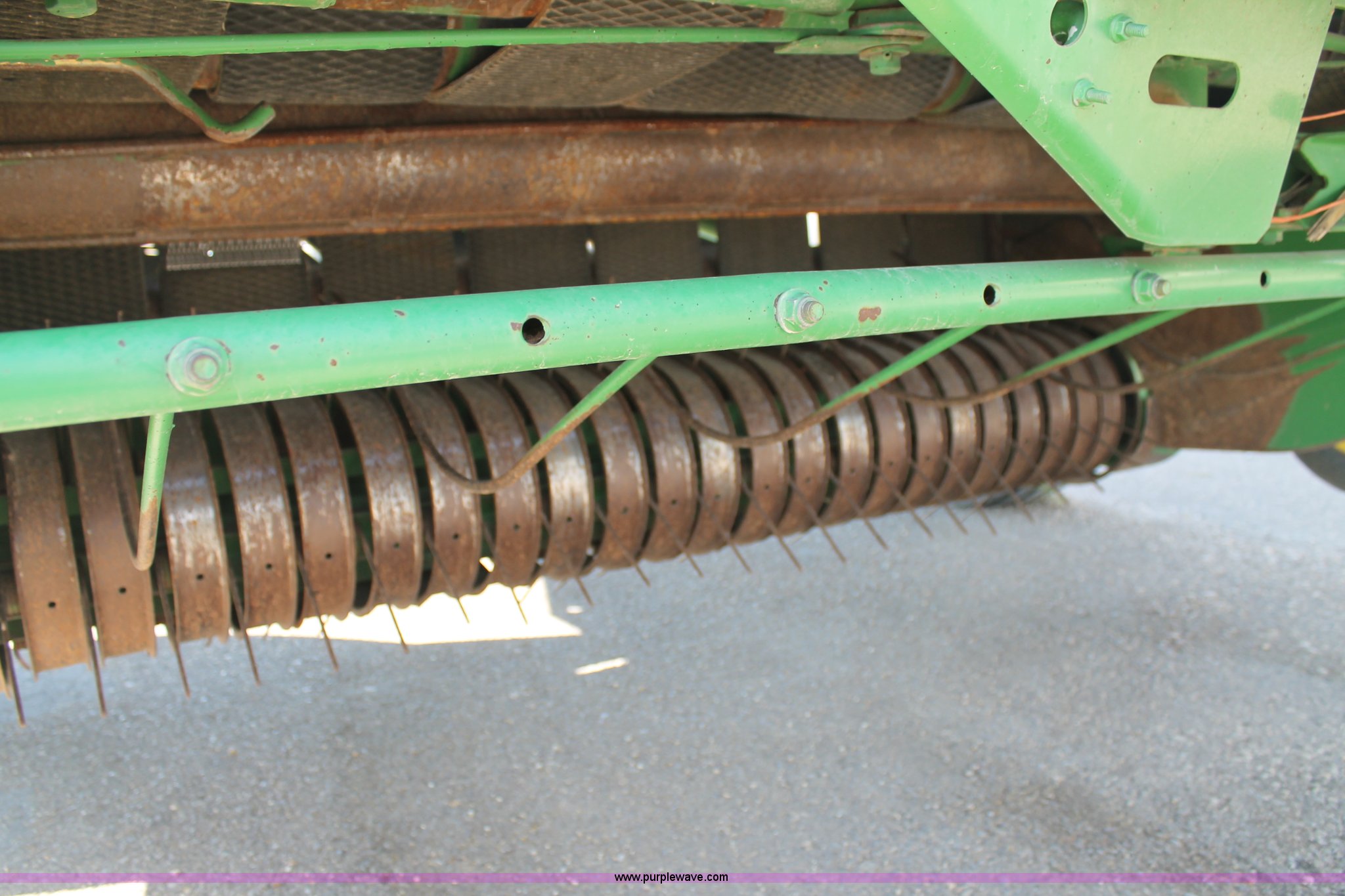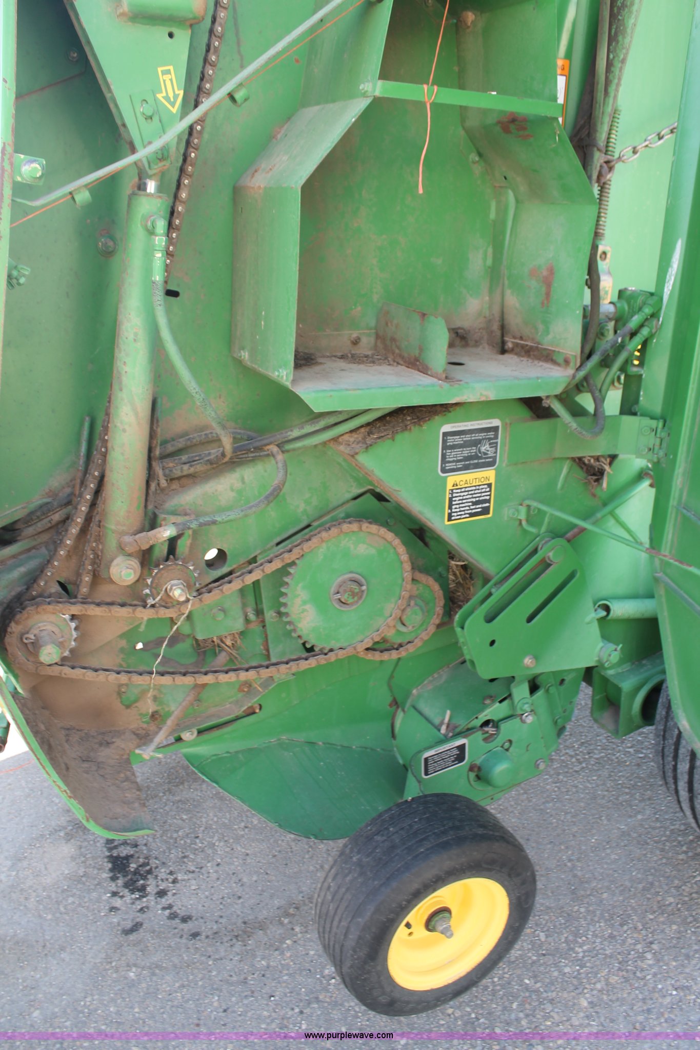 Purple Wave is selling a used Round Baler in Texas. This item is a 1999 John Deere 566 round baler with the following: 5' x 6' bale capacity, John Deere monitor, 5'W pickup, Gauge wheels, Twin twine tie or net-wrap, Bale kicker, John Deere monitor, Transport lights, 1000 PTO, Pin hitch, 31x13.5 hi-flotation tires, 8 PR, 13,124 bale count, Serial E00566X136697