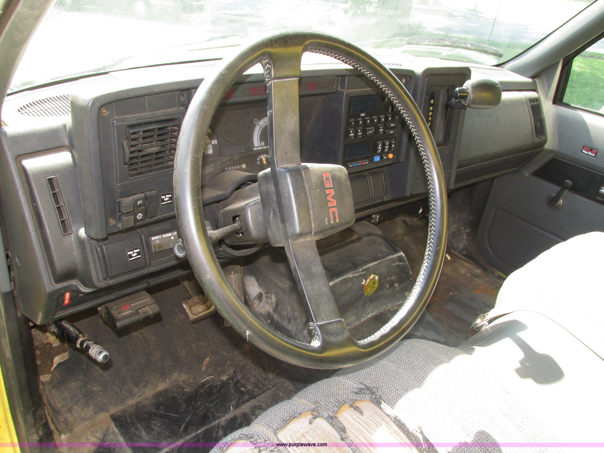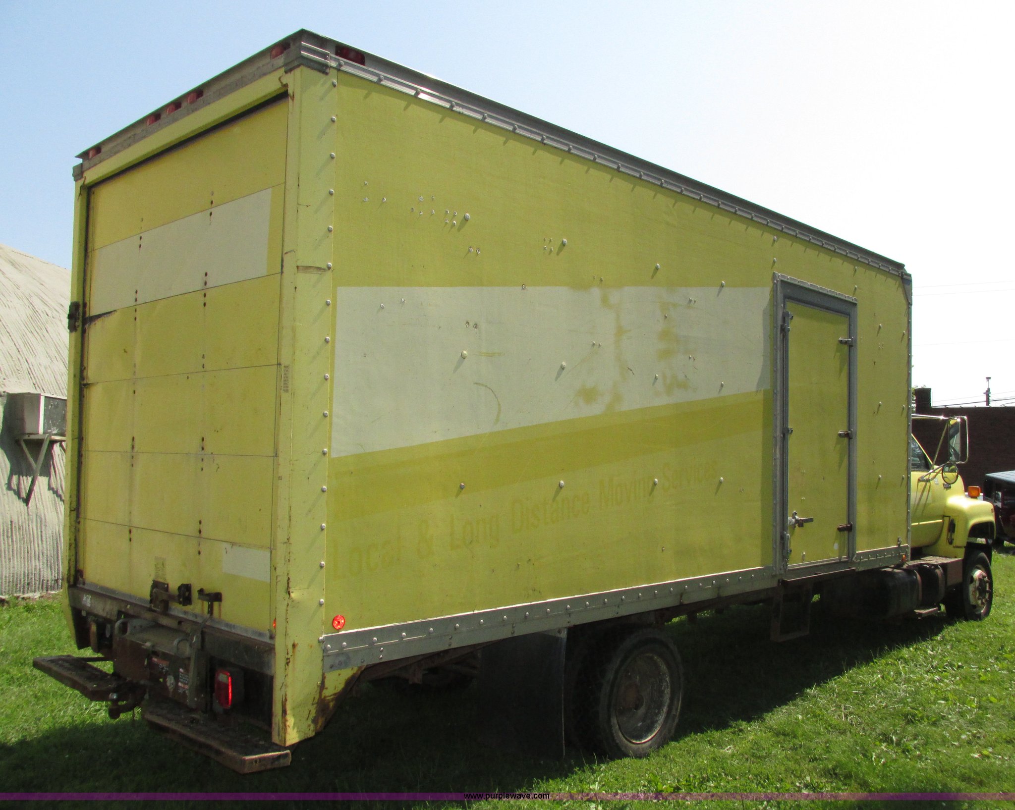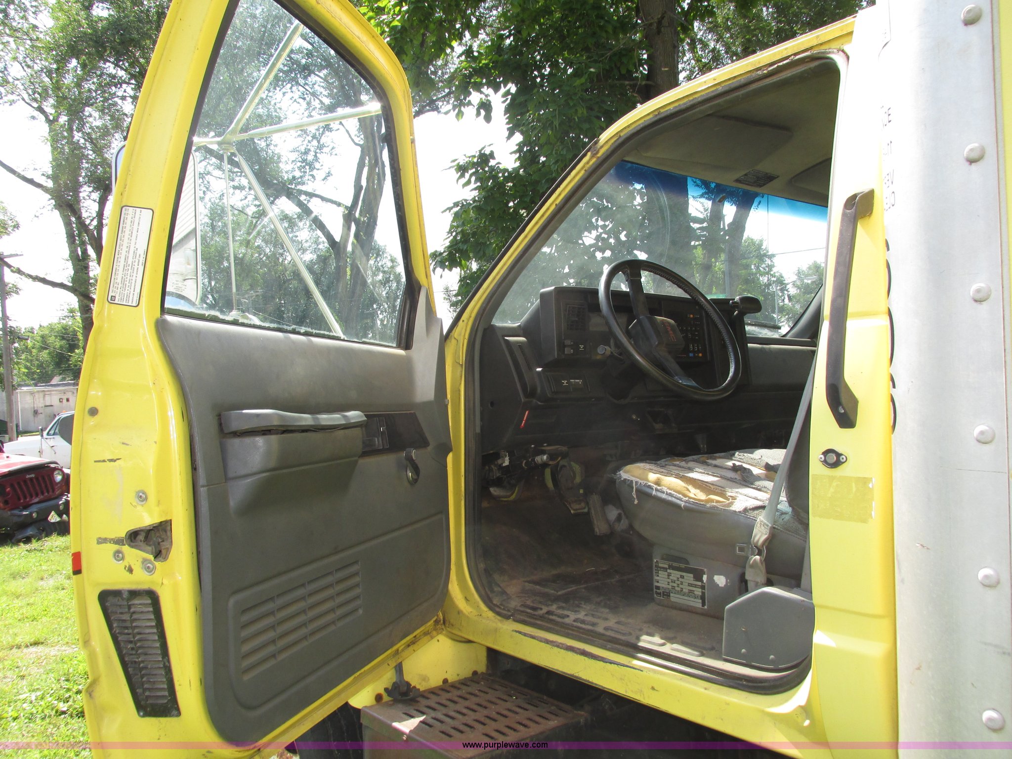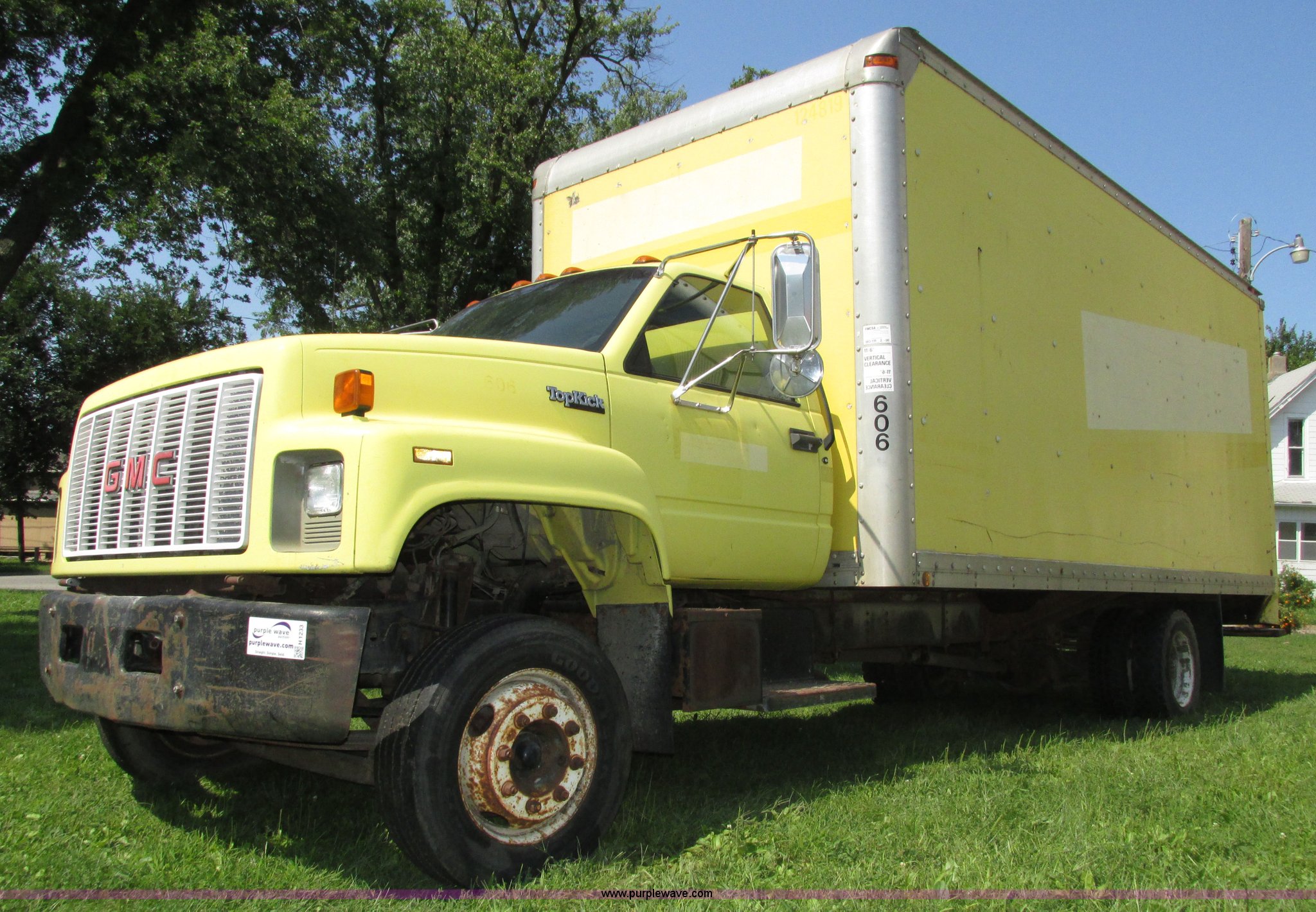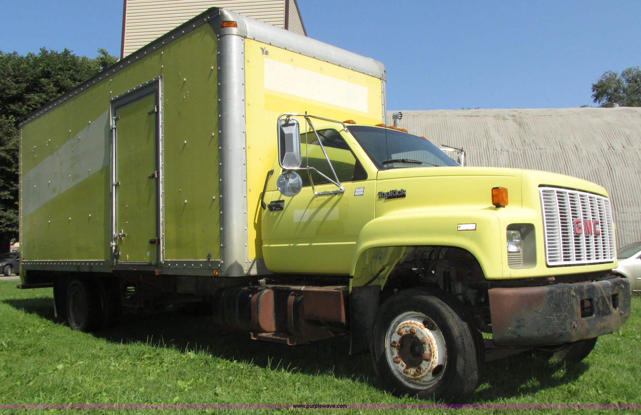 Purple Wave is selling a used Box Truck in Nebraska. This item is a 1992 GMC TopKick box truck with the following: 142,487 miles on odometer, Miles may vary, still in use, 6.0L V8 gas engine, Automatic transmission, Single axle, Heat, AM/FM, Suspension seat, Cloth interior, Draw Tite Actuator II brake controller, Backup alarm, Highway safety triangle, Grumman box bed, 20'L x 95"W I.D., 11.5' O.D. max height, Roll up rear door, Swing side door, 11.5'L x 24" I.D., Wood floor, Interior box lighting, 7" step bumper, 22"H, Pintle hitch, 2" ball hitch, Serial S7373FSG92-20W, Mud flaps, Spring suspension, Hydraulic brakes, 226" wheelbase, Goodyear 245/70R19.5 front tires, Hercules 245/70R19.5 rear tires, GVWR 23,900 lbs, FAWR 7,000 lbs, RAWR 16,900 lbs, (2) holes in floor, Seat torn