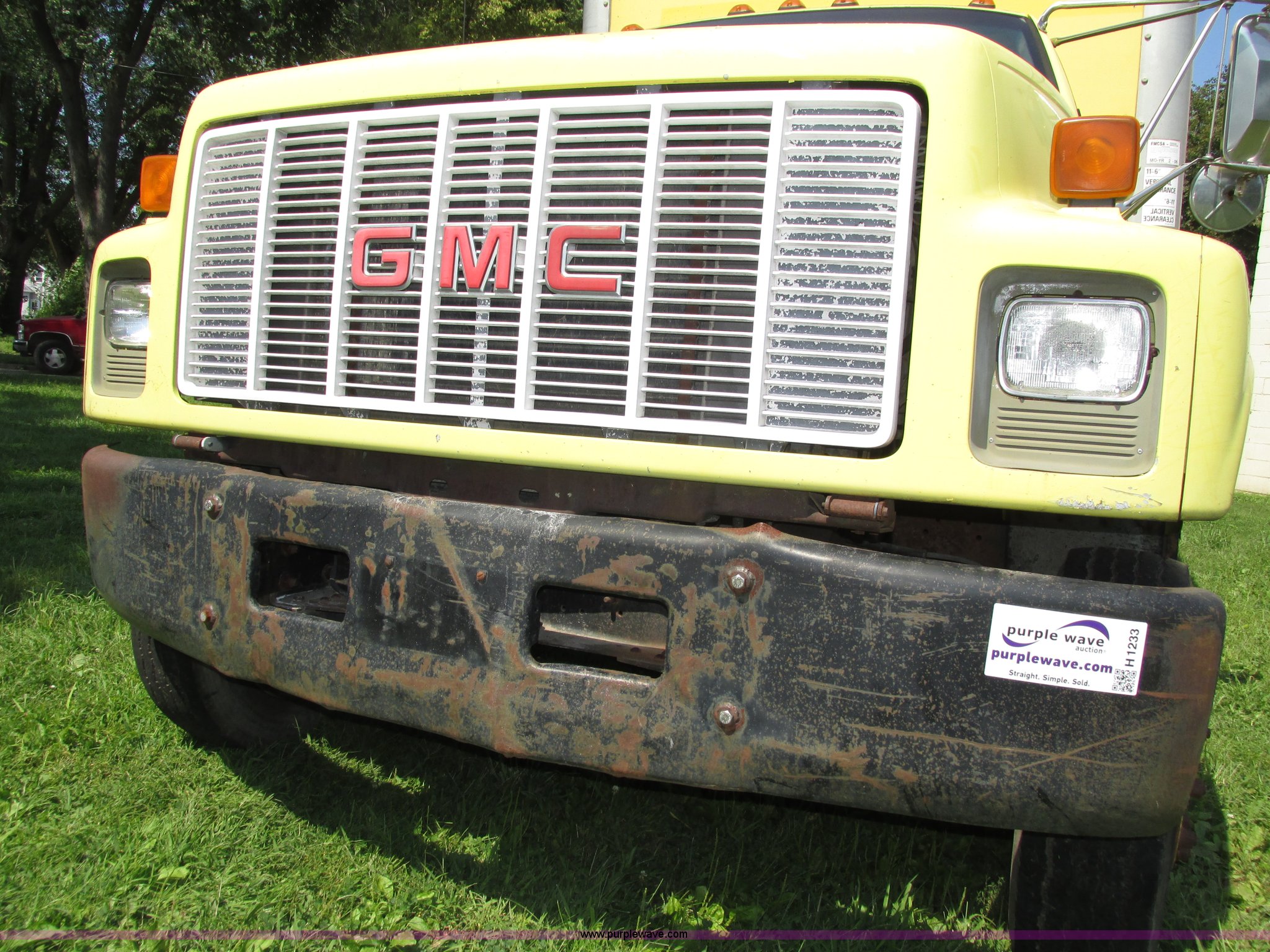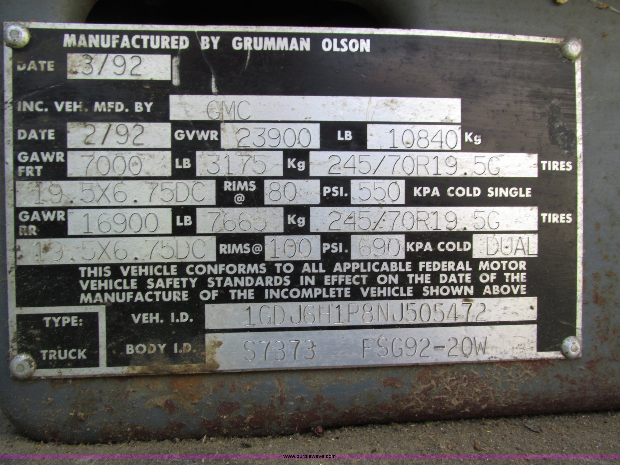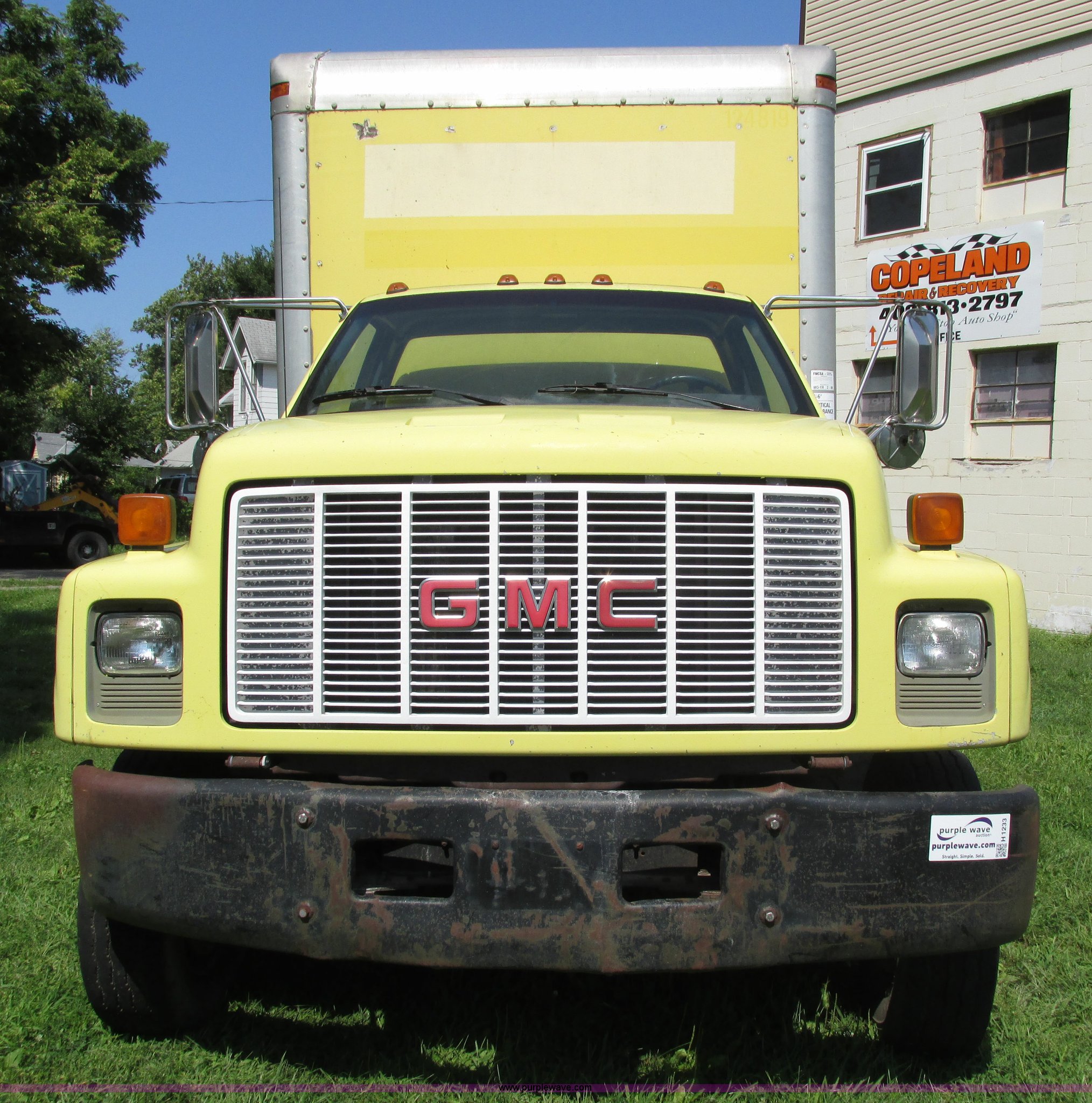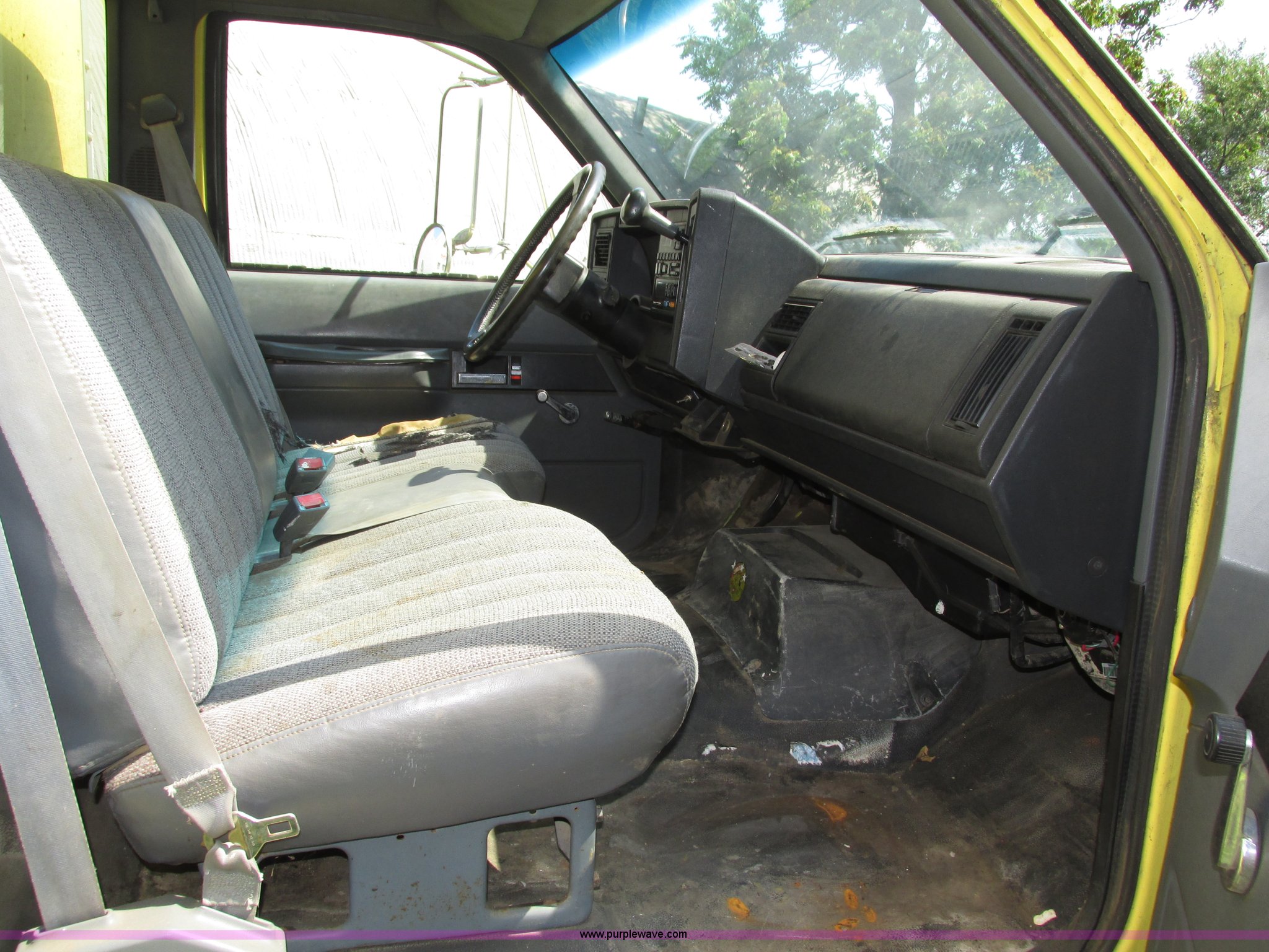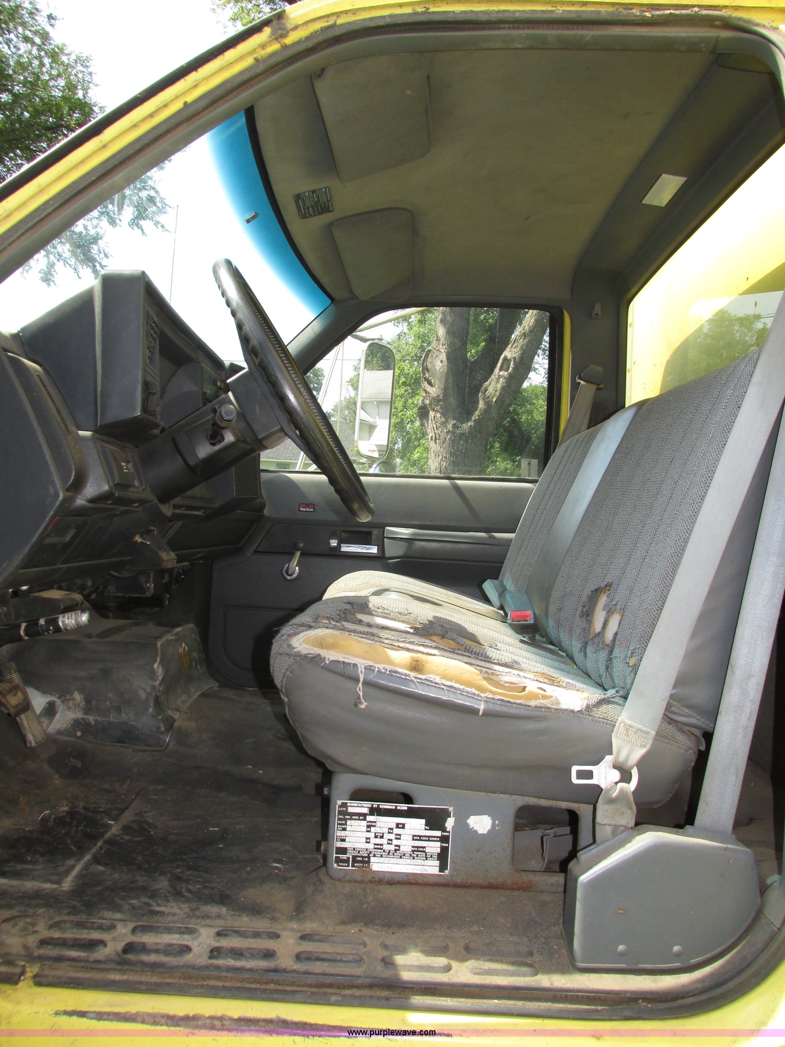 Purple Wave is selling a used Box Truck in Nebraska. This item is a 1992 GMC TopKick box truck with the following: 142,487 miles on odometer, Miles may vary, still in use, 6.0L V8 gas engine, Automatic transmission, Single axle, Heat, AM/FM, Suspension seat, Cloth interior, Draw Tite Actuator II brake controller, Backup alarm, Highway safety triangle, Grumman box bed, 20'L x 95"W I.D., 11.5' O.D. max height, Roll up rear door, Swing side door, 11.5'L x 24" I.D., Wood floor, Interior box lighting, 7" step bumper, 22"H, Pintle hitch, 2" ball hitch, Serial S7373FSG92-20W, Mud flaps, Spring suspension, Hydraulic brakes, 226" wheelbase, Goodyear 245/70R19.5 front tires, Hercules 245/70R19.5 rear tires, GVWR 23,900 lbs, FAWR 7,000 lbs, RAWR 16,900 lbs, (2) holes in floor, Seat torn