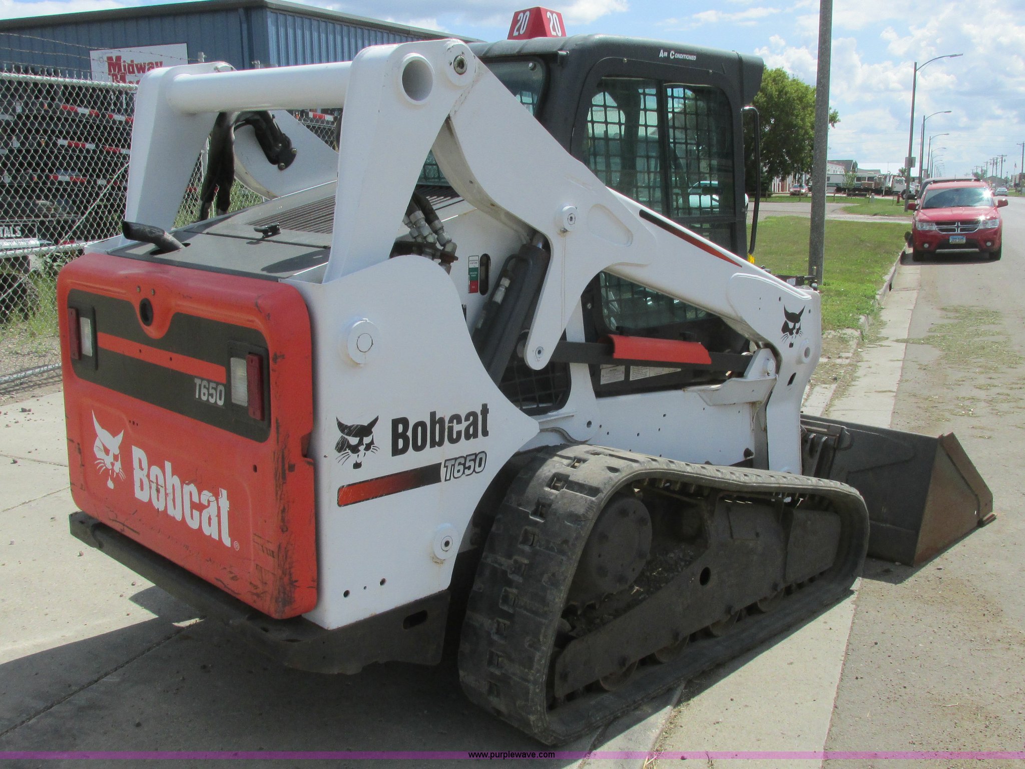 Purple Wave is selling a used Tracked Skid Steer Loader in North Dakota. This item is a 2011 Bobcat T650 skid steer with the following: 985 hours on meter, Kubota four cylinder diesel engine, Model V33D7-D1-T-E03, Hydrostatic transmission, Enclosed cab, AC and heat, EMS panel, Spring suspension seat, Hand and foot controls, Wipers, Bobcat 80"W low profile bucket, Bolt-on cutting edge, High flow auxiliary hydraulics, Front and rear work lights, Four bottom rollers, 13"W tracks, Serial A3P012287