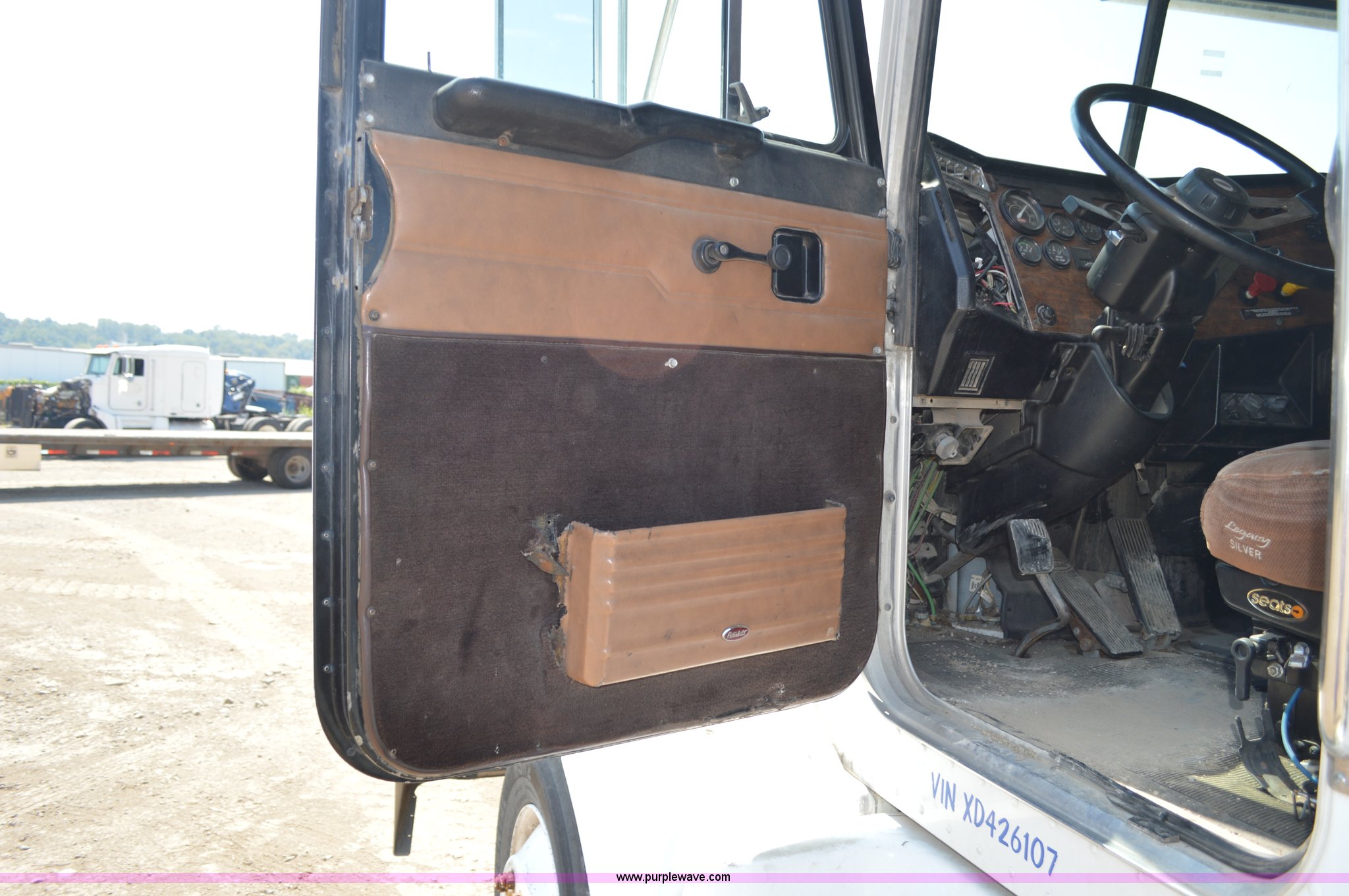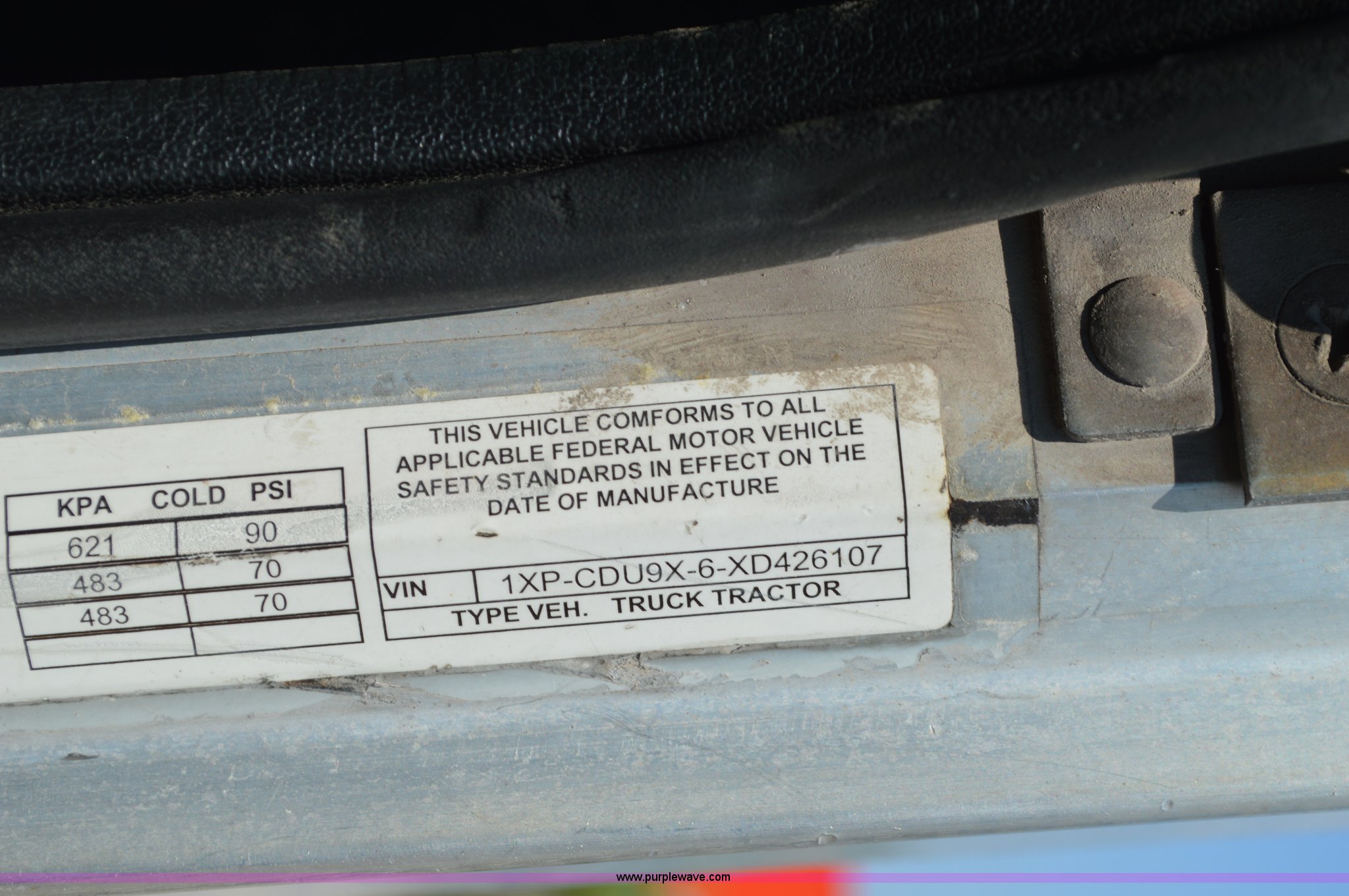1999 Peterbilt 377 semi truck. 1,042,108 miles on odometer, Caterpillar C12 diesel engine, Manual transmission, AC and heat, Cruise, AM/FM/cassette, Heated mirrors, Air suspension seat, Aluminum headache rack, Single front exhaust stack, Dual fuel tanks, Quarter fenders, Air suspension, Air brakes, 275/80R22.5 tires, GVWR 50,000 lbs, FAWR 12,000 lbs, IAWR 19,000 lbs, RAWR 19,000 lbs. Title distribution may be delayed up to 14 days from verification of funds. 1XPCDU9X6XD426107. Richards Construction Company. 4910 Gardner Avenue. Kansas City, MO 64136