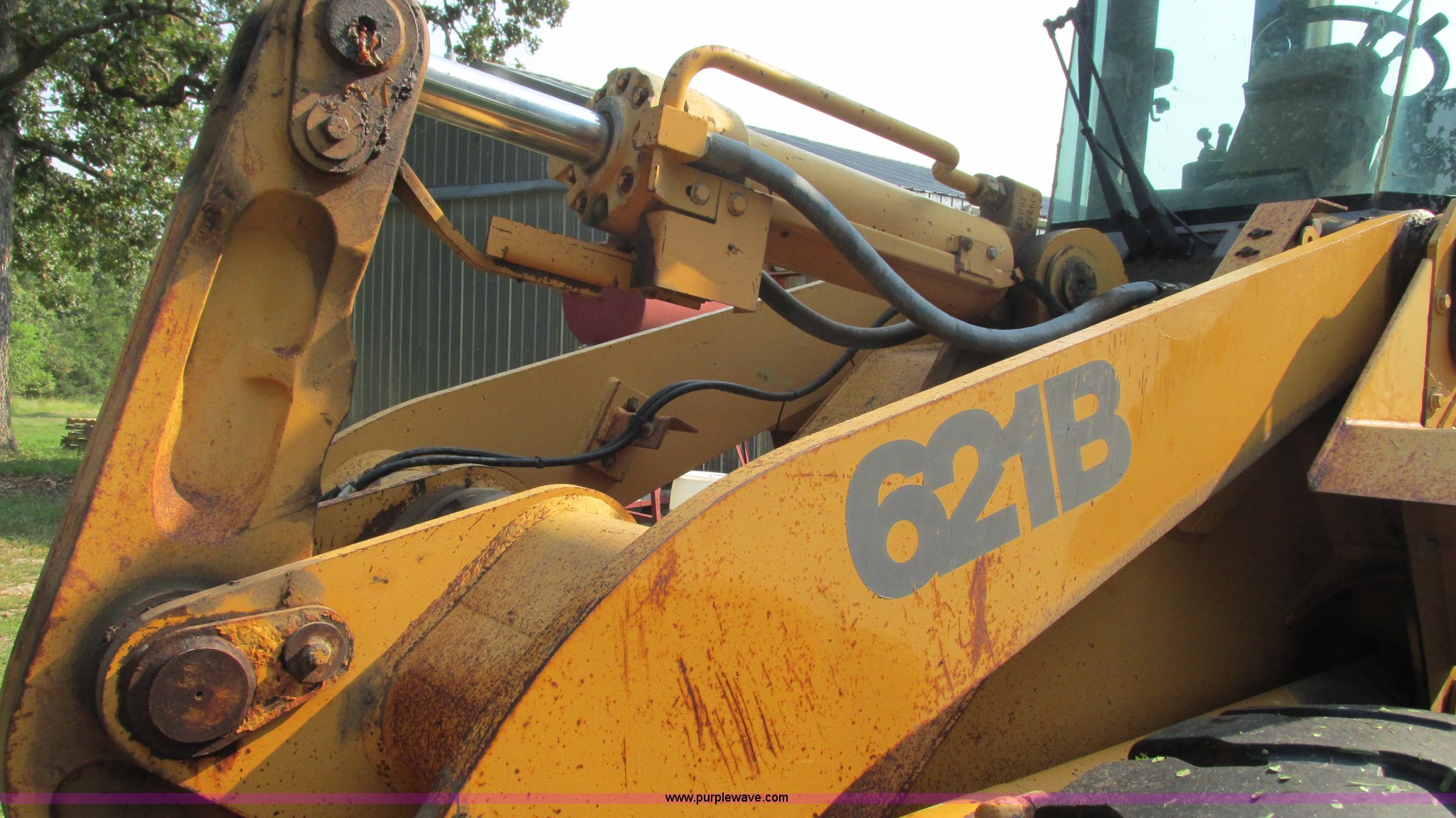 Purple Wave is selling a used Wheel Loader in Missouri. This item is a 1998 Case 621B wheel loader with the following: 5,593 hours on meter, Case 6T-590 six cylinder turbo diesel engine, Serial 45600777, Powershift transmission, 4F-4R gears, Enclosed cab, Heat, Tilt steering wheel, Suspension seat, Hand steering controls, Two-lever bucket controls, Return to travel, Wipers, Front work lights, Backup alarm, Glow plugs, ACS 101"W general purpose bucket, Bolt-on cutting edge, Hydraulic quick coupler, Detents, ASC pallet forks, 48"L x 6"W, Counterweights, 17.5-25 tires, 25,501 lbs. base operating weight, (2) Unused Samson E-3/L-3 17.5-25 tires, Rust, Seat torn, Serial JEE0056570