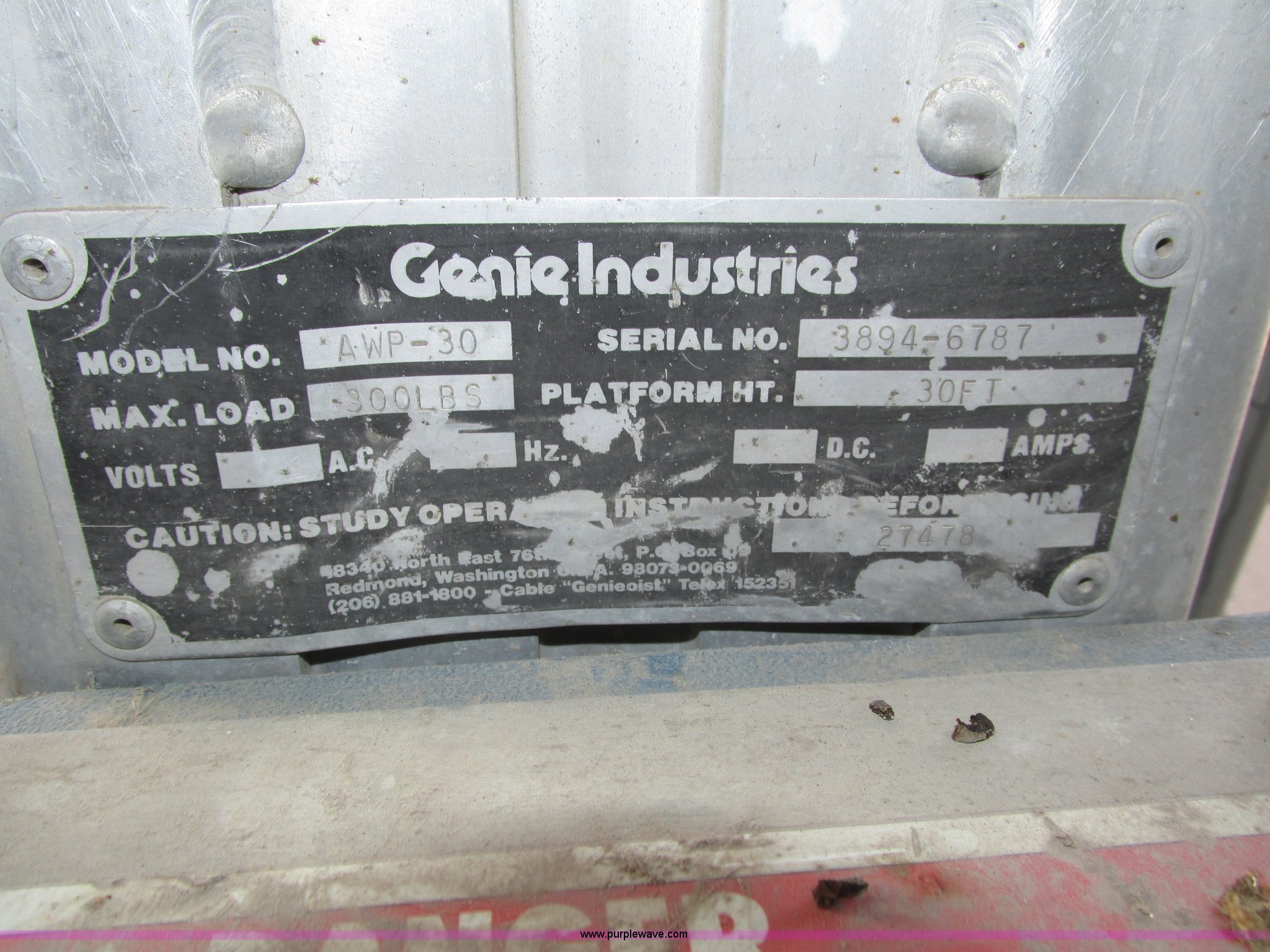 Purple Wave is selling a used Scissor or Vertical Lift in Nebraska. This item is a Genie 30 AWP vertical lift with the following: 12V electric operation, 30' maximum platform height, 300 lbs maximum lift capacity, Fold down rear stanchion, (4) outriggers, Rear battery box, Non-operational, Unit is parts only, Partially disassembled, Lester 06685 battery charger, Serial 38946787, Unit# PL011E