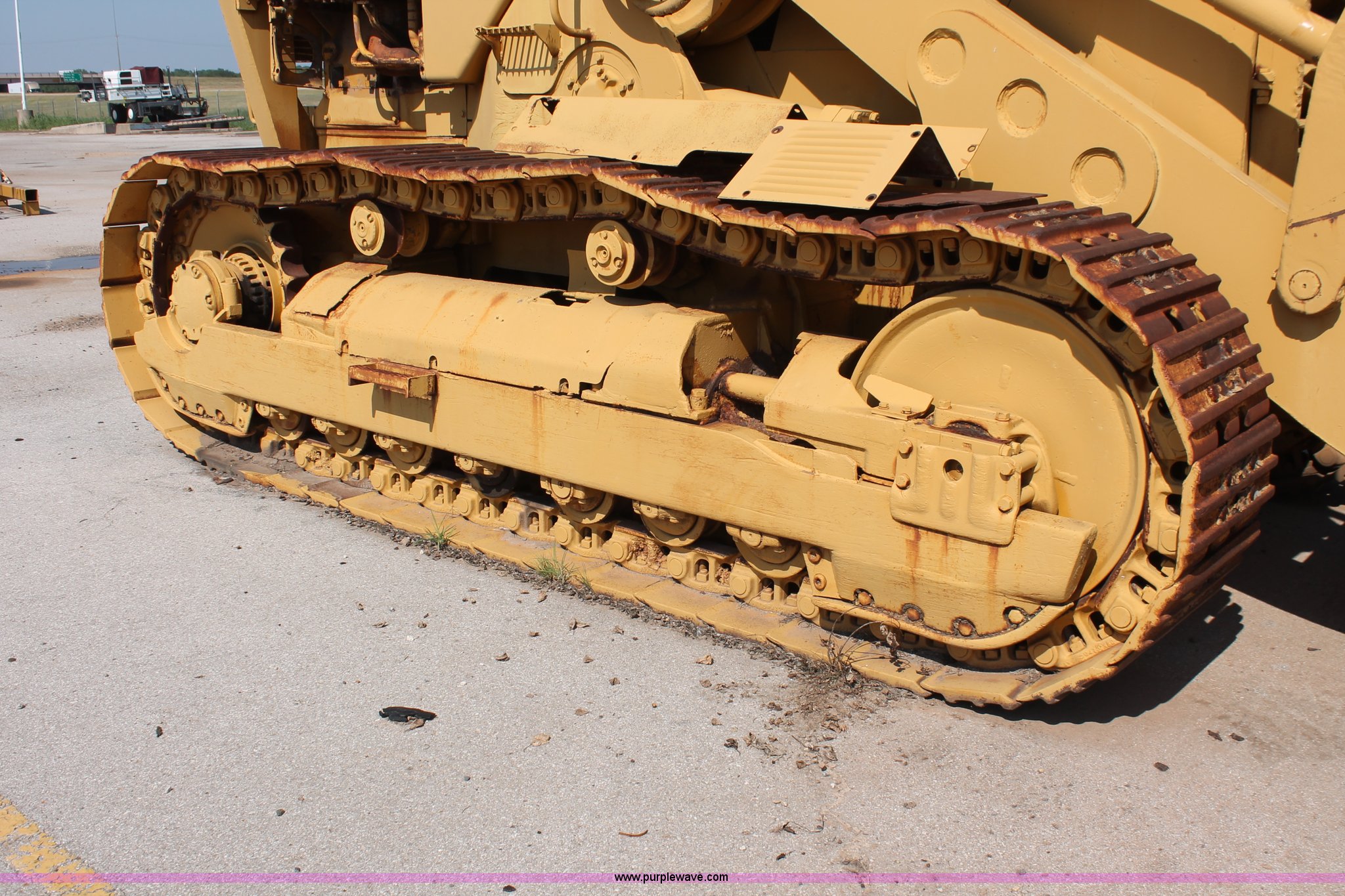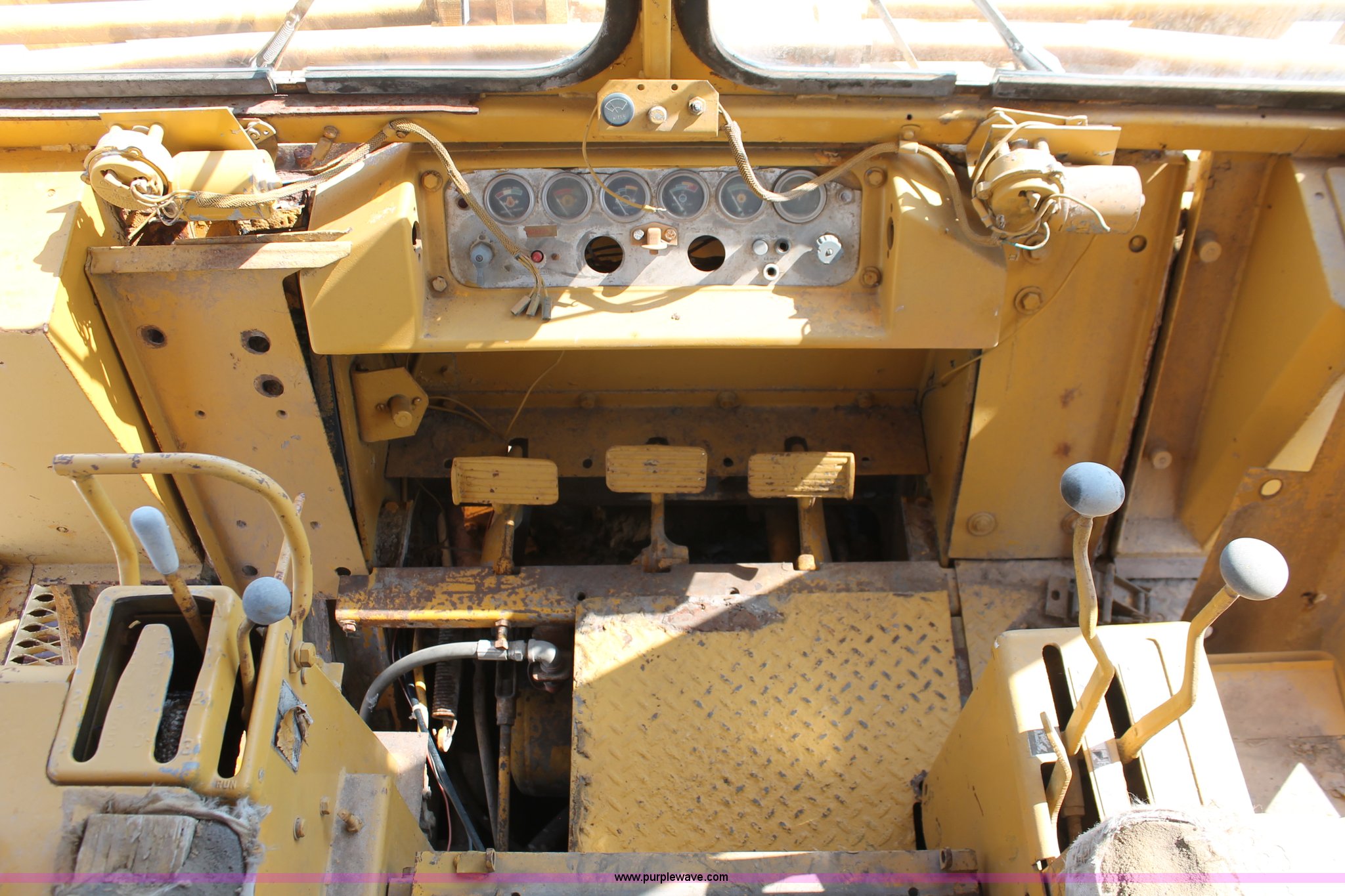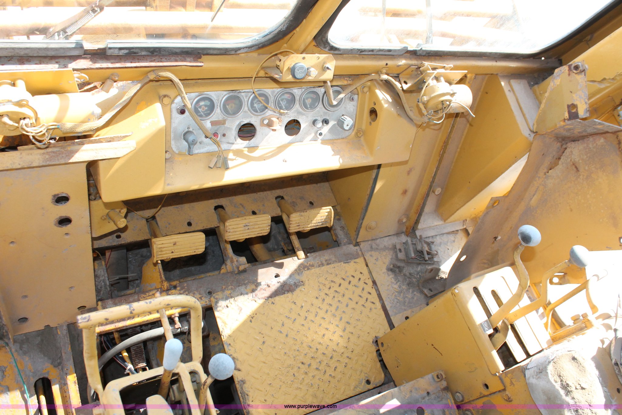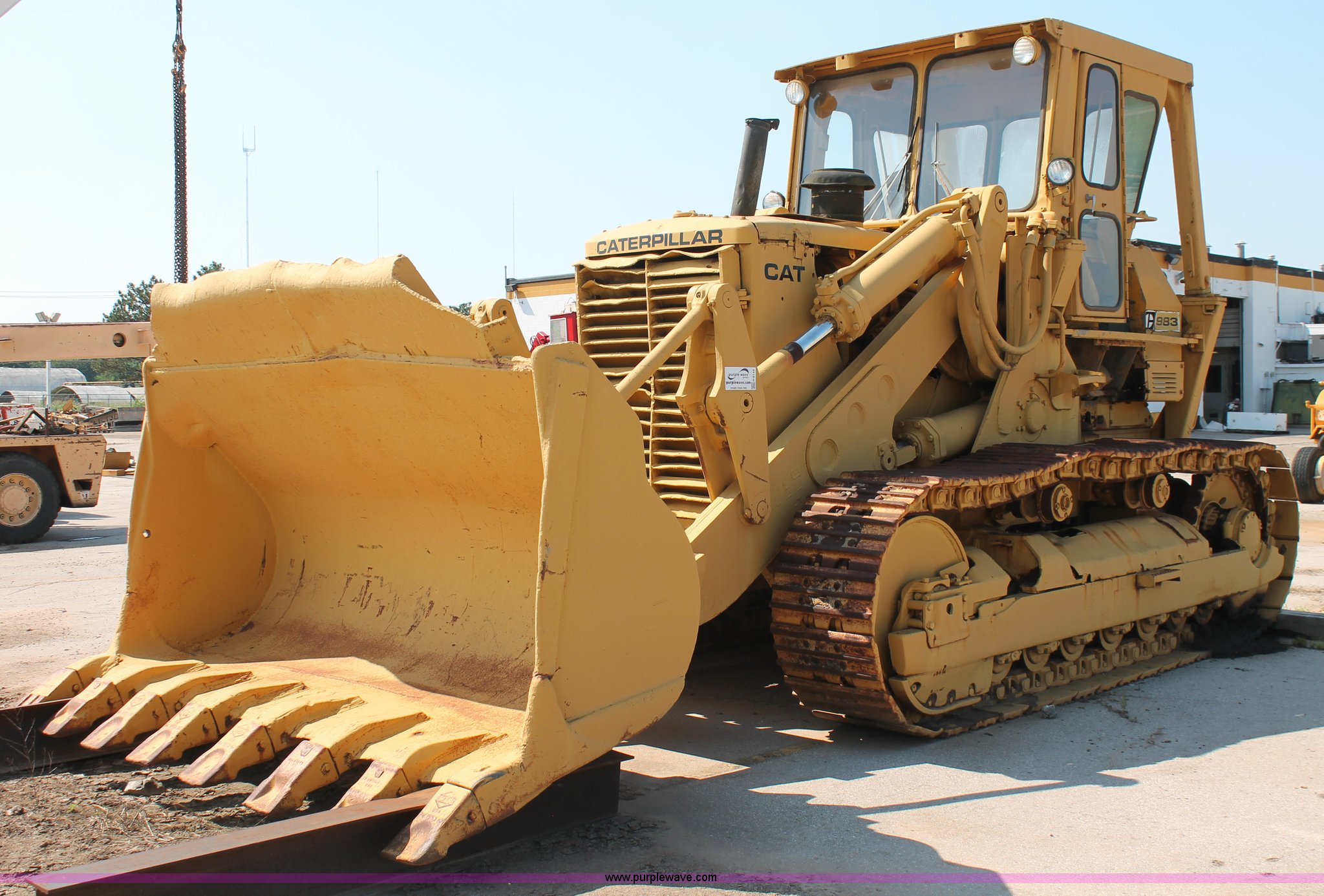 Purple Wave is selling a used Crawler Loader in Oklahoma. This item is a 1978 Caterpillar 983 track loader with the following: Caterpillar D343 six cylinder diesel engine, Serial 52K1338, Powershift transmission, 3F-3R gears, Cab, Two stick loader controls, Front and rear work lights, Front wipers, 118"W x 58"H bucket, (8) bolt-on teeth, Seven bottom rollers, 22"W triple grouser track pads, 69,880 lbs. base operating weight, Unknown running condition, Undiagnosed issues, Cab interior partially disassembled, Serial 38K1572