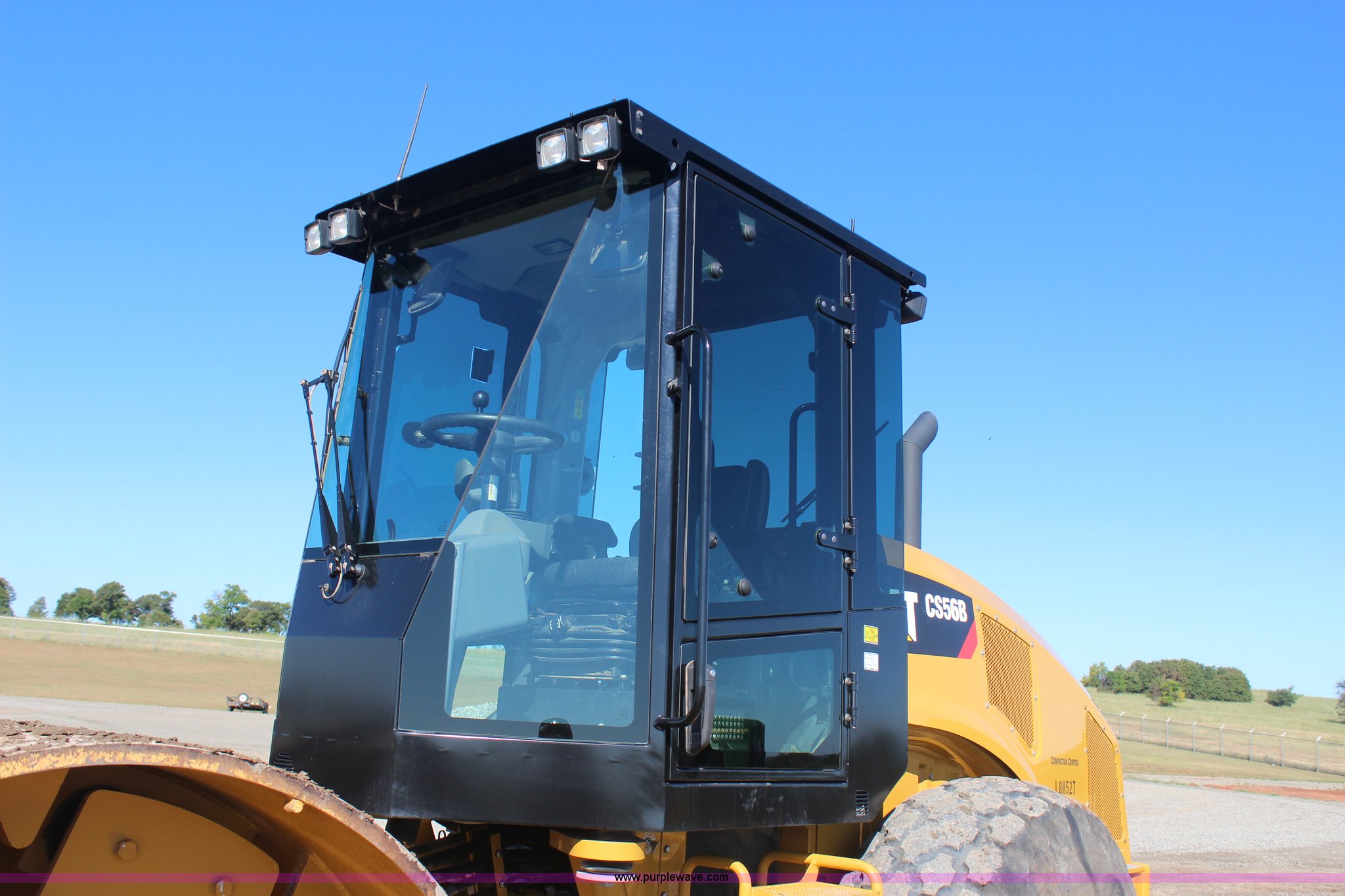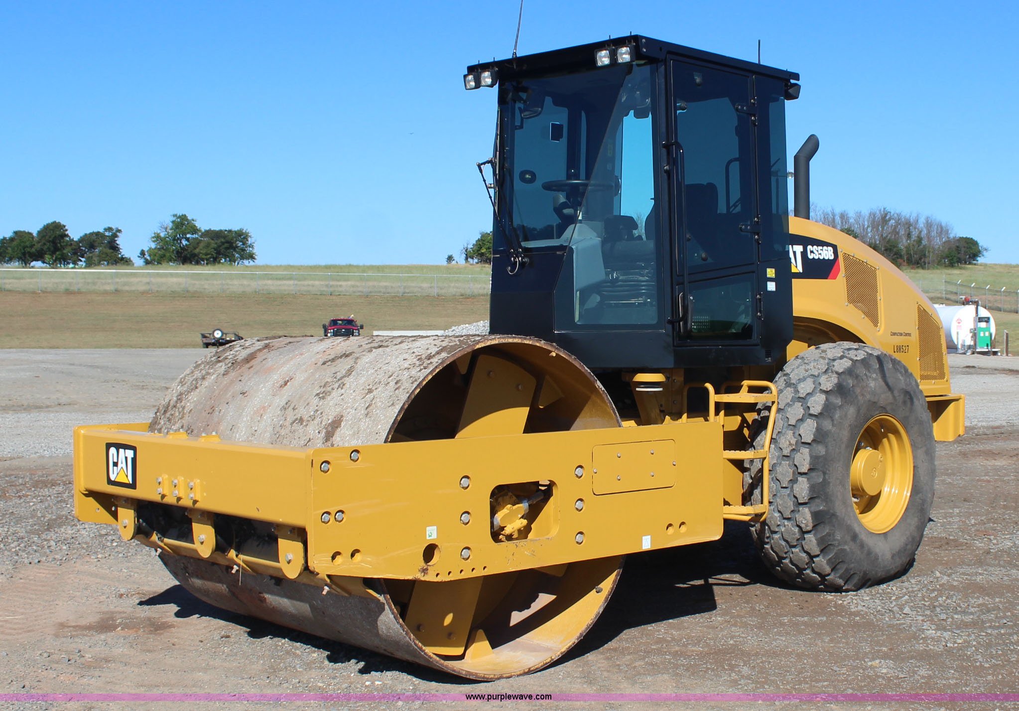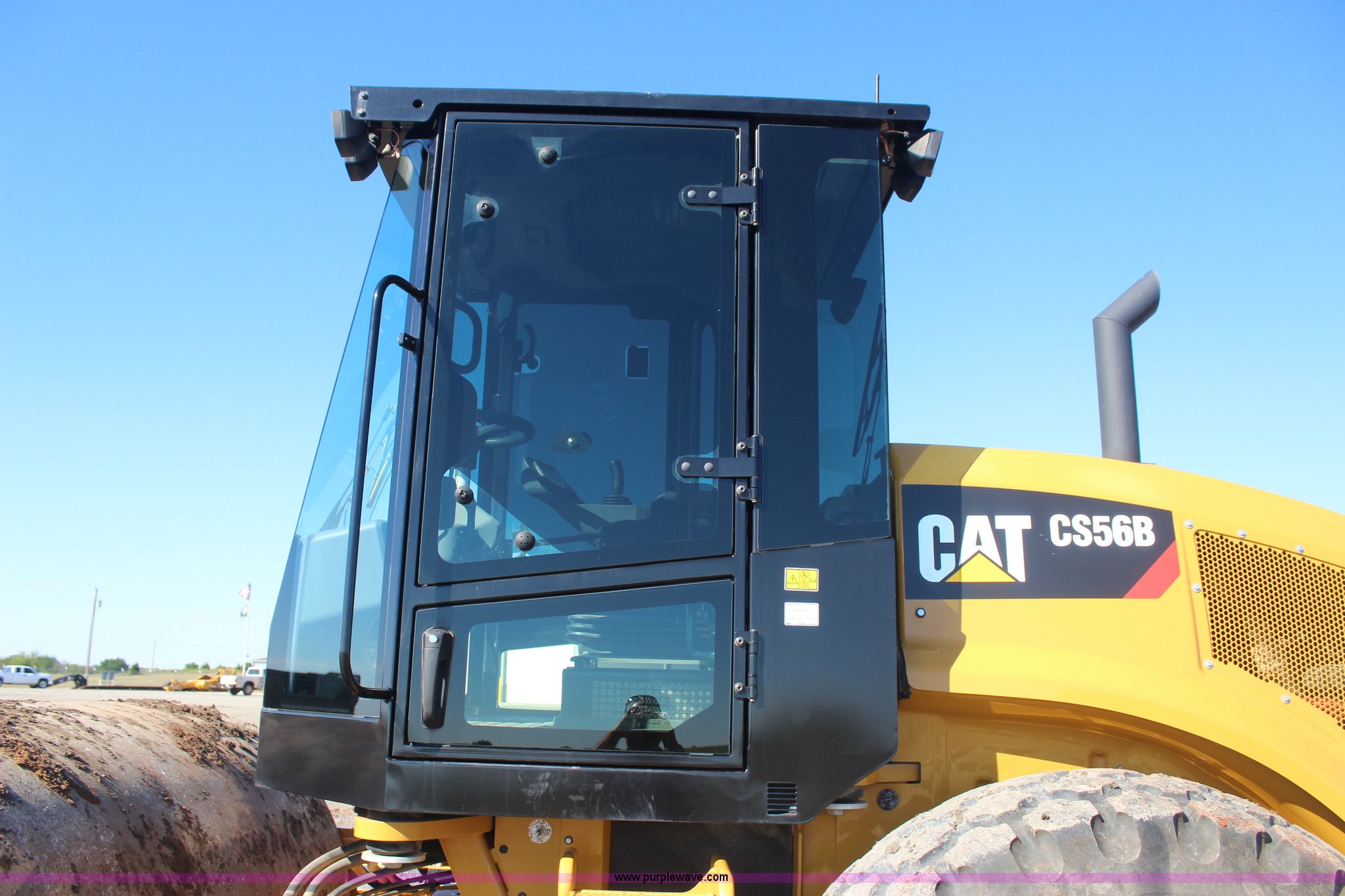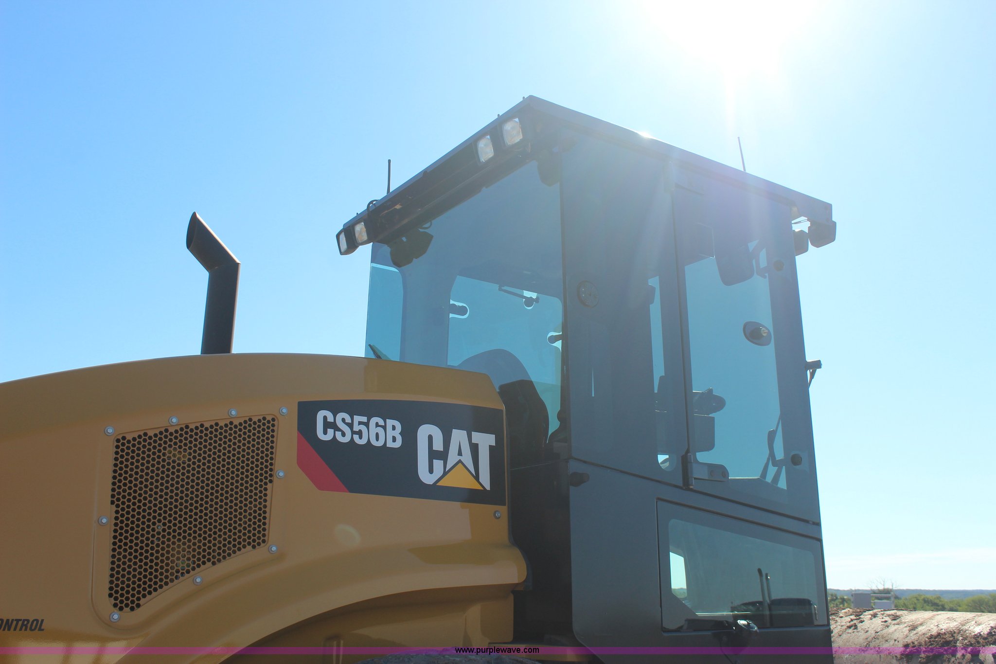 Purple Wave is selling a used Single Drum Roller Compactor in Oklahoma. This item is a 2013 Caterpillar CS56B single drum roller with the following: 917 hours on meter, Caterpillar C4.4 turbo diesel engine, Serial C7N08549, Hydrostatic transmission, Enclosed cab, ROPS, AC and heat, Tilt, Air suspension seat, Work lights, 84"W x 60" diameter smooth drum, Two speed vibratory system, 23.1 x 26 tires, Serial CATCS56BJL8H00527