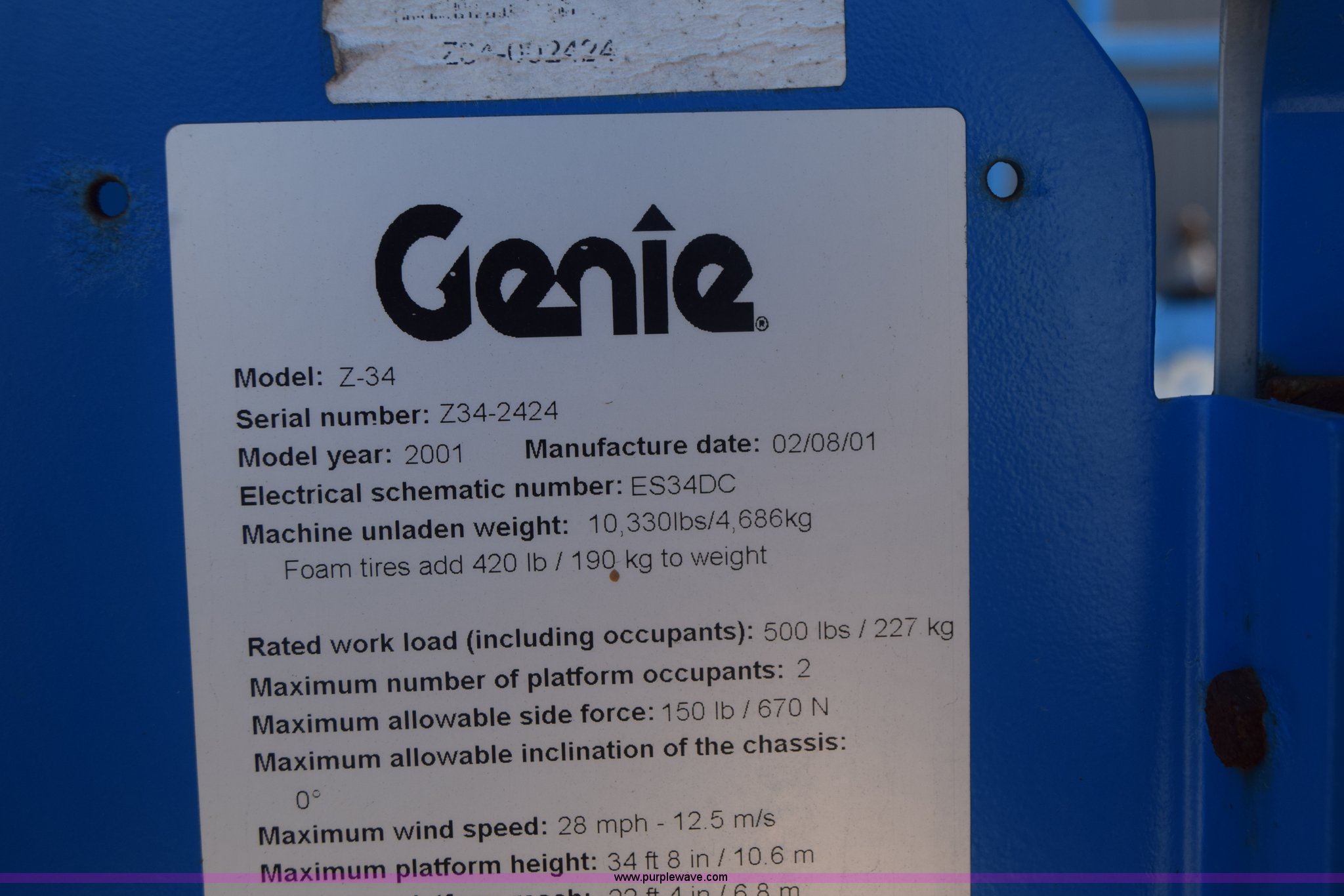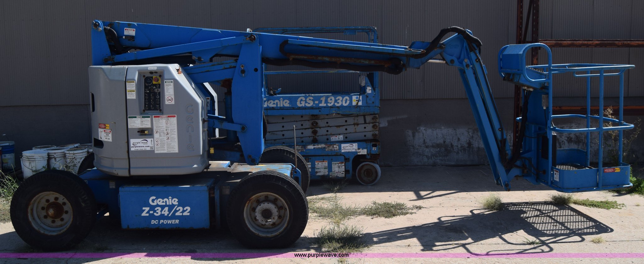 Purple Wave is selling a used Boom Lift in Kansas. This item is a 2001 Genie Z-34/22 boom lift with the following: Electric system, 500 lbs maximum lift capacity, 34'8" maximum platform height, 22'4" maximum platform reach, Two person maximum platform occupancy, 43" x 28" x 43"H platform, 9-14.5LT urethane filled tires, 10,330 lbs. base operating weight, No batteries, Last operated four months ago, Serial Z34-2424