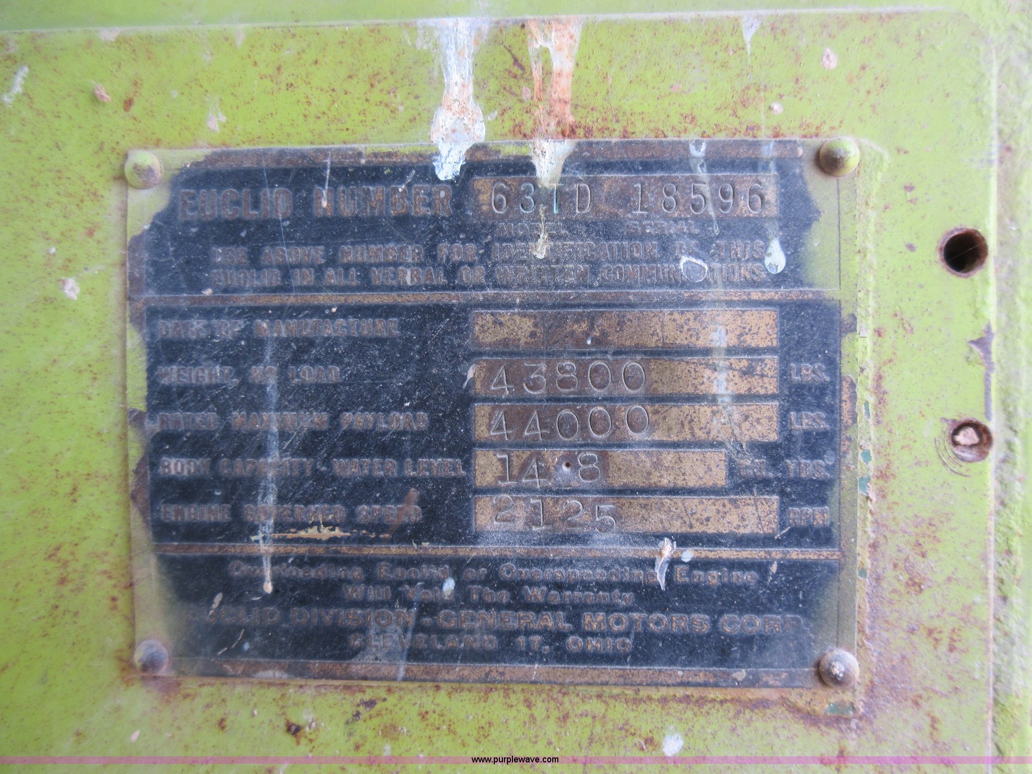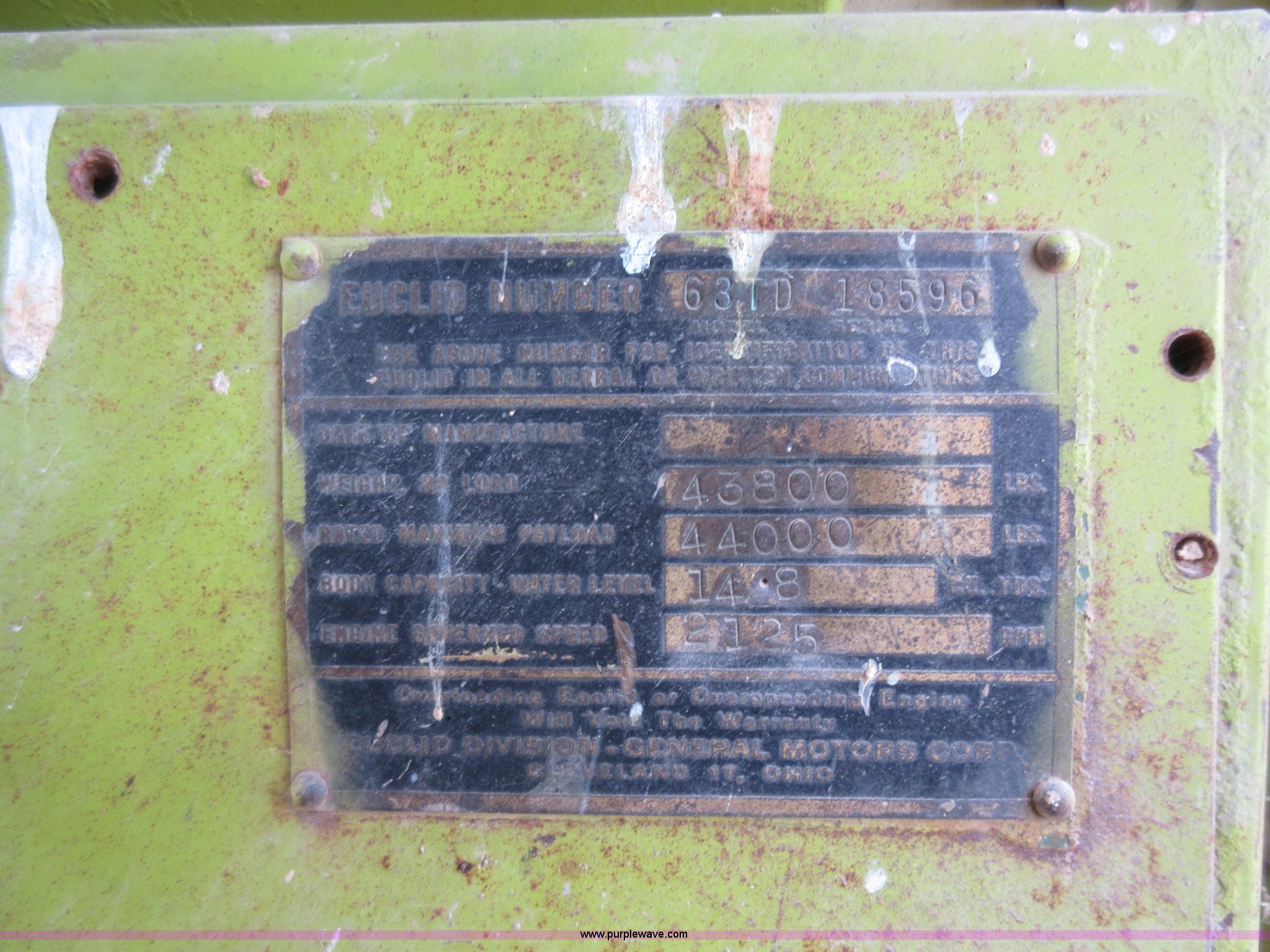Euclid haul truck. Cummins six cylinder diesel engine, Three speed manual transmission, 15.5'L x 9.5'W dump bed, 44,010 maximum rated payload, Rear pin hitch, 14-24 front tires, 18-25 rear tires, Glass cracked, No batteries, Unknown operating condition. 63TD18596. Phenix Rock Quarry. 9455 N. Farm Road 45. Ash Grove, MO 65604