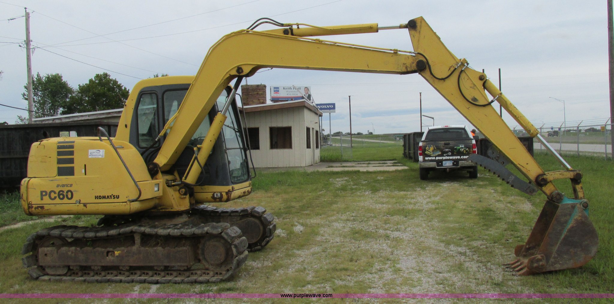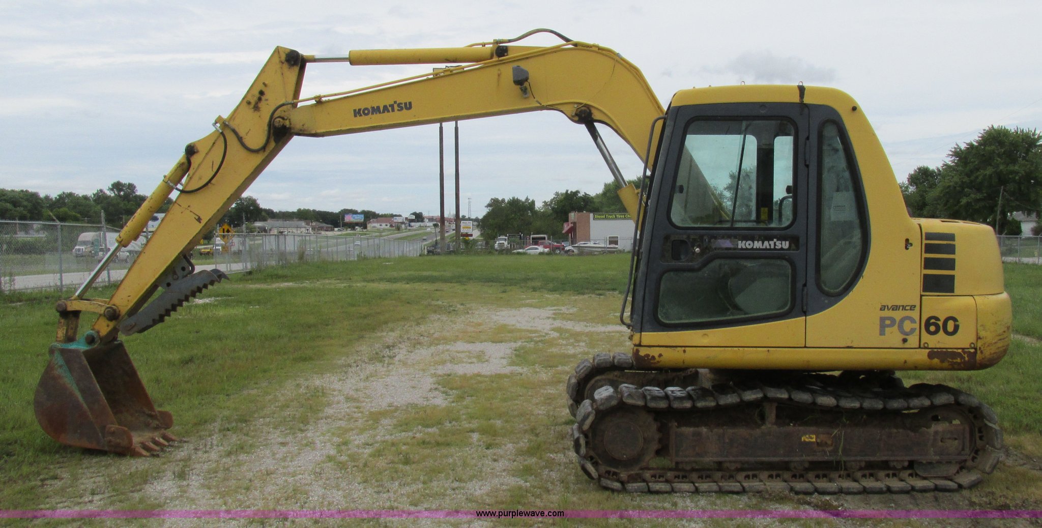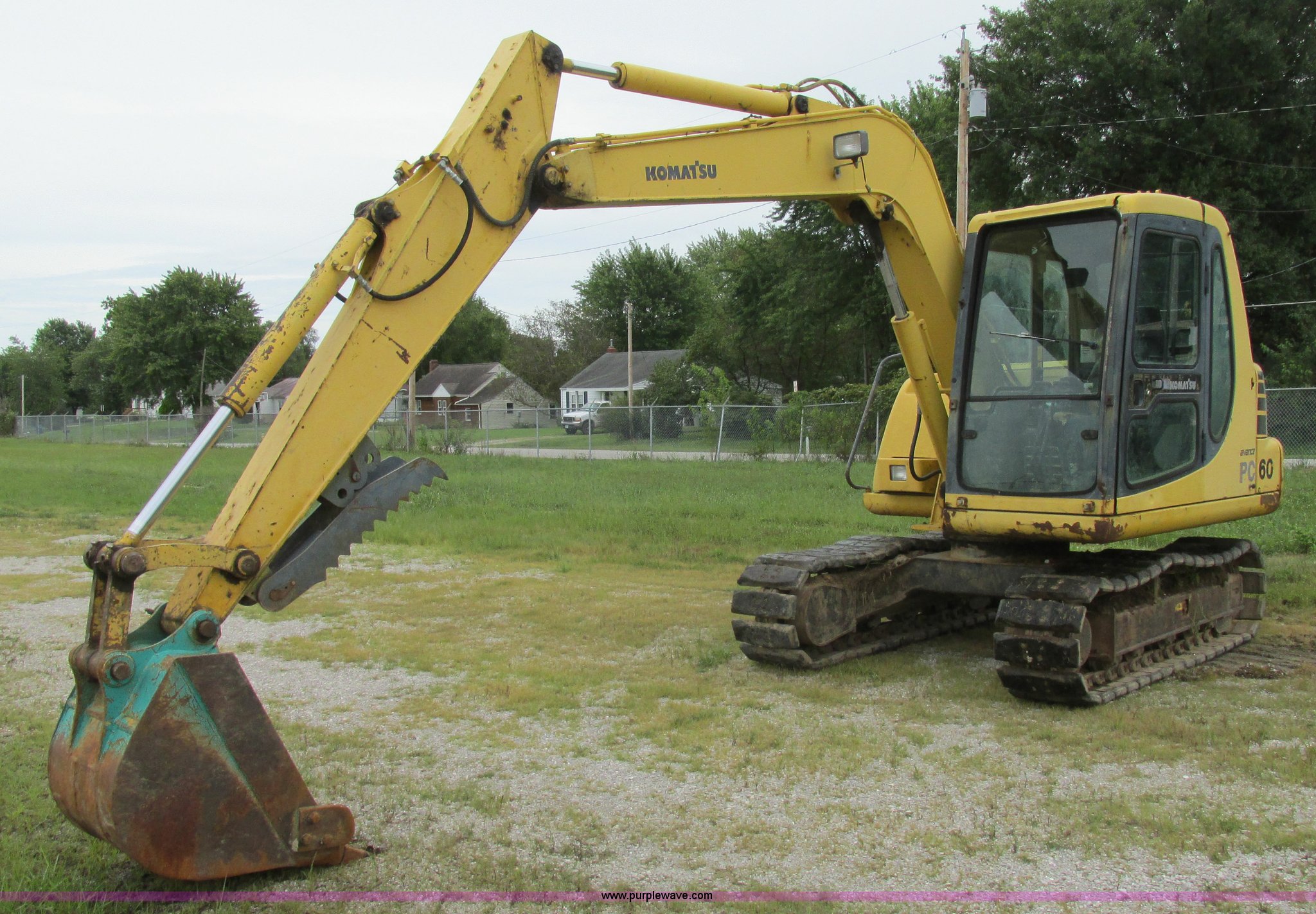 Purple Wave is selling a used Mini Excavator in Missouri. This item is a 2001 Komatsu PC60-7C mini excavator with the following: 3,534 hours on meter, Four cylinder diesel engine, Hydrostatic transmission, Enclosed cab, Heat, AM/FM, Suspension seat, Front work lights, Standard boom, 89" stick length, 24"W bucket, (4) weld-on teeth, Manual thumb, 35"L x 9"W, 17.5"W poly tracks, Rear hood cracked, Shut off solenoid needs replaced, Serial 58972