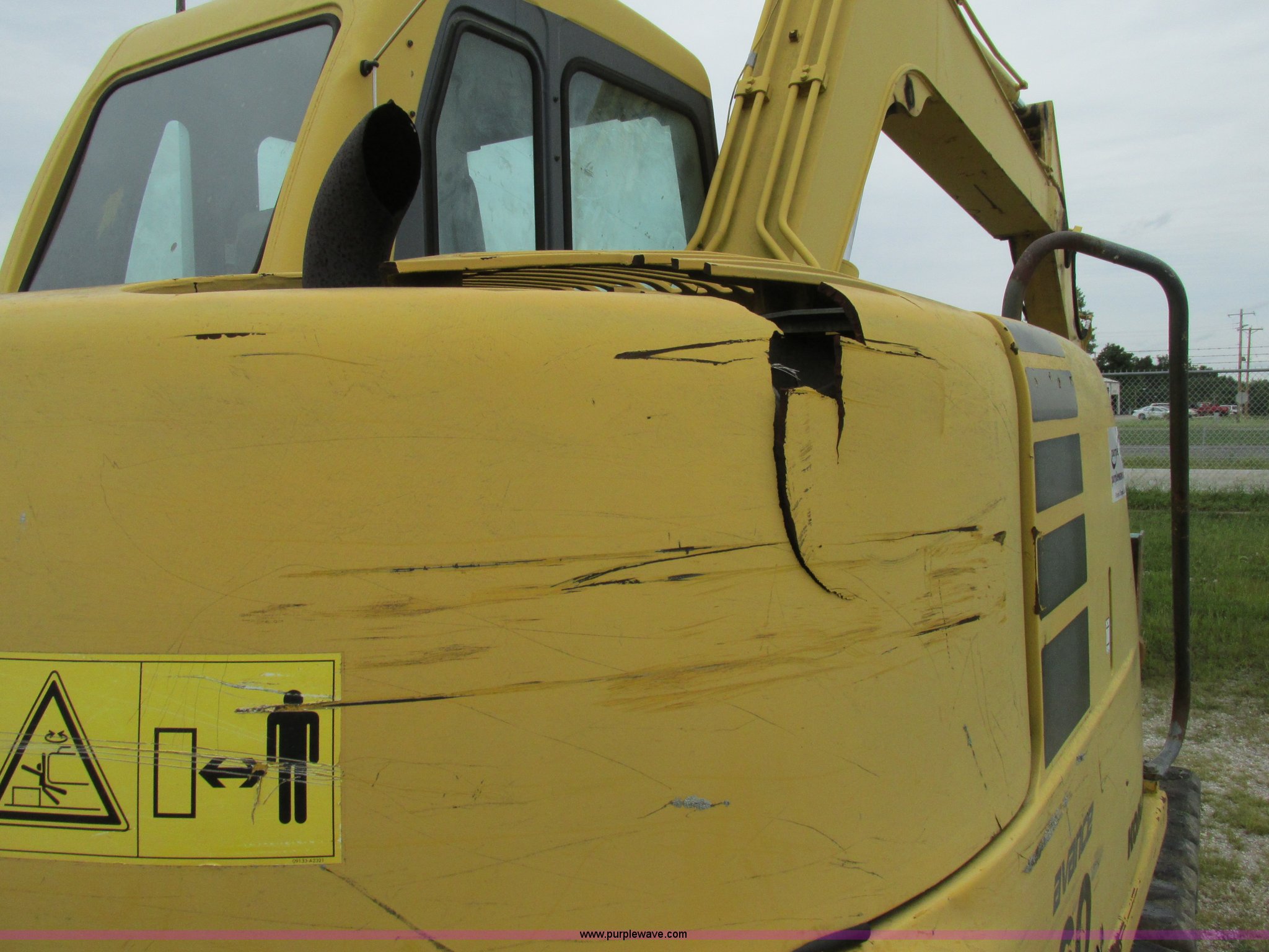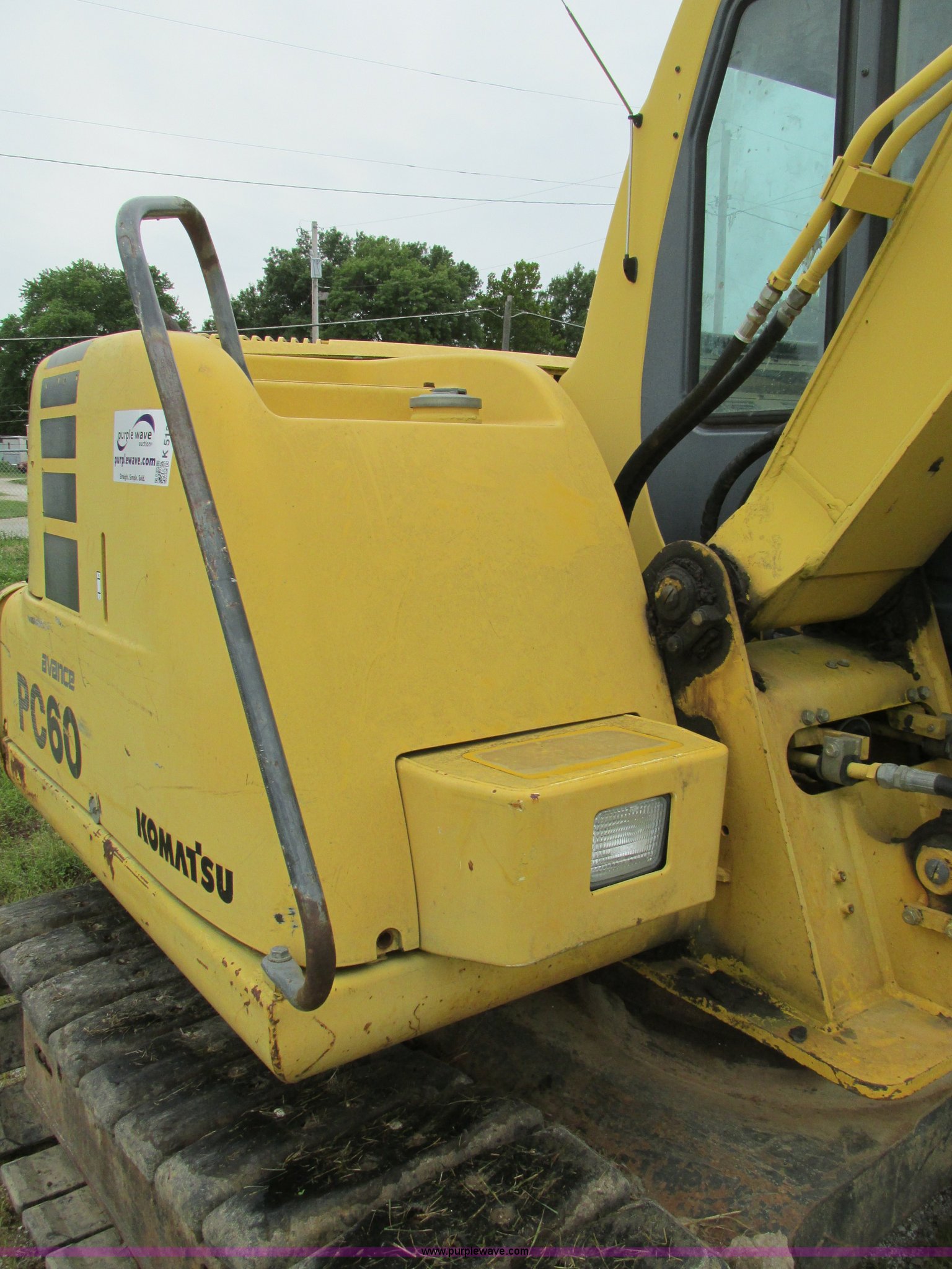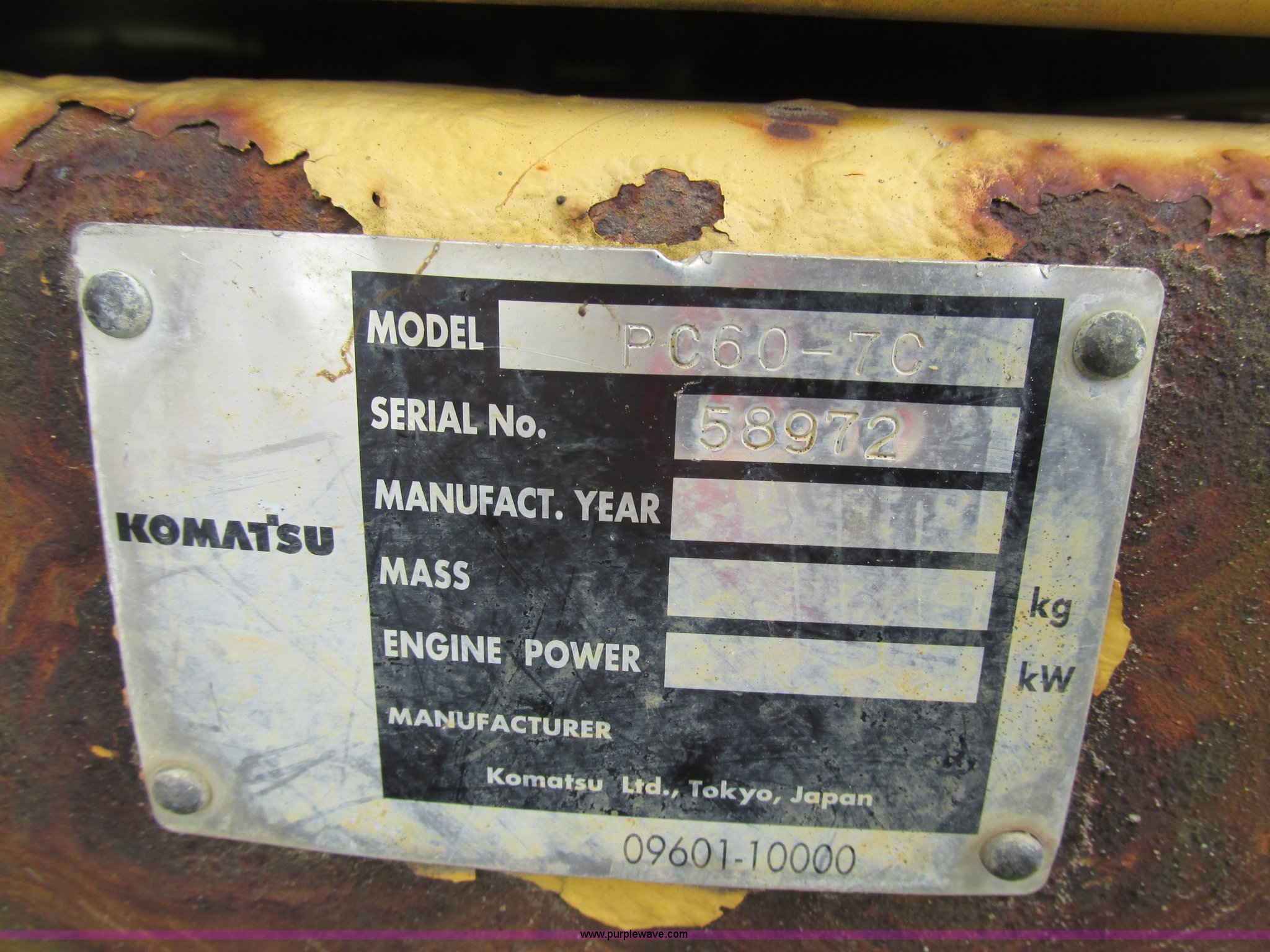 Purple Wave is selling a used Mini Excavator in Missouri. This item is a 2001 Komatsu PC60-7C mini excavator with the following: 3,534 hours on meter, Four cylinder diesel engine, Hydrostatic transmission, Enclosed cab, Heat, AM/FM, Suspension seat, Front work lights, Standard boom, 89" stick length, 24"W bucket, (4) weld-on teeth, Manual thumb, 35"L x 9"W, 17.5"W poly tracks, Rear hood cracked, Shut off solenoid needs replaced, Serial 58972