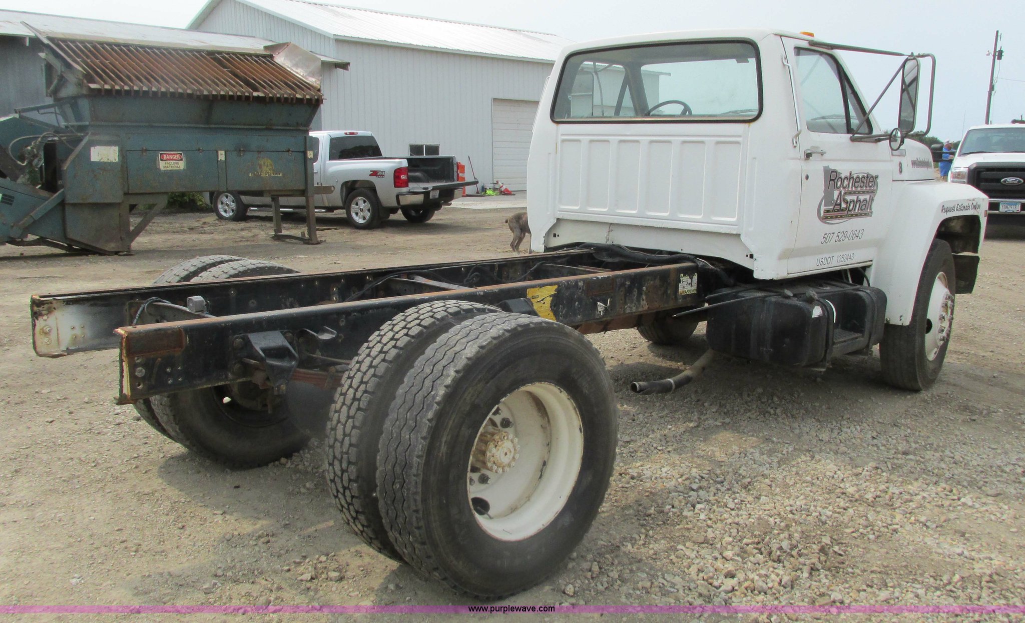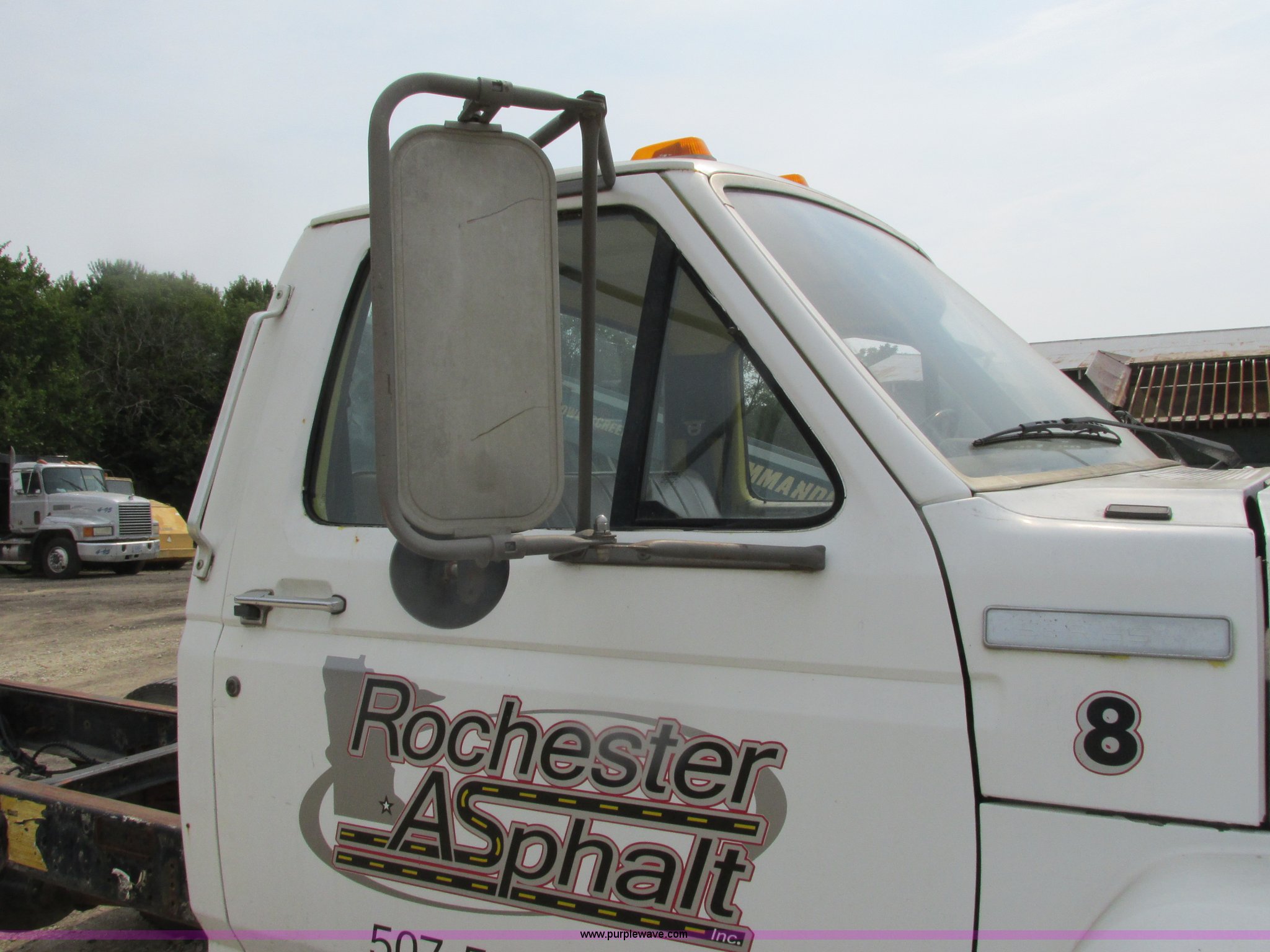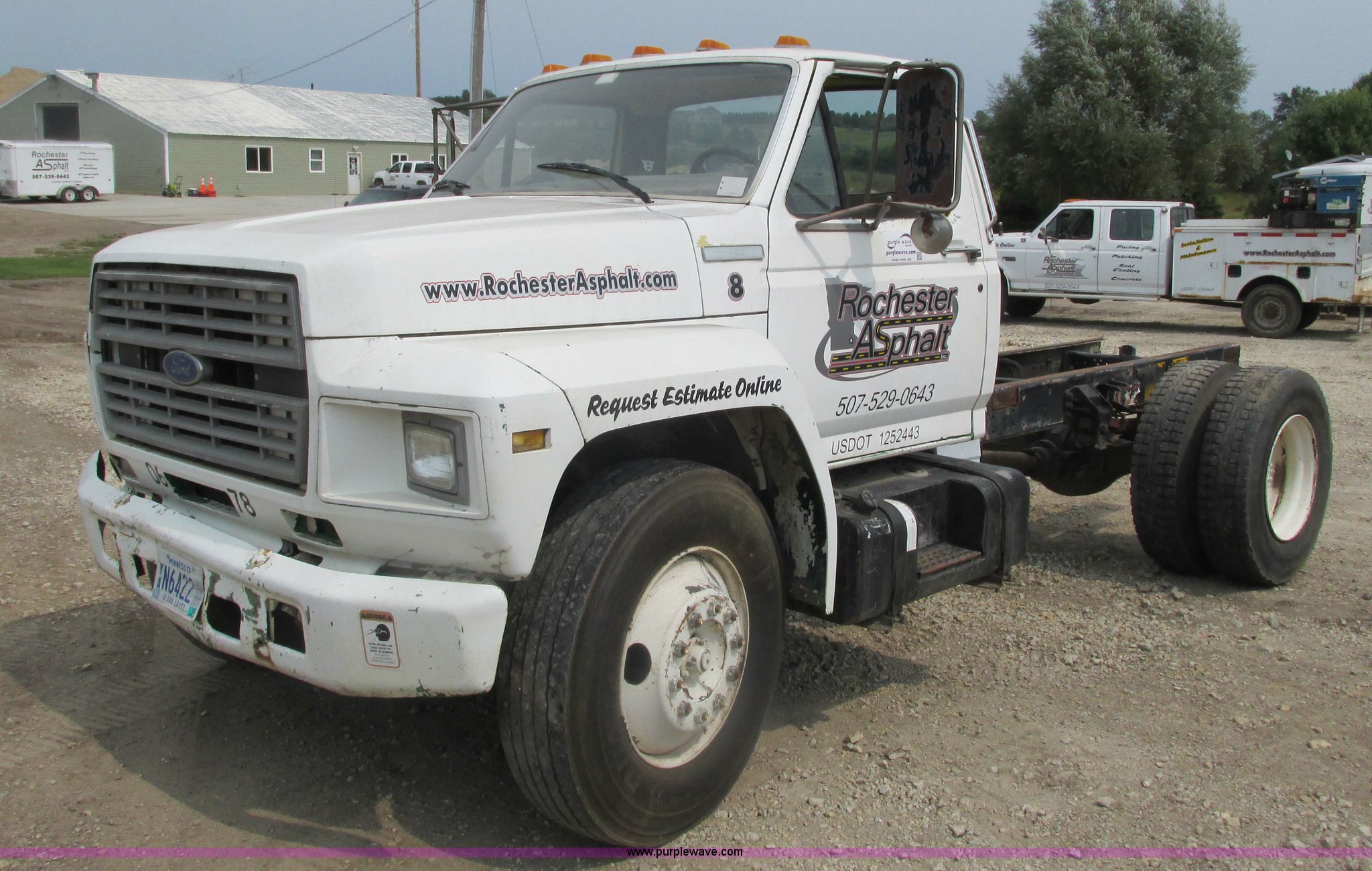 1995 Ford F700 cab and chassis. 153,402 miles on odometer, 7.0L V8 gas engine, Five speed manual transmission, Heat, Vinyl interior, Spring suspension, Hydraulic brakes, 225" wheelbase, 11R22.5 tires, Runs rough, Battery weak. 1FDNF70J3SVA19438. Rochester Asphalt. 2904 County Road 15 SW. Rochester, MN 55902