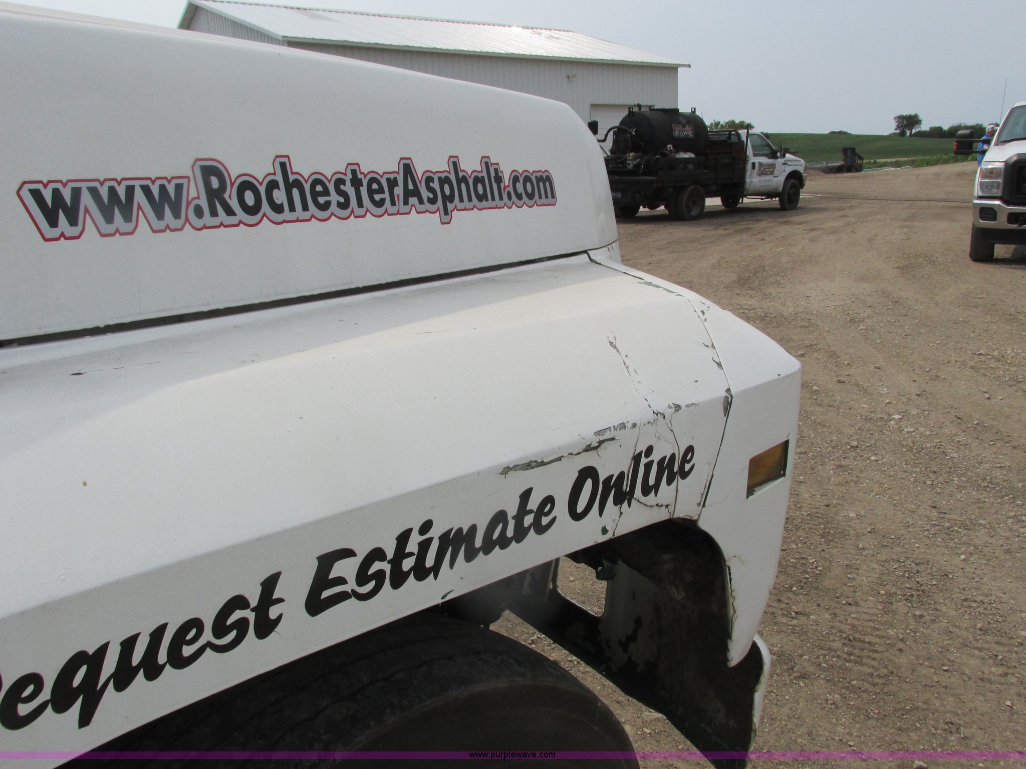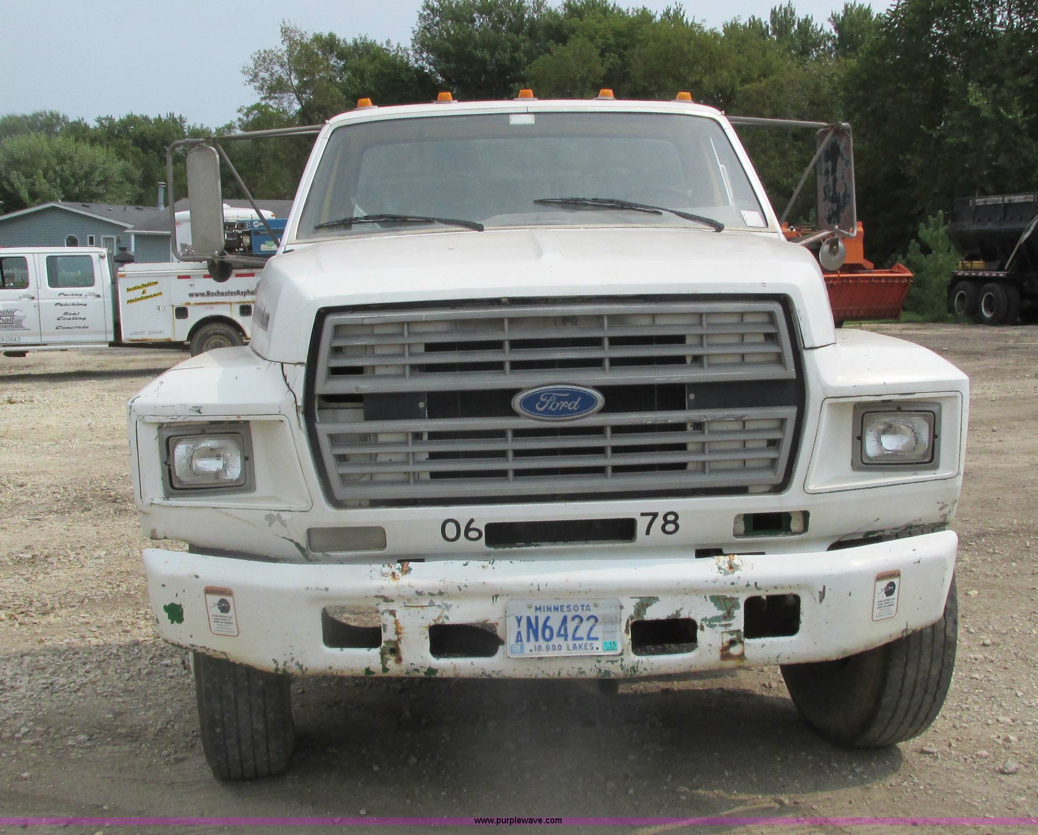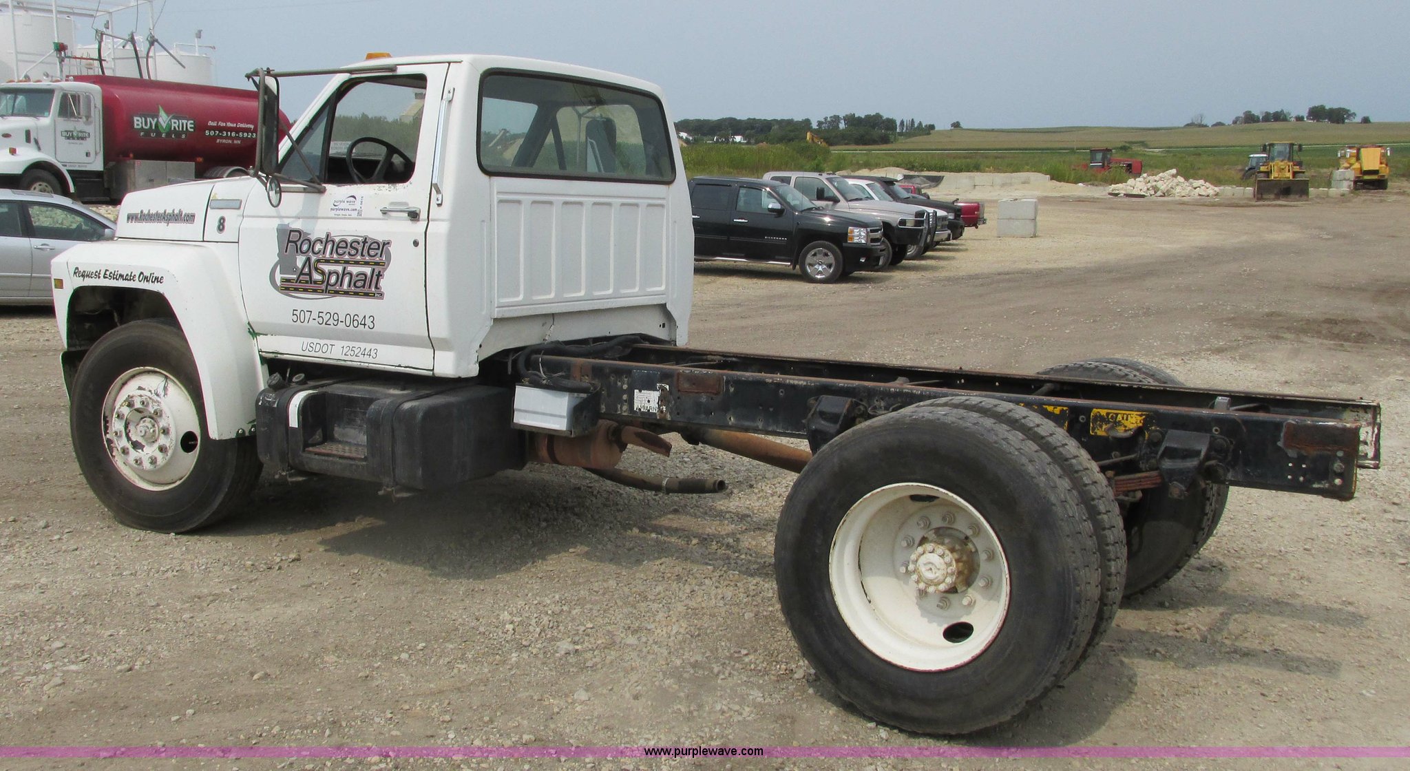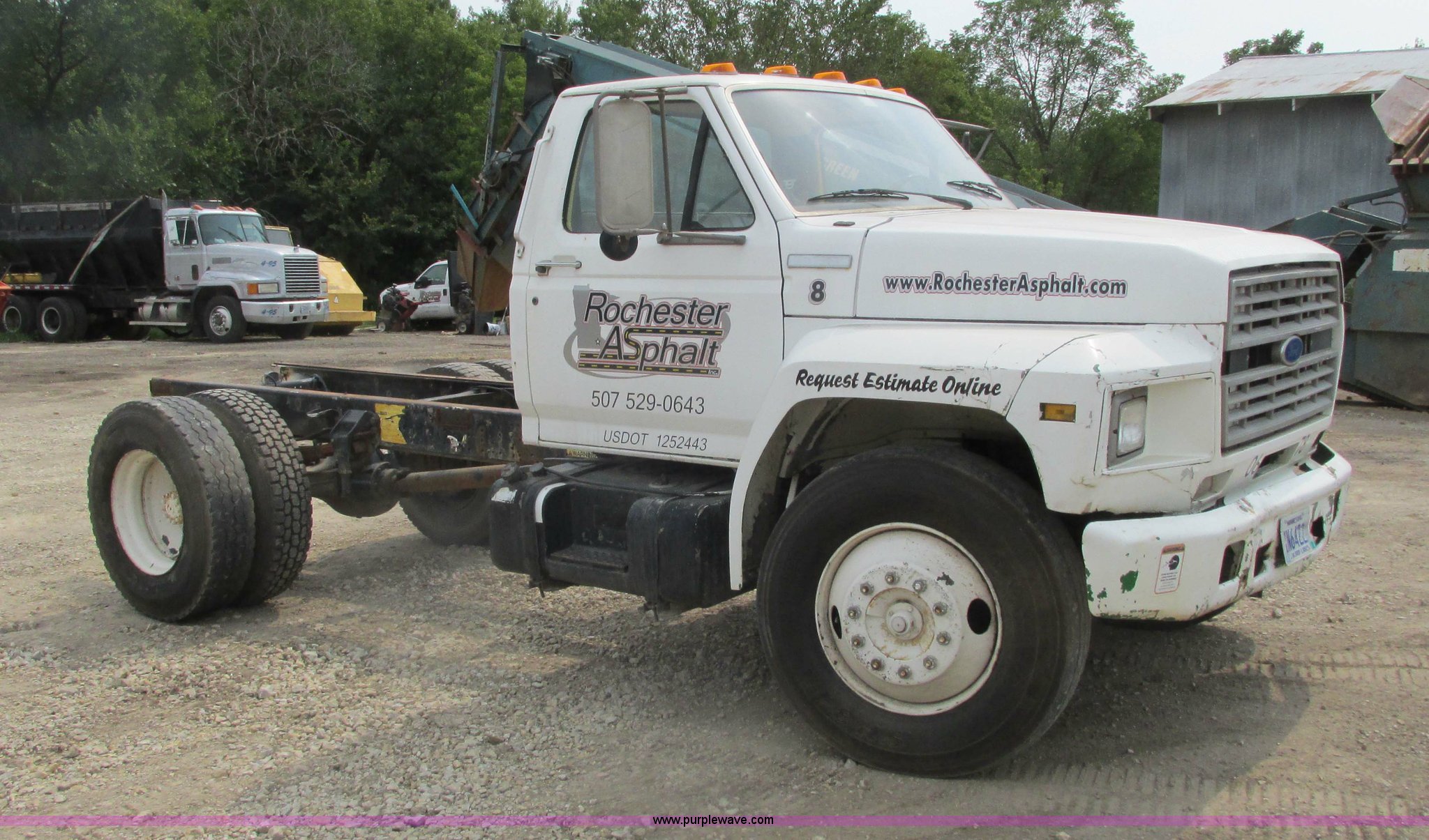 1995 Ford F700 cab and chassis. 153,402 miles on odometer, 7.0L V8 gas engine, Five speed manual transmission, Heat, Vinyl interior, Spring suspension, Hydraulic brakes, 225" wheelbase, 11R22.5 tires, Runs rough, Battery weak. 1FDNF70J3SVA19438. Rochester Asphalt. 2904 County Road 15 SW. Rochester, MN 55902