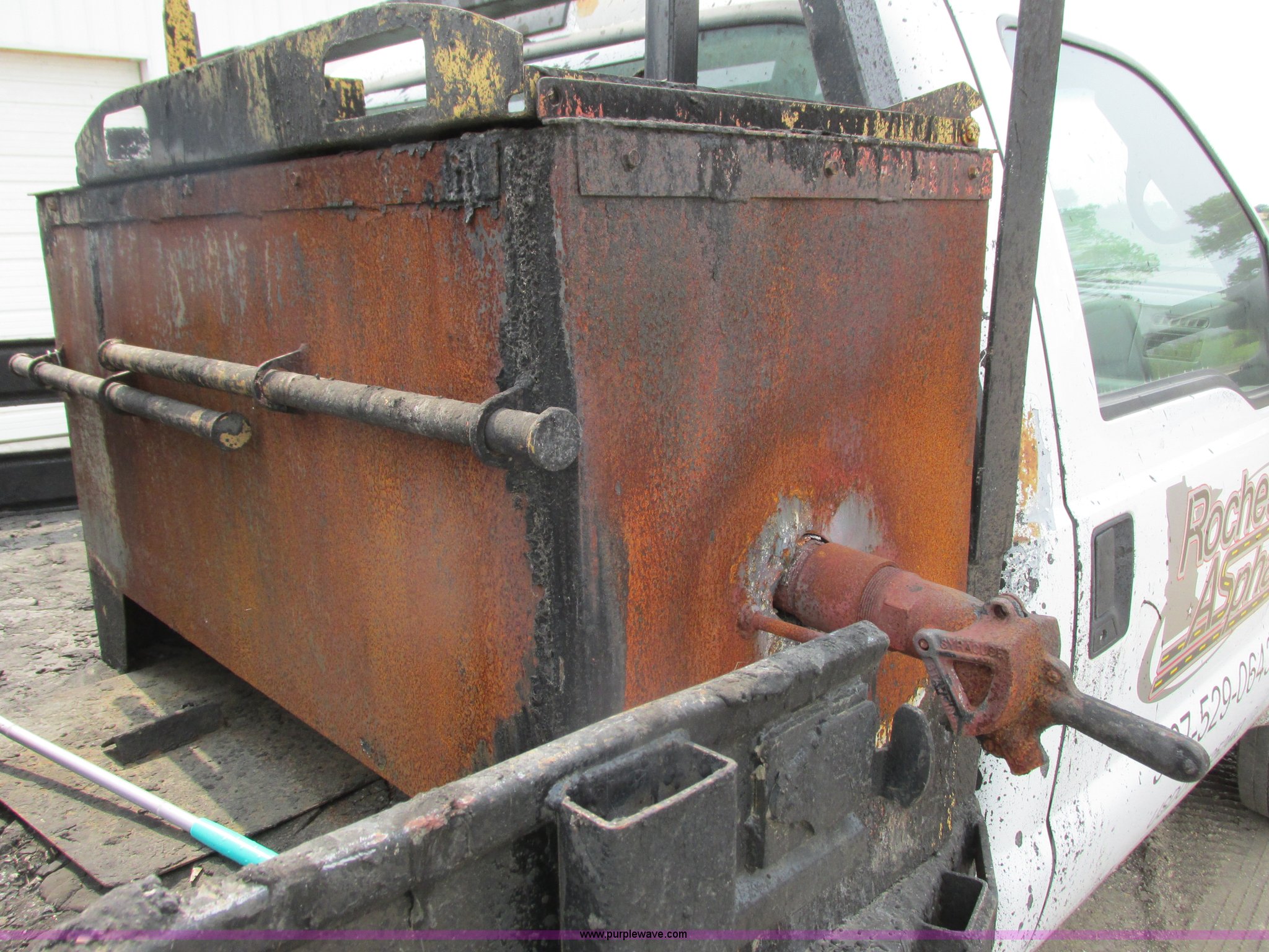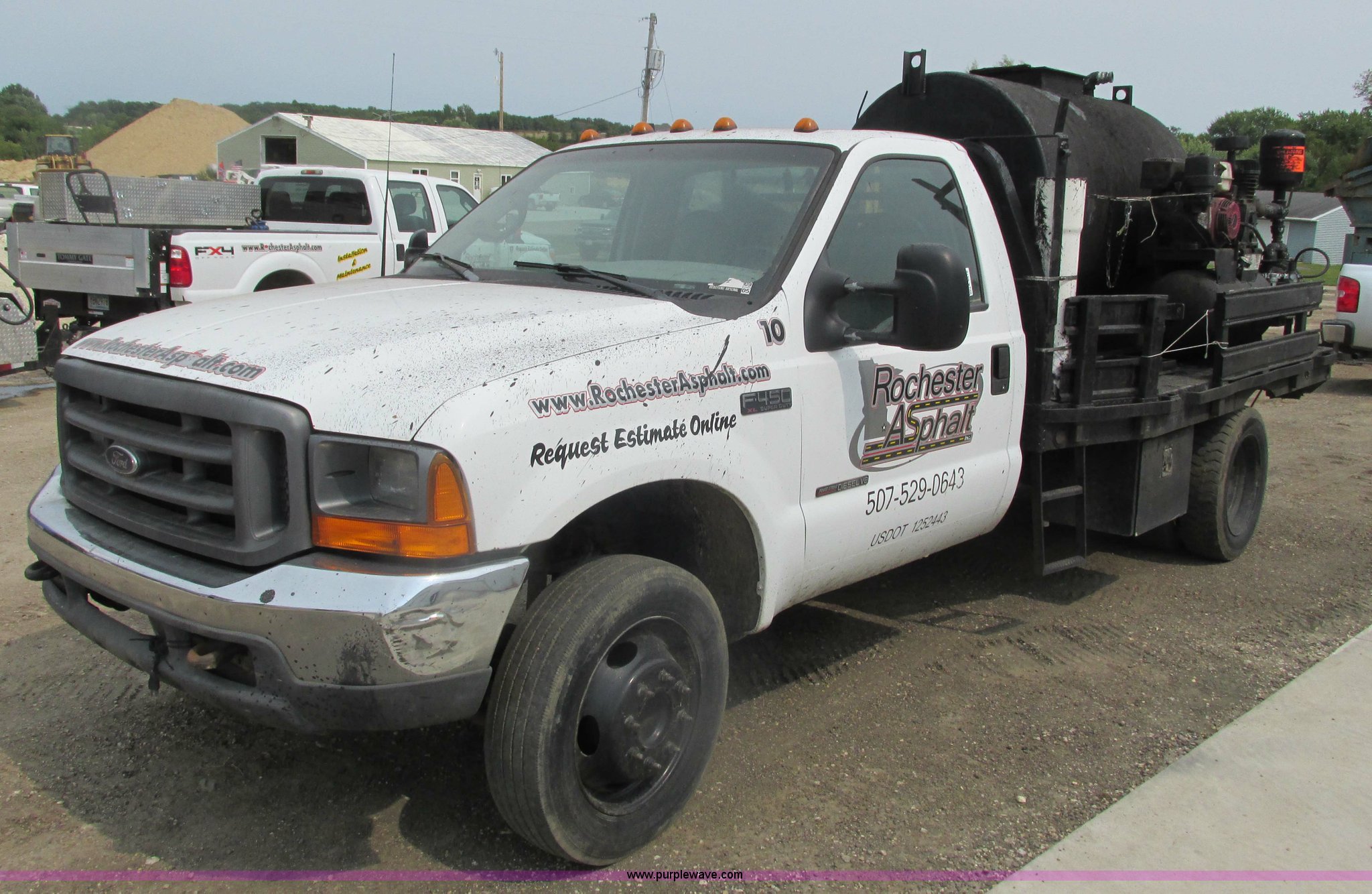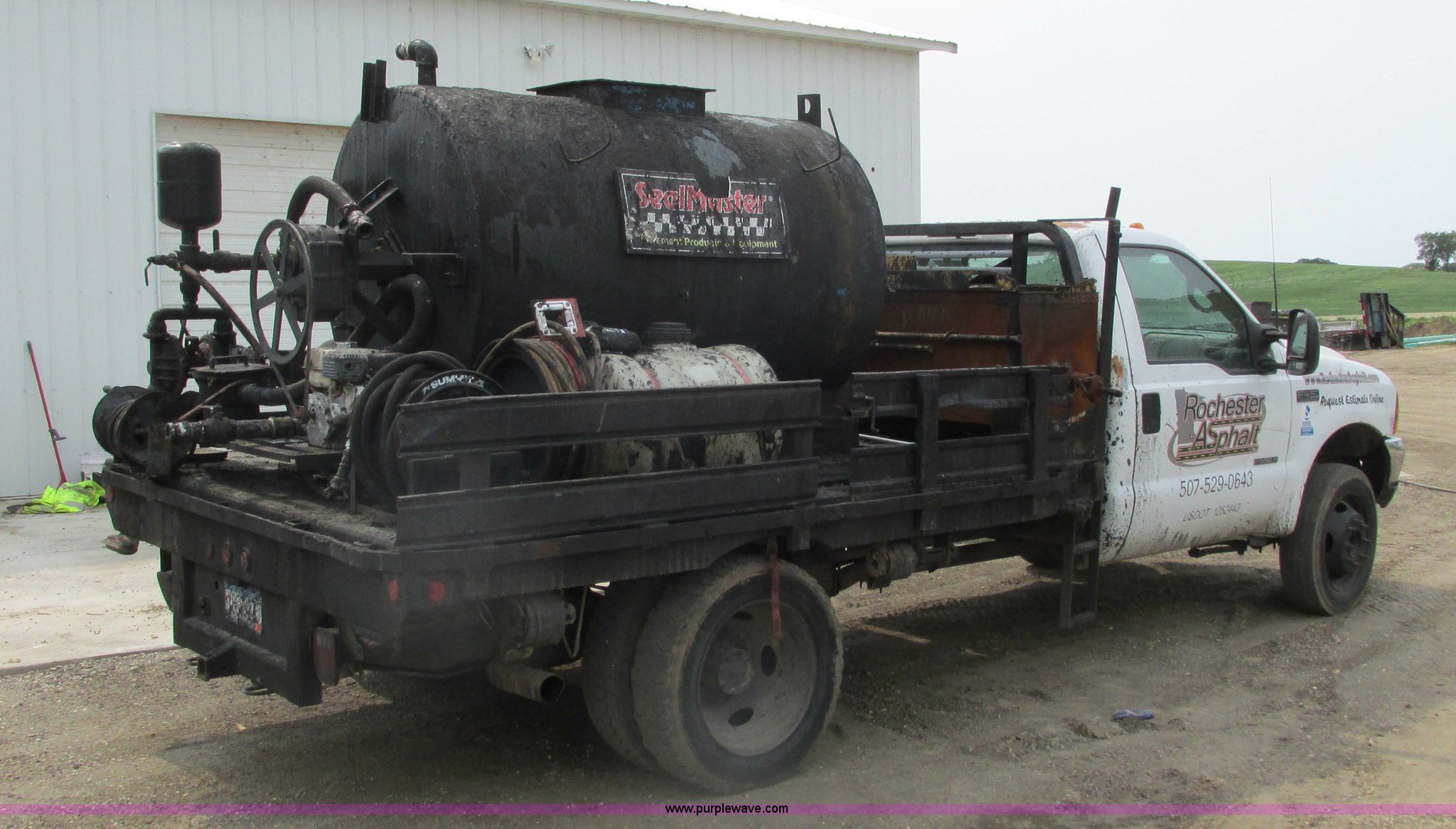 2000 Ford F450 Super Duty flatbed truck. 236,428 miles on odometer, 7.3L V8 OHV 16V turbo diesel engine, Automatic transmission, AC and heat AC blows warm, AM/FM, Manual windows and locks, Vinyl interior, Seal Master seal coat system 500 gallon capacity, North Star air compressor Honda GX390 gas engine, Tar pot, Honda powered tank mixer, Hoses Hose reels, 30 gallon liquid tank, Heavy soiling from seal coat, Receiver hitch, Trailer wiring, 255/17R19.5 tires. 3FDXF46F2YMA17001. Rochester Asphalt. 2904 County Road 15 SW. Rochester, MN 55902
