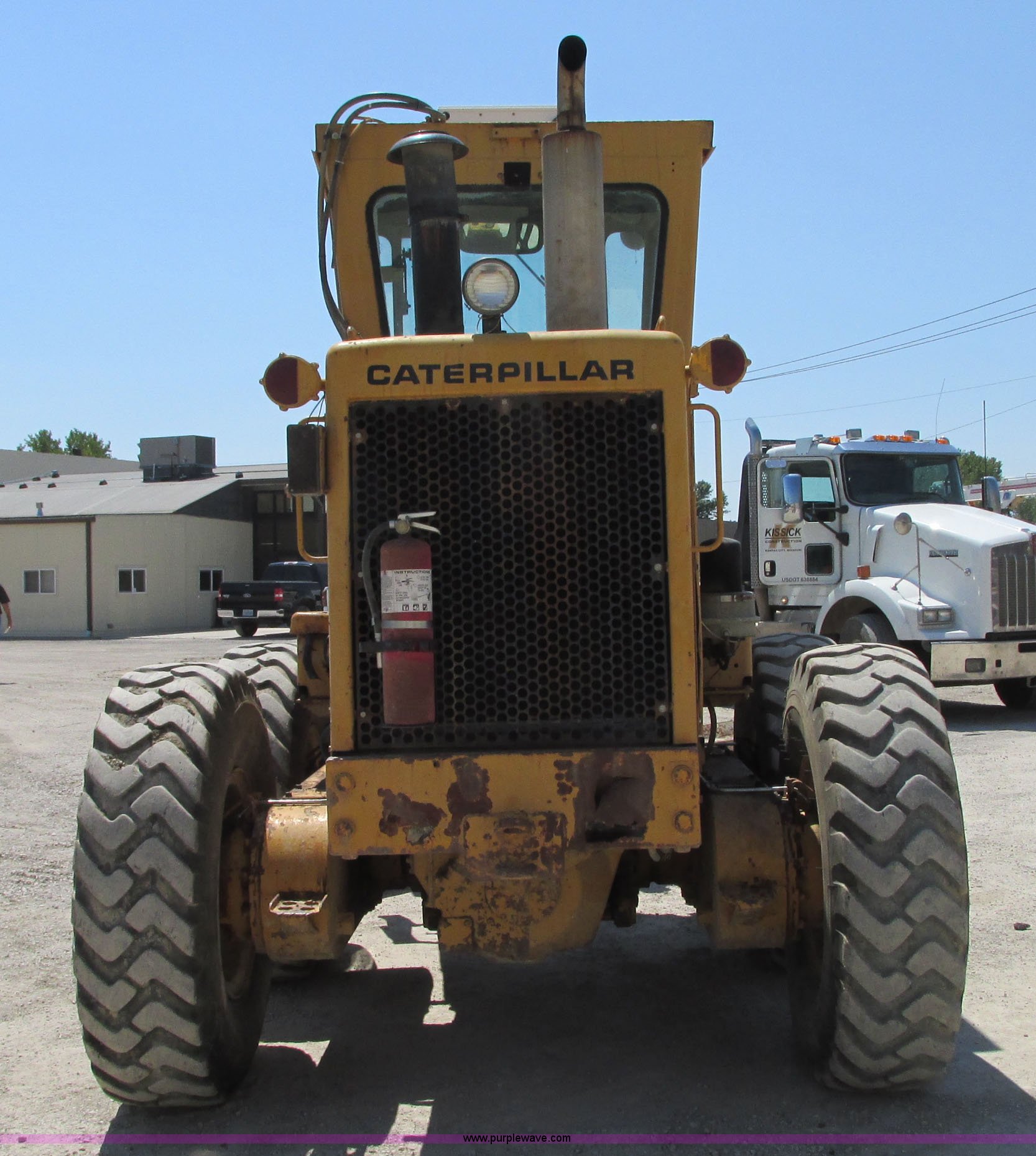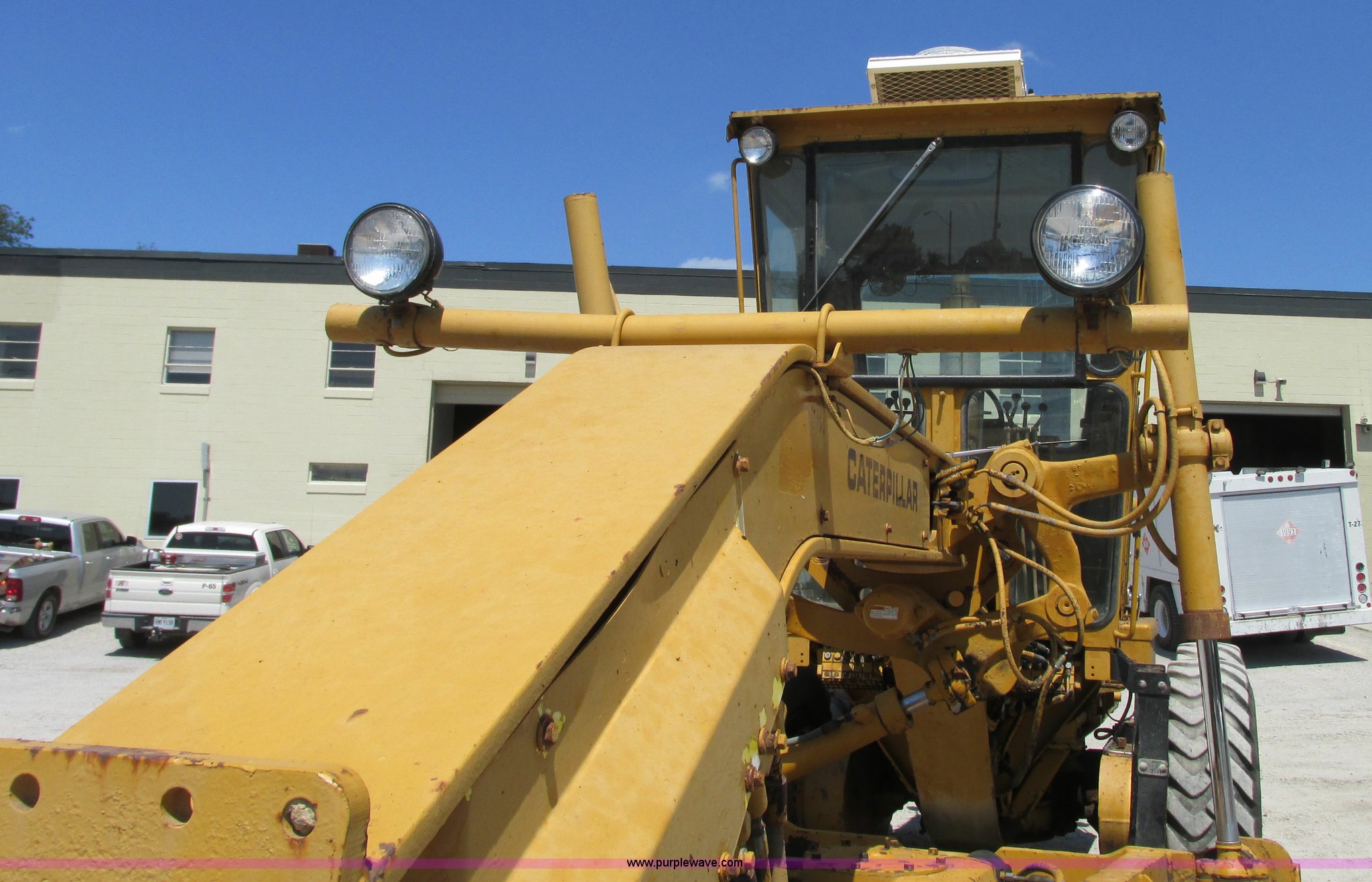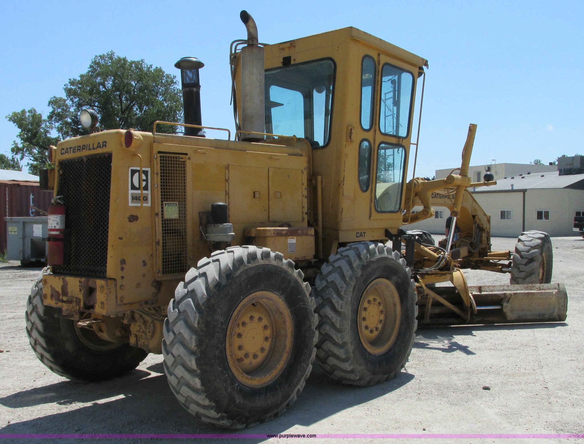 Purple Wave is selling a used Motor Grader in Missouri. This item is a 1979 Caterpillar 140G motor grader with the following: 2,931 hours on meter, Hour meter has been replaced, Caterpillar 3306 six cylinder diesel engine, 150 HP, Direct-drive transmission, Differential lock, Four wheel drive, Caterpillar enclosed cab, AC and heat, Front and rear work lights, Glow plugs, 14'W moldboard, Tip control, Side shift, (10) control valves, Front mounted lift group, 14.00-24 tires, 29,175 lbs. base operating weight, Oil in antifreeze, Air compressor replaced 2014, Turbo replaced, Serial 81V00933