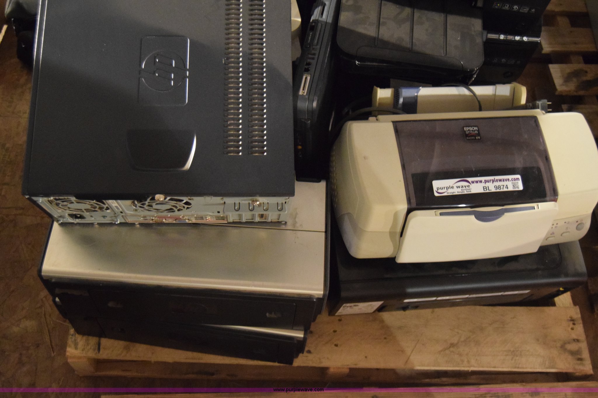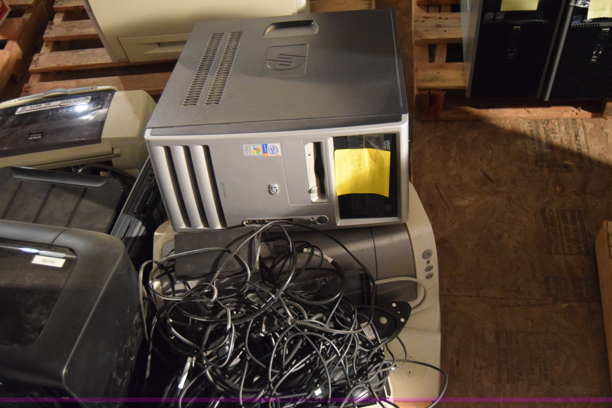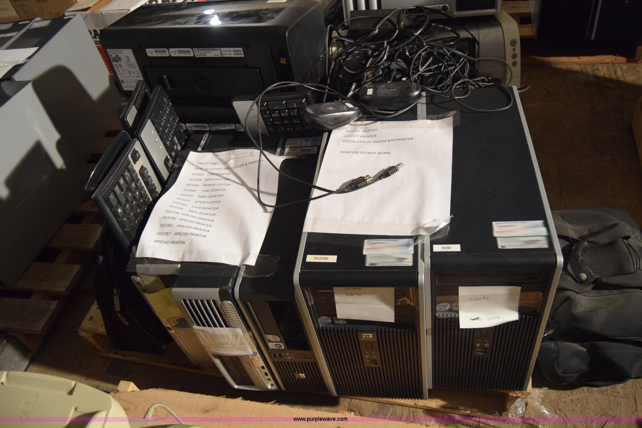 Purple Wave is selling a used Computers in Kansas. This item is a Assorted computers and printers with the following: HP NX9600 CPU, Hard drives have been reformatted and no operating system installed, HP DC5100 CPU, Hard drives have been reformatted and no operating system installed, HP DC7700SFF CPU, Hard drives have been reformatted and no operating system installed, (2) HP DC5800 CPU, Hard drives have been reformatted and no operating system installed, HP DC5800SFF CPU, Hard drives have been reformatted and no operating system installed, (2) laptops, Hard drives have been reformatted and no operating system installed, (4) printers, Non-operational units, Unknown operating condition, KDOT ID 053463, 053598, 053466, 916547, 053368, 053594, 053794, 053790, 053783, 053787, 053623, 053344