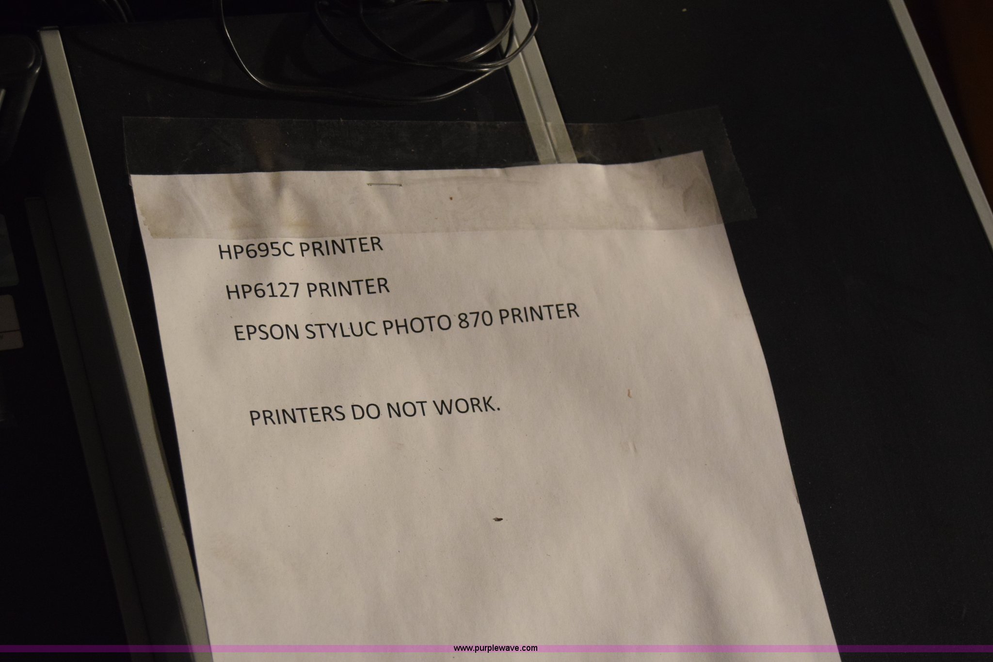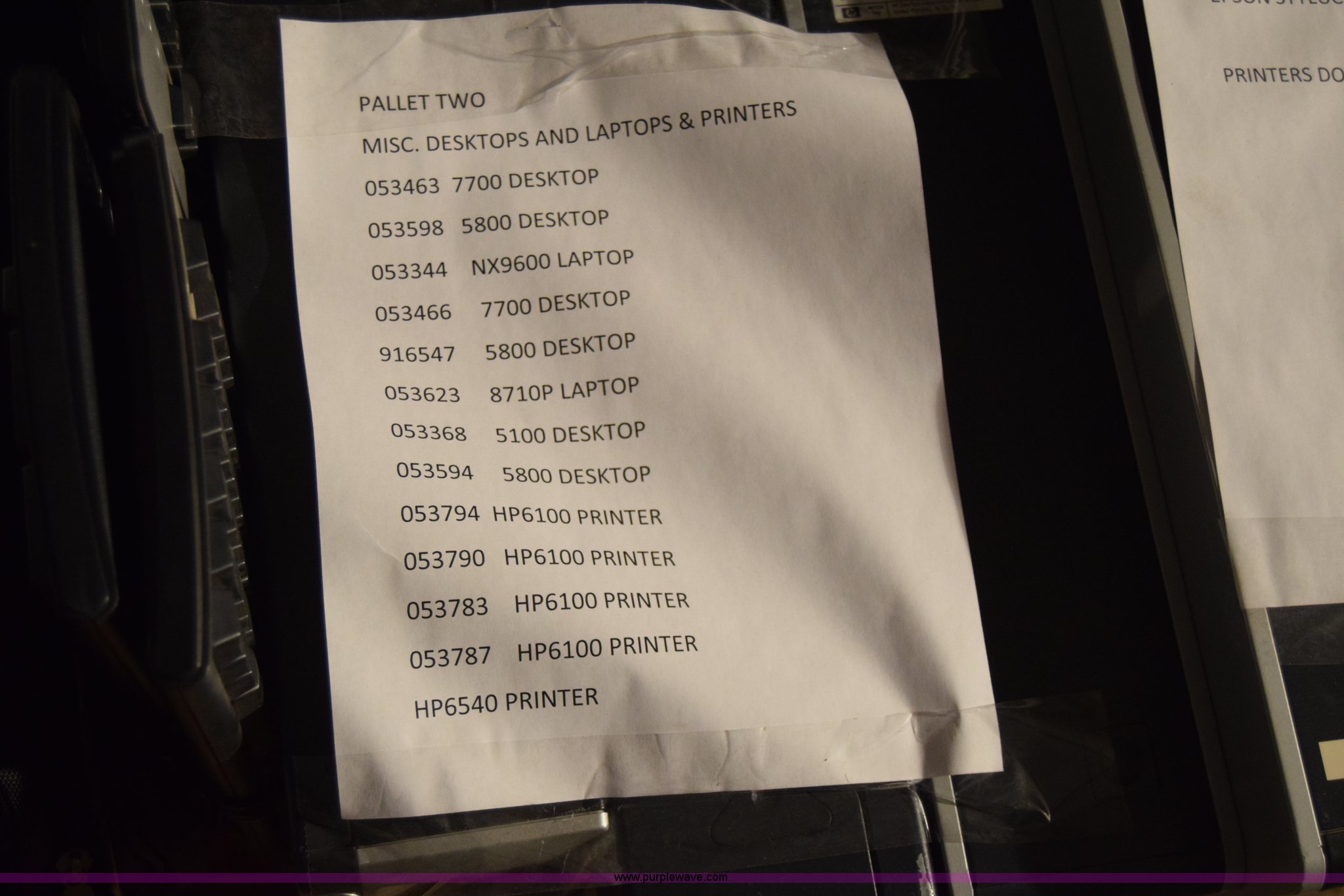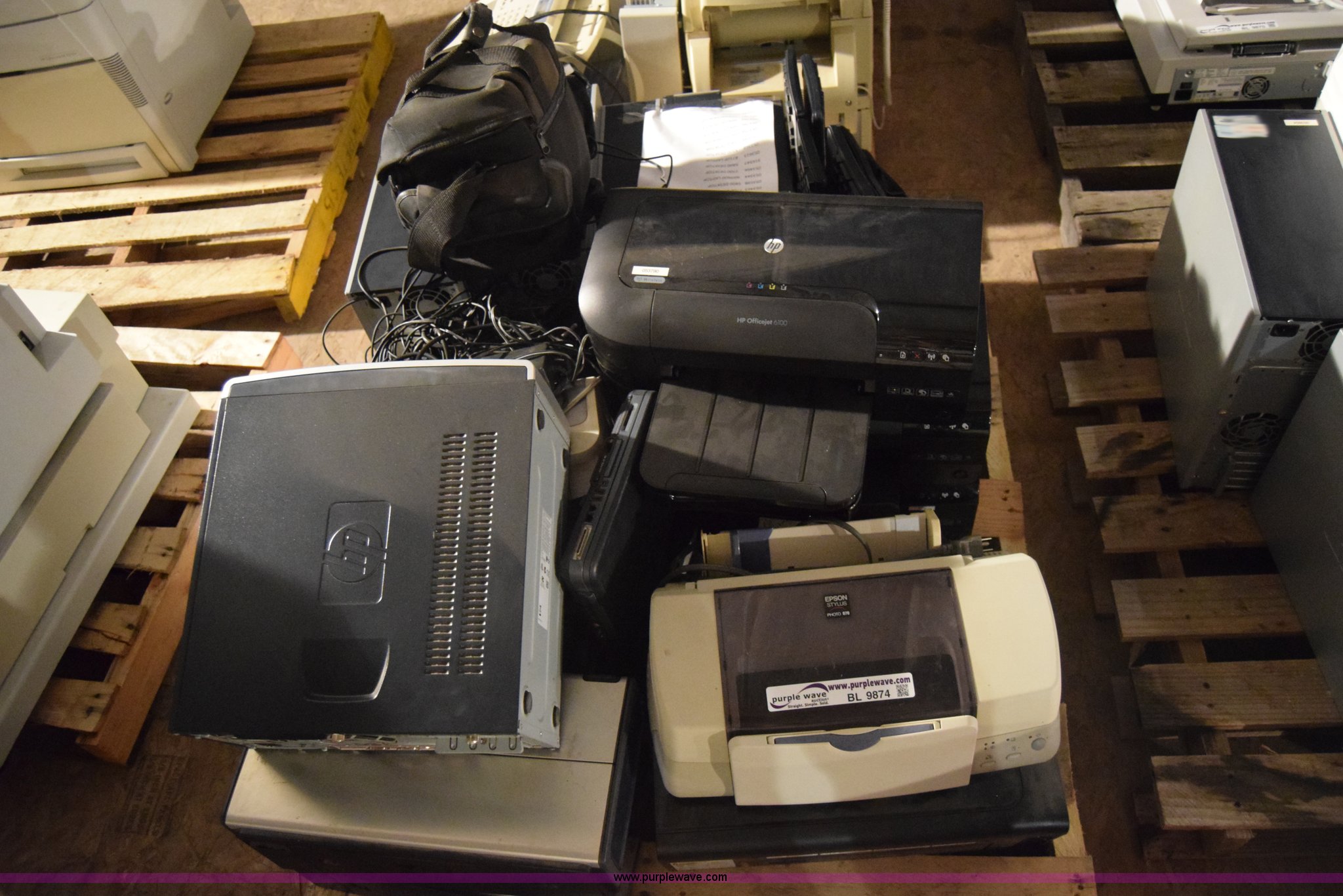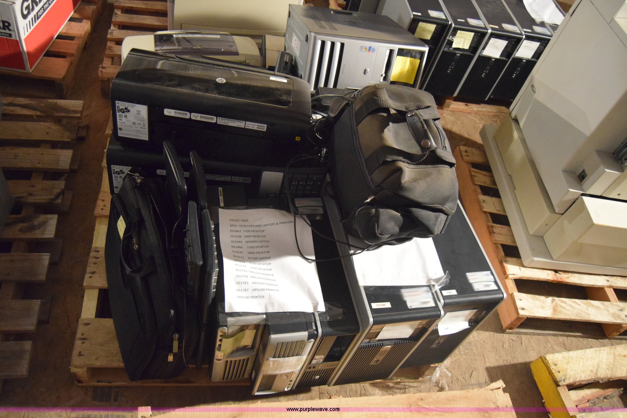 Purple Wave is selling a used Computers in Kansas. This item is a Assorted computers and printers with the following: HP NX9600 CPU, Hard drives have been reformatted and no operating system installed, HP DC5100 CPU, Hard drives have been reformatted and no operating system installed, HP DC7700SFF CPU, Hard drives have been reformatted and no operating system installed, (2) HP DC5800 CPU, Hard drives have been reformatted and no operating system installed, HP DC5800SFF CPU, Hard drives have been reformatted and no operating system installed, (2) laptops, Hard drives have been reformatted and no operating system installed, (4) printers, Non-operational units, Unknown operating condition, KDOT ID 053463, 053598, 053466, 916547, 053368, 053594, 053794, 053790, 053783, 053787, 053623, 053344