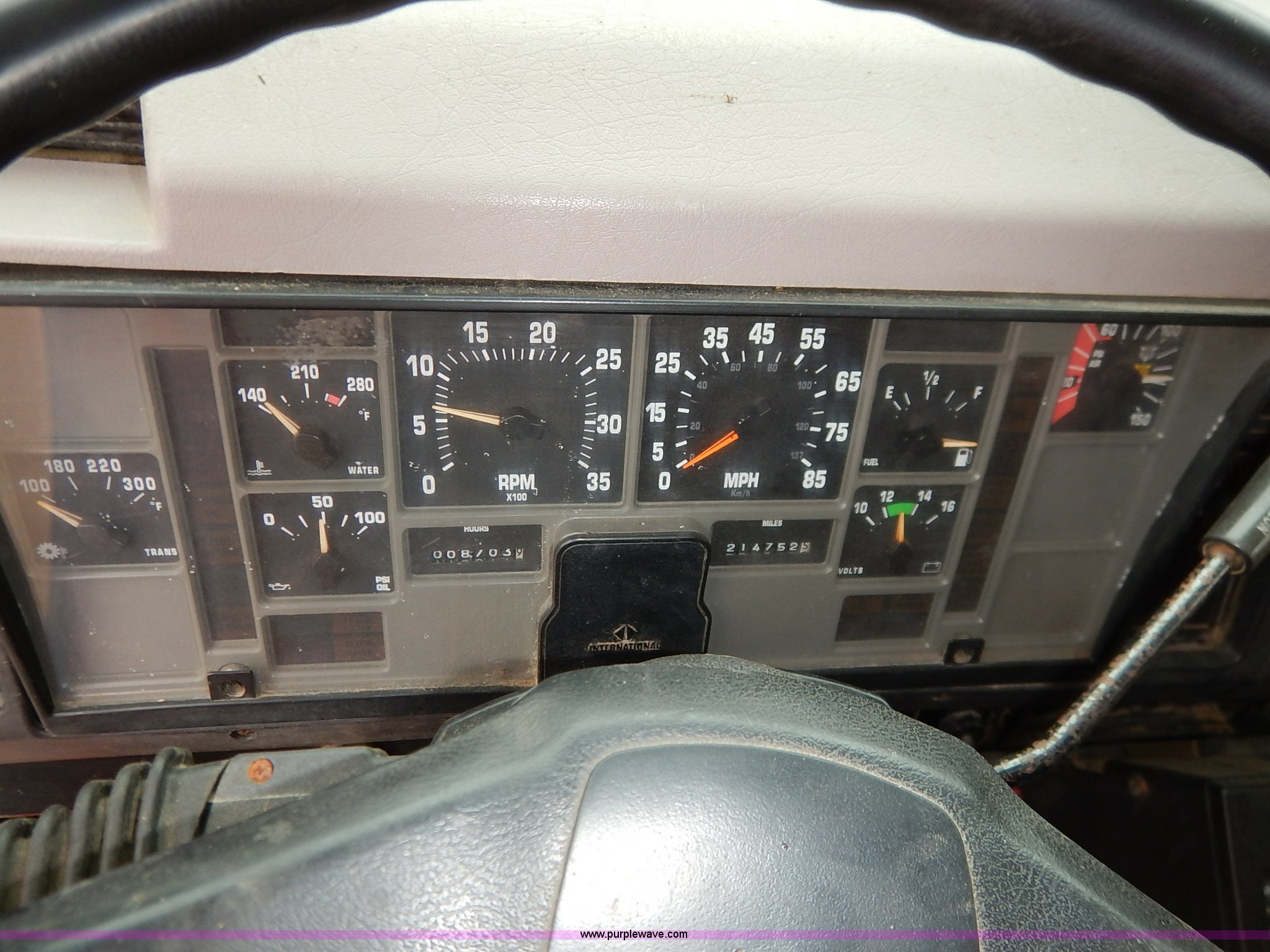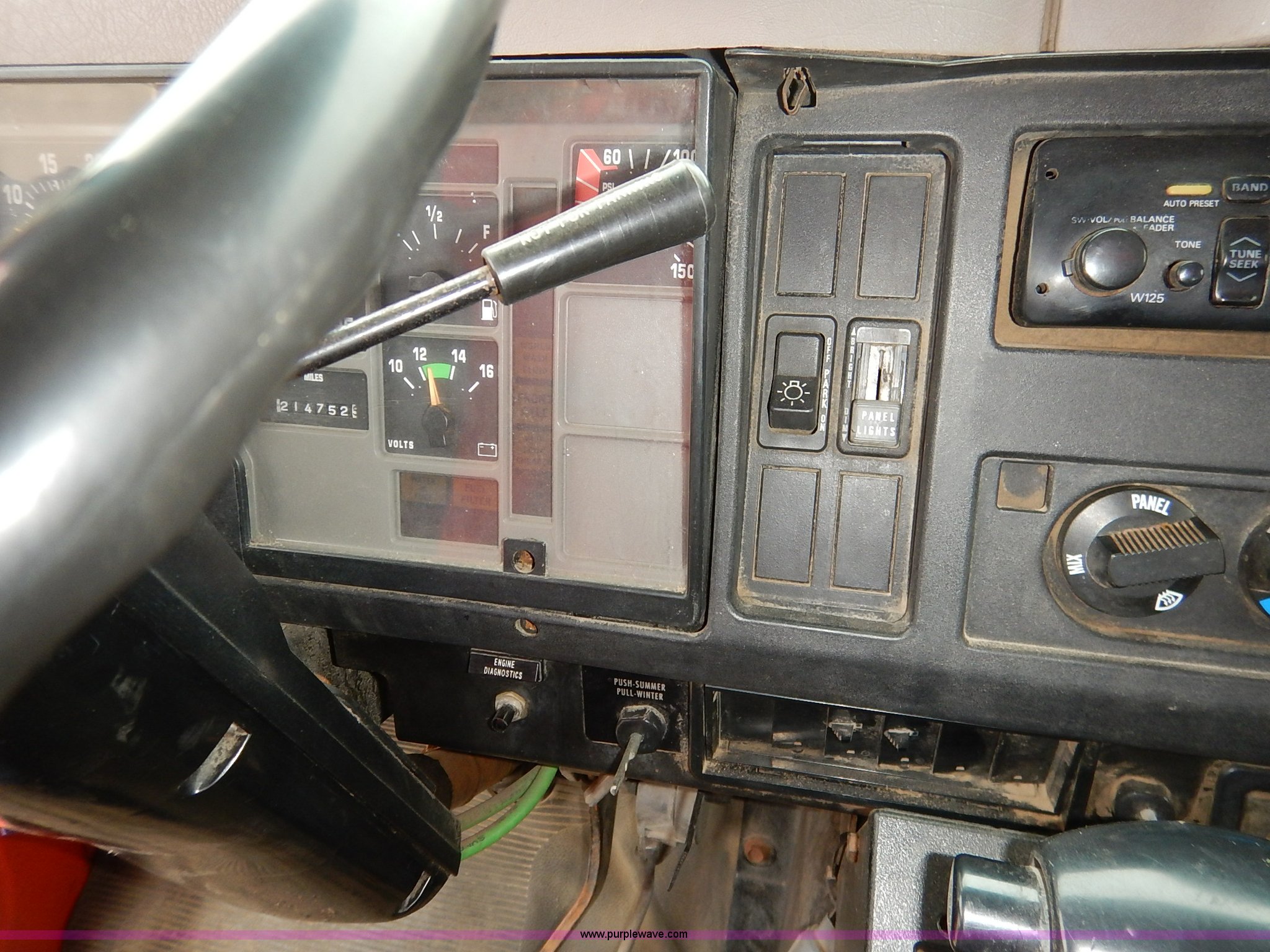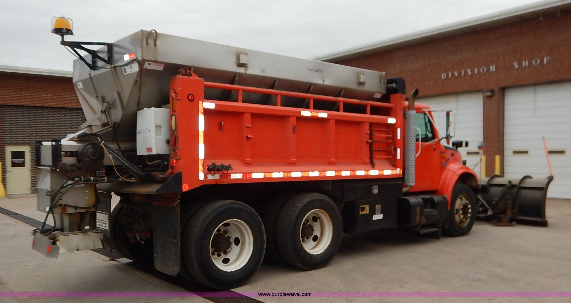 Purple Wave is selling a used Construction Dump Truck in Kansas. This item is a 1999 International 4900 dump truck with the following: 214,752 miles on odometer, 8,703 hours on meter, International DT530 8.7L L6 diesel engine, Allison MD3060 automatic transmission, Inter-axle differential lock, Tandem axle, Heat, AM/FM, Heated mirrors, Block heater, Front mounted PTO, 13'L x 8'W steel dump bed, Roll-over tarp, Toolboxes, Reversible snow plow, 11'W, Warren V-box stainless steel spreader, Nine cubic yard capacity, Gresen spreader control, 200 gallon pre-wet tanks, Pintle hitch, Trailer wiring, 15' wheelbase, Spring suspension, Air brakes, 295/75R22.5 front tires, Strobe lights will be removed prior to auction, Dents and scratches, Paint faded, Seats damaged, KDOT ID 264-6059