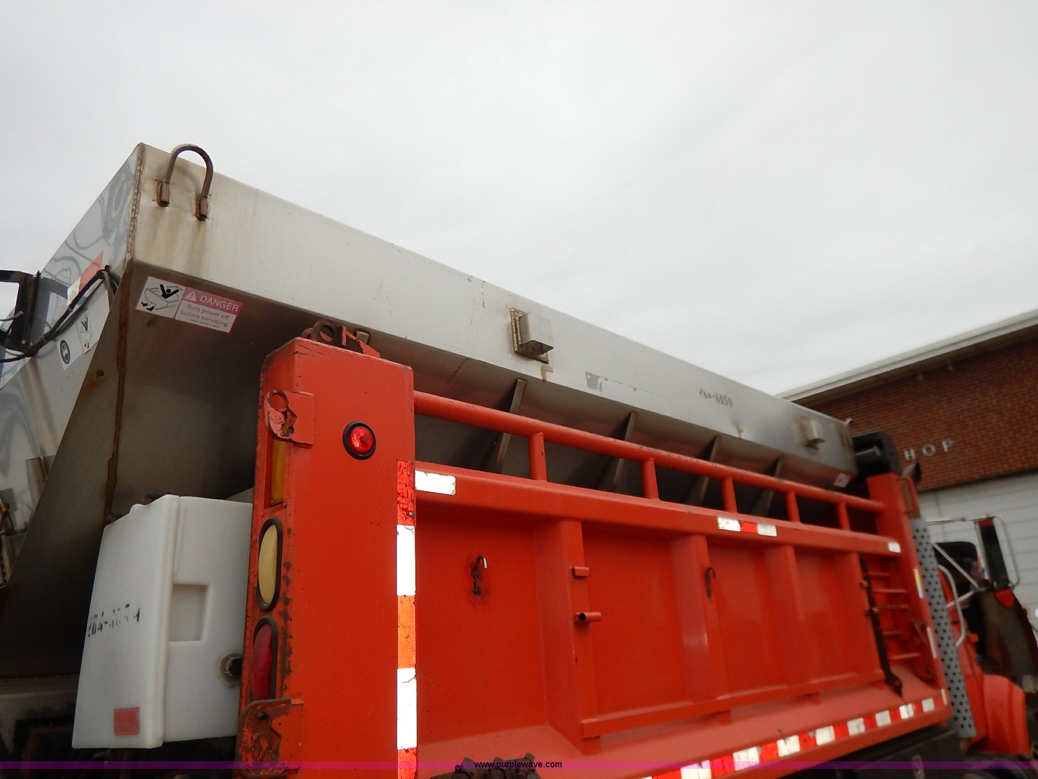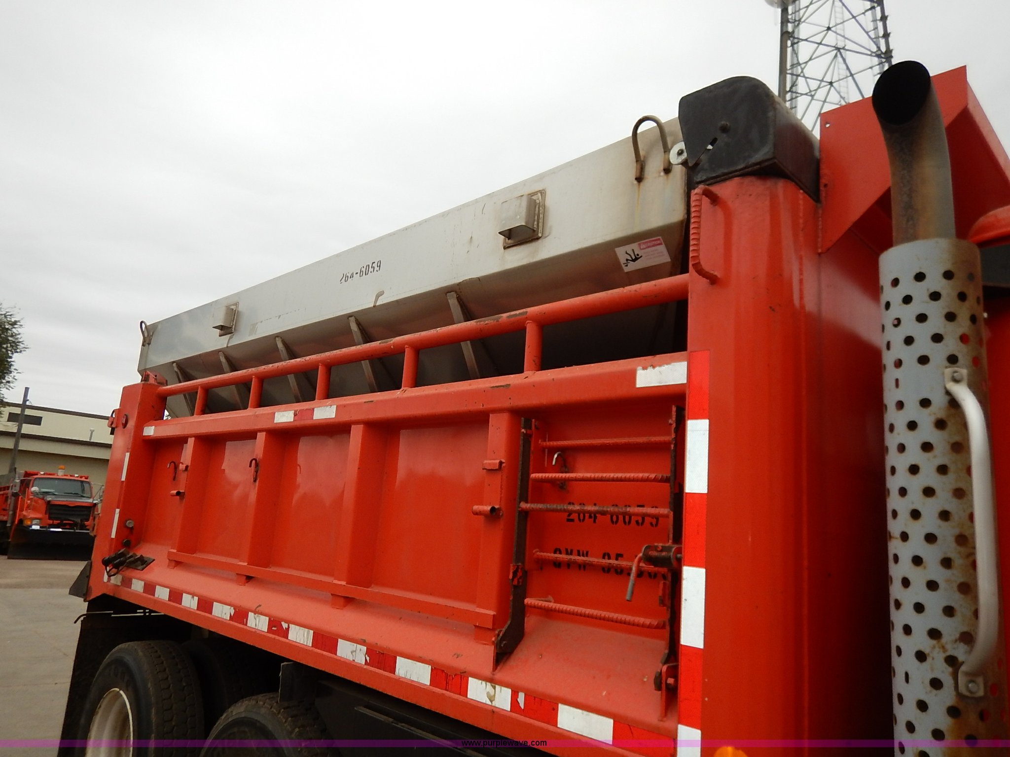 1999 International 4900 dump truck. 214,752 miles on odometer, 8,703 hours on meter, International DT530 8.7L L6 diesel engine, Allison MD3060 automatic transmission, Inter-axle differential lock, Tandem axle, Heat, AM/FM, Heated mirrors, Block heater, Front mounted PTO, 13'L x 8'W steel dump bed Roll-over tarp, Toolboxes, Reversible snow plow 11'W, Warren V-box stainless steel spreader Nine cubic yard capacity, Gresen spreader control, 200 gallon pre-wet tanks, Pintle hitch, Trailer wiring, 15' wheelbase, Spring suspension, Air brakes, 295/75R22.5 front tires, Strobe lights will be removed prior to auction, Dents and scratches, Paint faded, Seats damaged, KDOT ID 264-6059. Titles will be distributed after confirmation of payment and removal. 1HTSHADR6XH678945. View equipment video. Kansas Department of Transportation - Garden City. 121 N. Campus Drive. Garden City, KS 67846